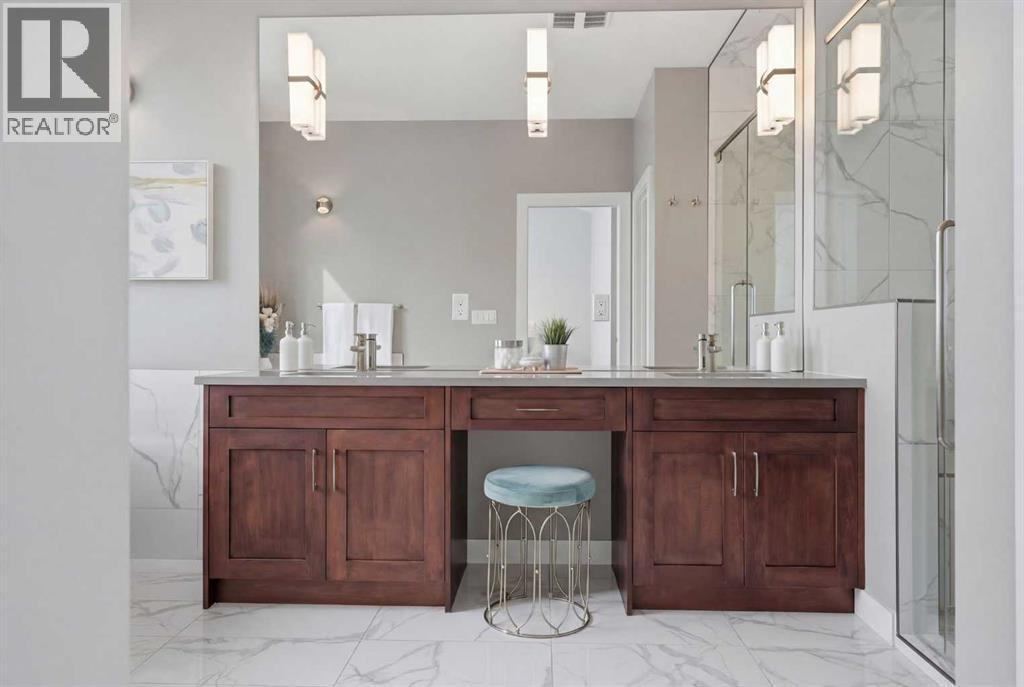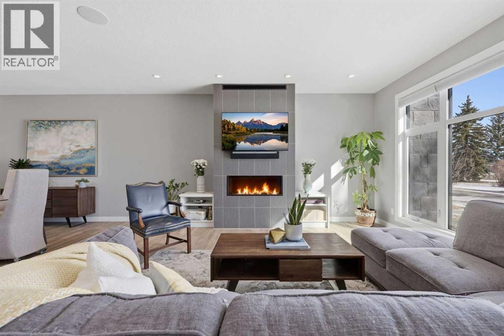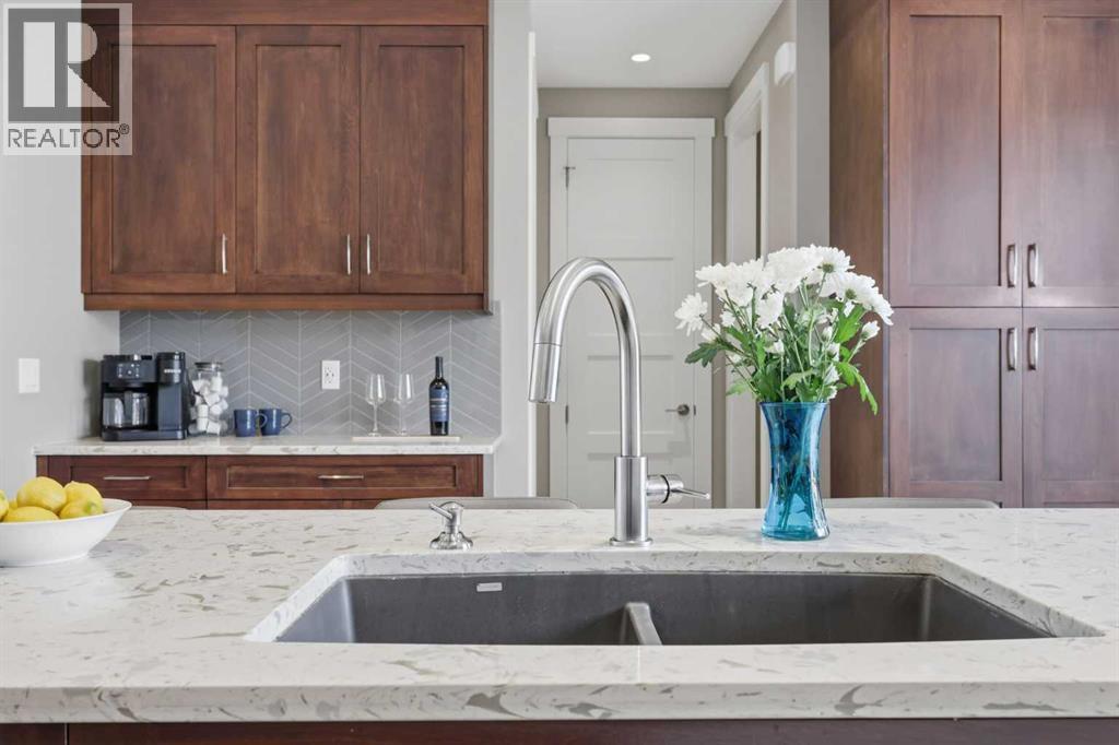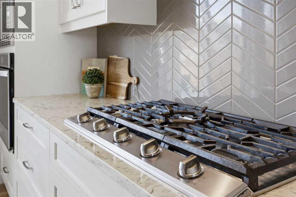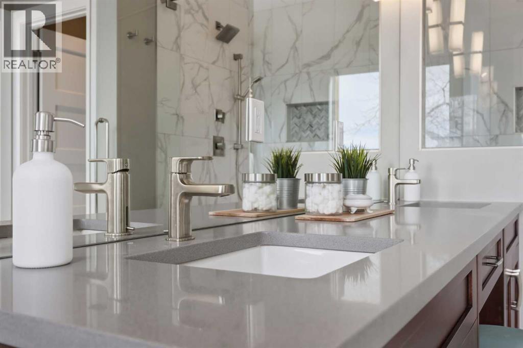 Discover this stunning, highly upgraded designer semi-detached infill offering over 3,250 sq ft of finely crafted living space in the vibrant community of Winston Heights. Featuring 5 bedrooms, 3.5 bathrooms, and a fully developed legal 2-bedroom basement suite with private entrance. Welcome to a bright, open main floor with soaring 9' ceilings, 8' doors, and rich wide-plank hardwood flooring. The living room centres around a dramatic gas fireplace clad in floor-to-ceiling textured grey stone tile, flanked by custom built-in cabinetry and oversized windows that frame direct park views. A dedicated main floor office offers the perfect work-from-home setup, while the spacious dining area flows into the show-stopping kitchen. Finished in a striking two-tone palette of crisp white full-height cabinetry paired with warm walnut lowers and a matching floor-to-ceiling built-in pantry, the kitchen features a glossy chevron herringbone backsplash, 5-burner gas cooktop, chimney hood fan, built-in wall oven and microwave, and a dedicated coffee and beverage station. The oversized quartz island with undermount black Blanco double sink seats four. A mudroom with built-in storage and stylish powder room complete the main level. Upstairs, the primary bedroom impresses with vaulted ceilings, a walk-in closet, treetop views, and a private balcony. The spa-inspired ensuite features a standalone soaker tub, glass-enclosed shower with built-in niche, dual-sink walnut vanity, brushed-nickel fixtures, sconce lighting, and Calacatta marble-look tile. Two additional bedrooms, a modern 4-piece bath, and a laundry room with side-by-side machines, upper cabinetry, and sink complete the upper level. Additional highlights include central air conditioning, a private west-facing backyard with wood deck, full fencing, and a double detached heated garage. The durable stucco exterior reflects the quality craftsmanship found throughout. The fully developed legal 2-bedroom lower suite (Suite #6959) off ers exceptional flexibility with its own private entrance, contemporary kitchen, full appliance package, spacious living area, 4-piece bath, and separate laundry. Residents of Winston Heights enjoy highly rated schools, a recreation and aquatic centre, golf, tennis, off-leash parks, scenic pathways, quick access to 16 Ave and Deerfoot, and downtown Calgary just minutes away. (id:51989)