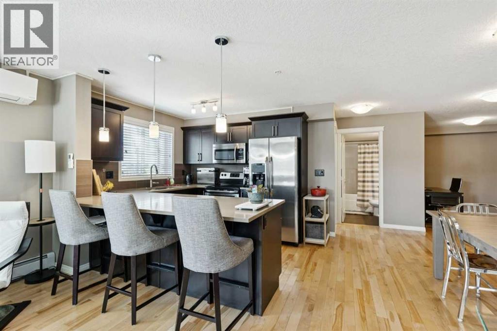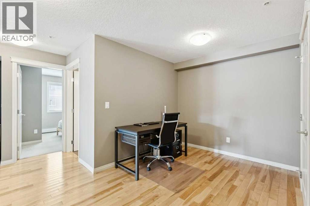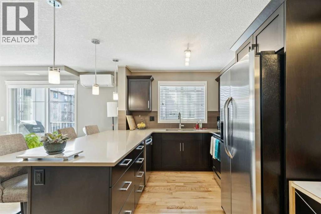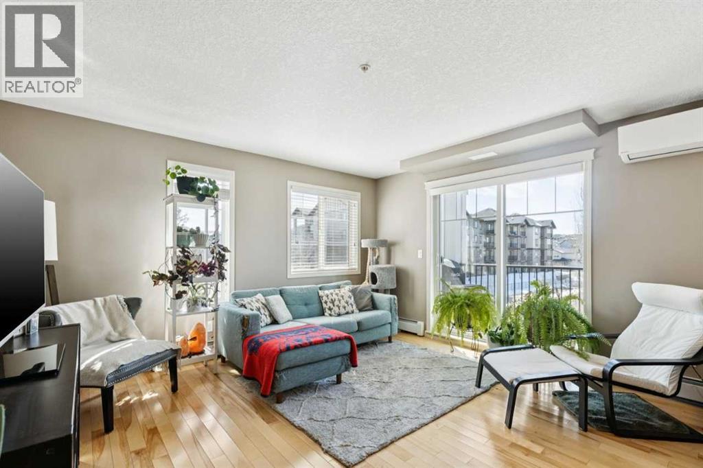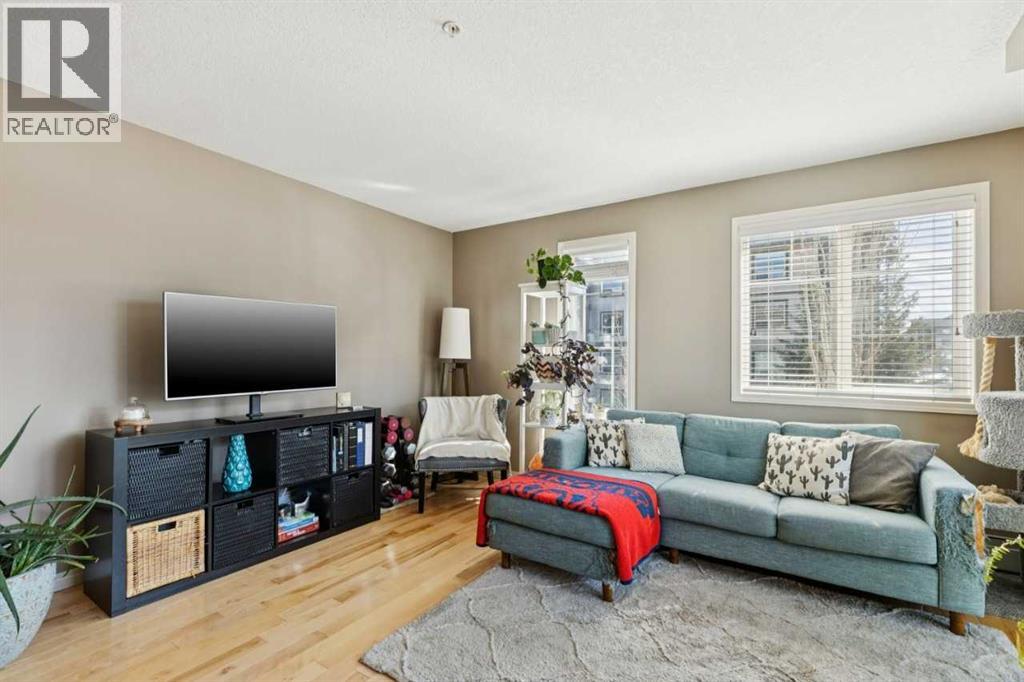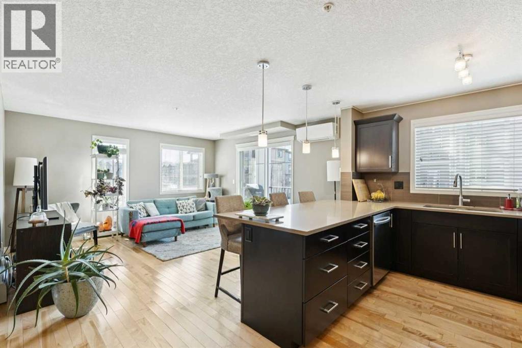 The perfect blend of modern comfort and pristine maintenance, this bright and spacious third-floor corner unit is original owner occupied. The open-concept layout features rich hardwood floors and has been freshly painted, creating a vibrant, move-in-ready atmosphere. The kitchen boasts elegant Caesarstone counters, sleek stainless steel appliances, and ample cabinetry. Whether you are working from home or need extra hobby space, the versatile den complements the two generous bedrooms and two bathrooms. Enjoy the plush feel of brand-new carpet in both bedrooms and the year-round comfort of air conditioning. A dedicated laundry space with shelving, boasts recently updated machines (2024). Step out onto your private balcony, complete with a natural gas hookup—perfect for summer BBQs, and overlooking garden space. Two titled parking stalls, and private, assigned storage round out this amazing condo that is close to schools and shopping. (id:51989)