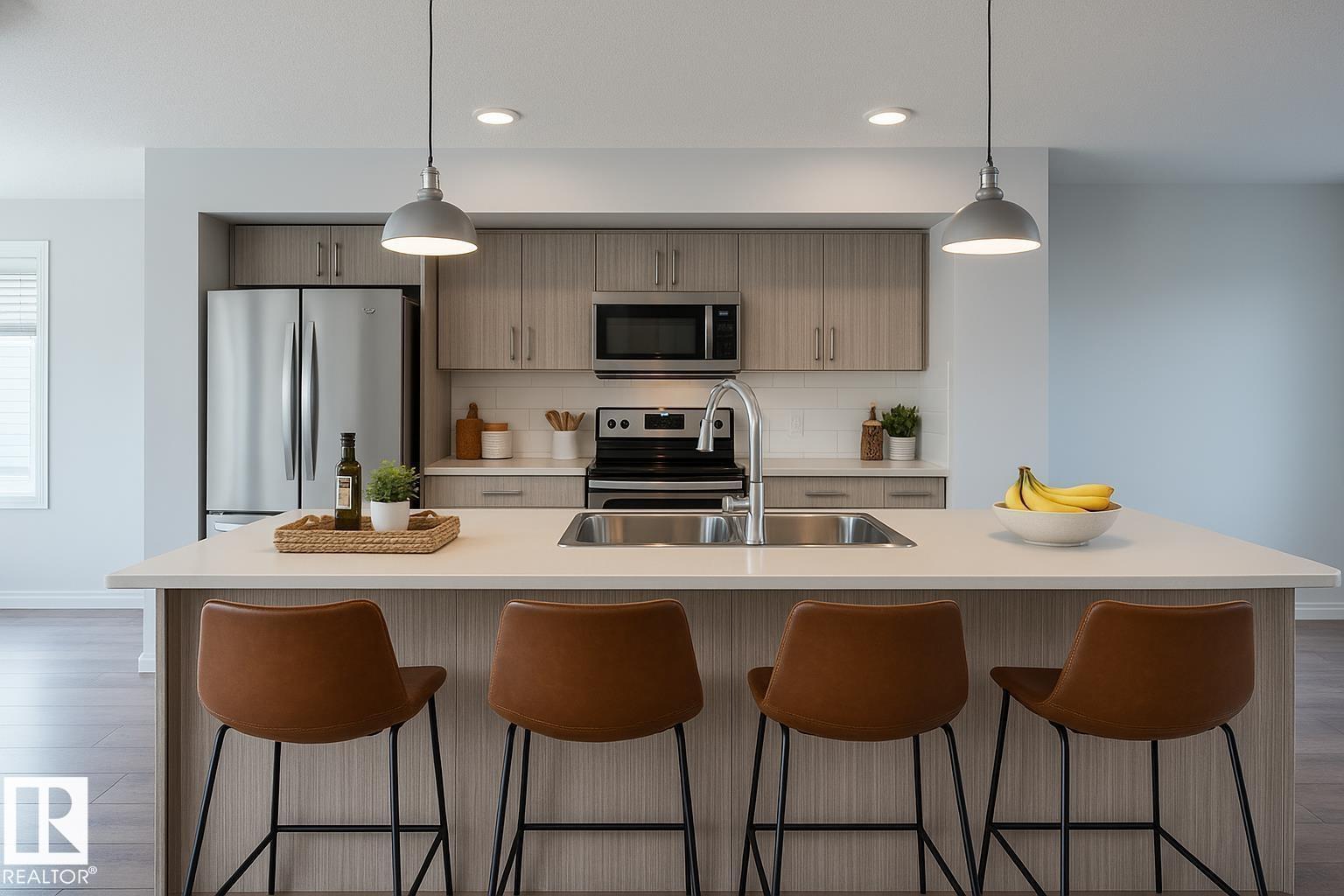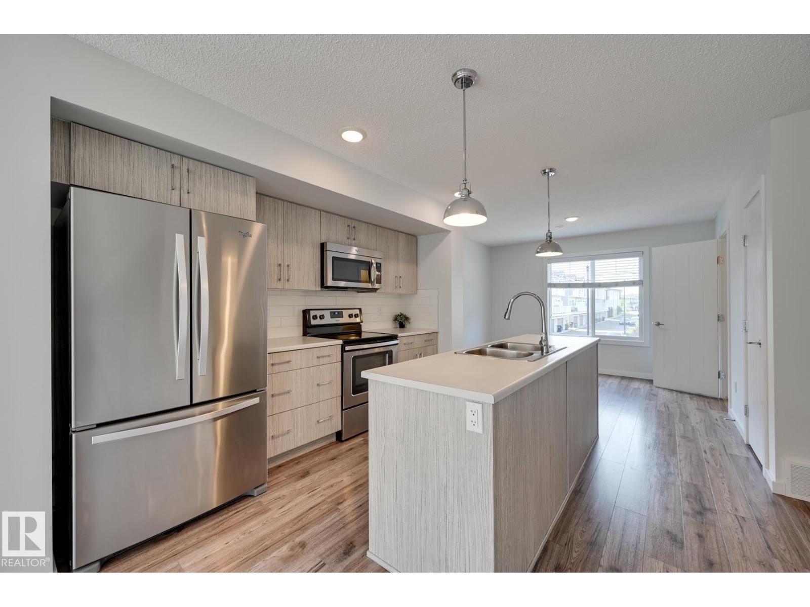 Welcome to this lovely townhouse in Laurel Landing! This is a perfect property for first-time home buyers & investors. This 2 bedroom/2.5 bath townhome is an END UNIT and boasts an open concept layout, ample natural light, & wide-plank flooring throughout the main level. The kitchen is spacious w/ stainless steel appliances, pantry, full height cabinetry, subway tile backsplash & large island. The upper level offers 2 bedrms and full bathroom. Primary bedroom includes a 4-pc ensuite bathroom with dual sinks. Single attached garage for convenience and security. Higher energy efficiency w/tankless hot water & heat recapture for a lower utility bill. This well maintained complex offers visitor parking & is walking distance to tons of amenities. Located close to shopping, a community playground, community league, newer rec centre, schools & public transit. (id:51989)