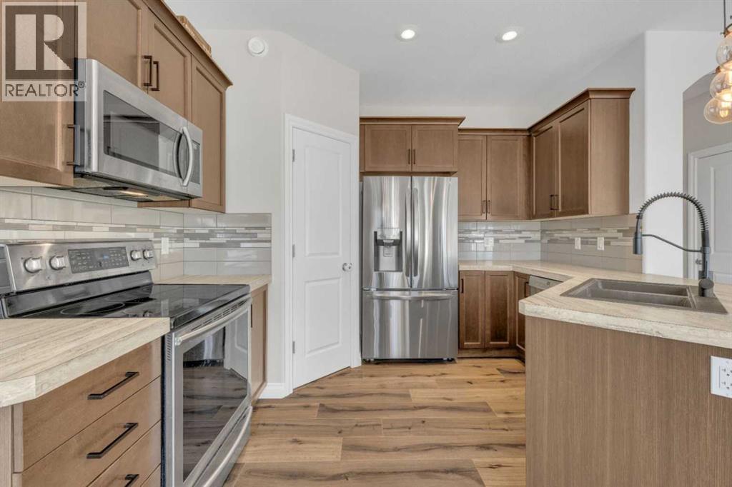 Click brochure link for more details** Welcome to this beautiful 2-storey home in a sought-after family neighbourhood, offering rare privacy with no neighbours behind you backing onto an expansive green space with walking and biking trails connecting to multiple parks close by. The open-concept main floor is bright and inviting, featuring large windows, 9’ ceilings, and a functional layout perfect for everyday living and entertaining. The kitchen includes maple cabinetry, an extended eating bar, stainless steel appliances and a convenient walk-through pantry. The sunny dining area leads out to a 10’ x 14’ deck and a 16’ x 20’ patio perfect for outdoor living. Designed for both relaxing and entertaining there is plenty of space for outdoor furniture and features a storage shed. This south facing retreat enjoys sun from morning through evening, making it perfect for summer days. Upstairs you will find 3 bedrooms, including a comfortable primary retreat with a walk-in closet and private ensuite, plus the added convenience of upper-floor laundry. The basement features 9’ ceilings, a 50-gallon hot water tank and adds even more living space, with a 4th bedroom and family room. Additional features include central air conditioning for year-round comfort and a heated double attached garage, a huge bonus during Alberta winters. This home offers the perfect combination of space, comfort, location, close to schools, parks and all amenities, while backing onto nature for added privacy and lifestyle. (id:51989)