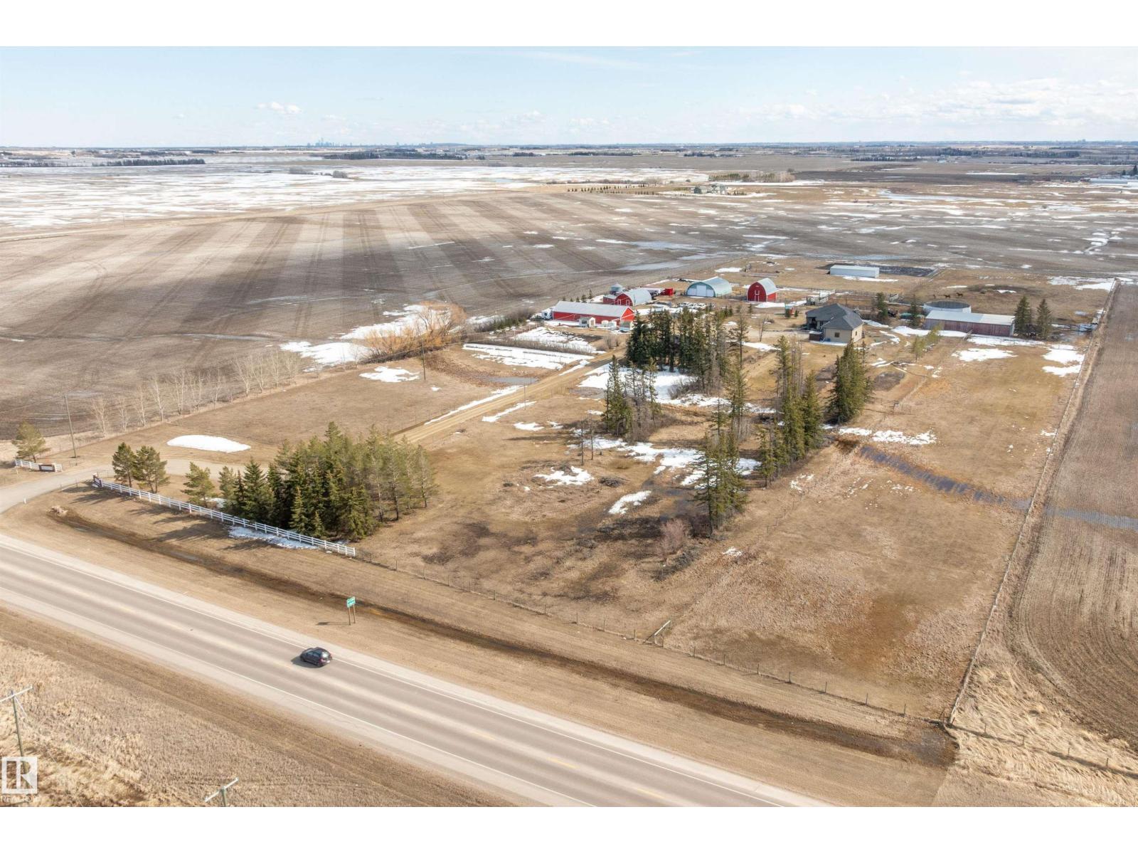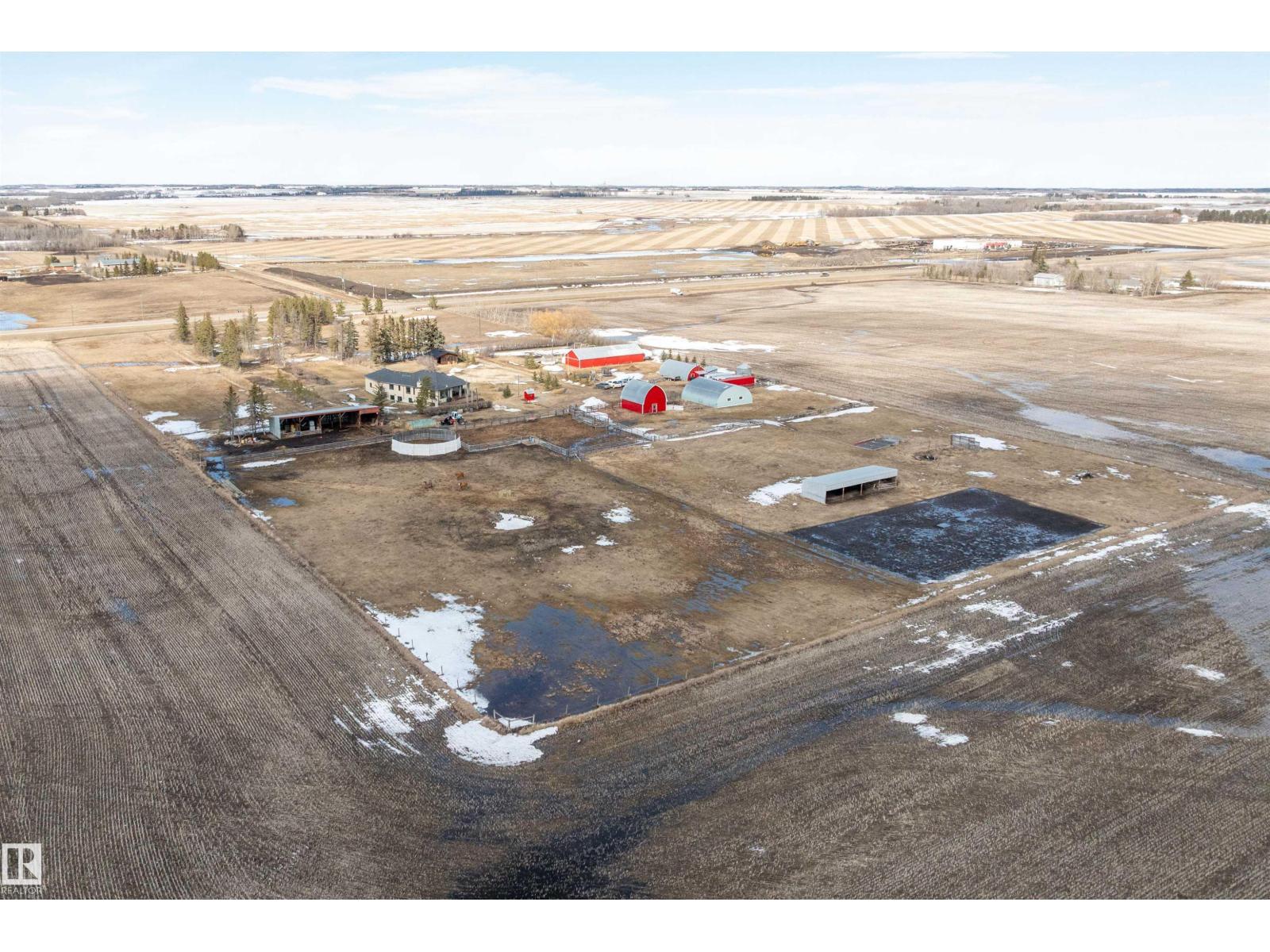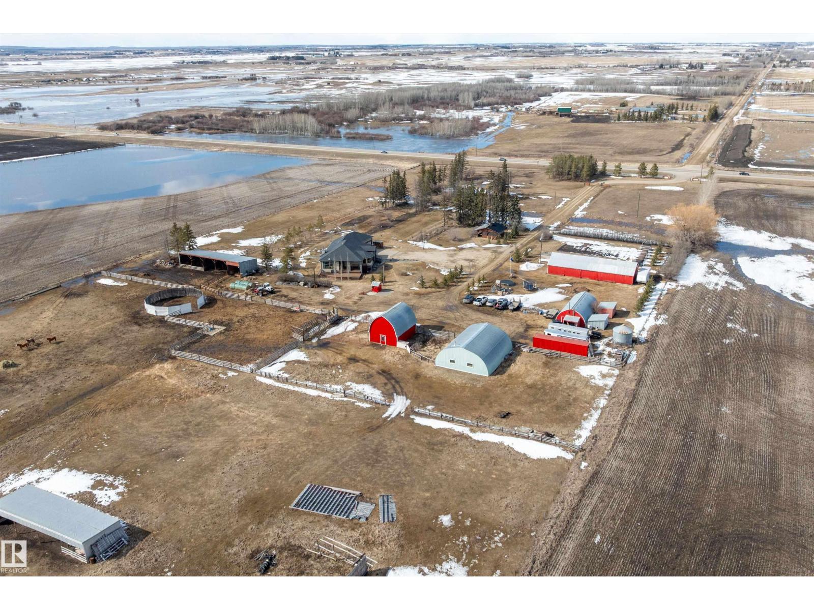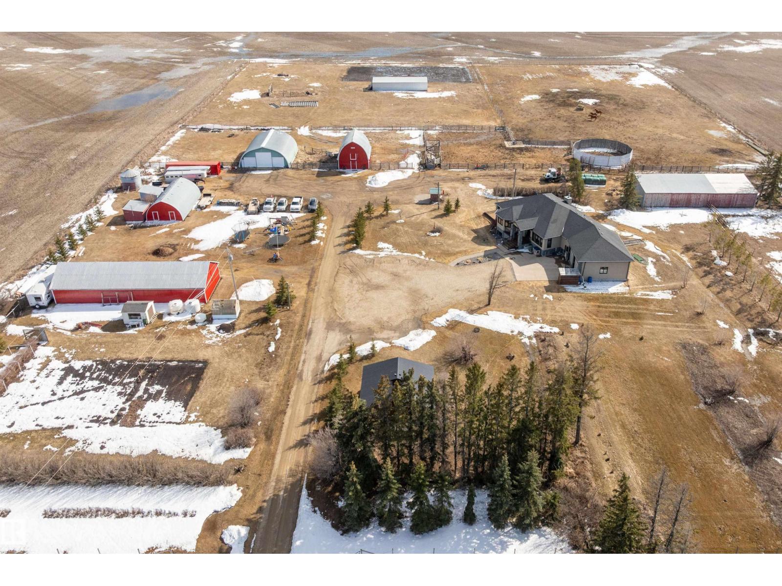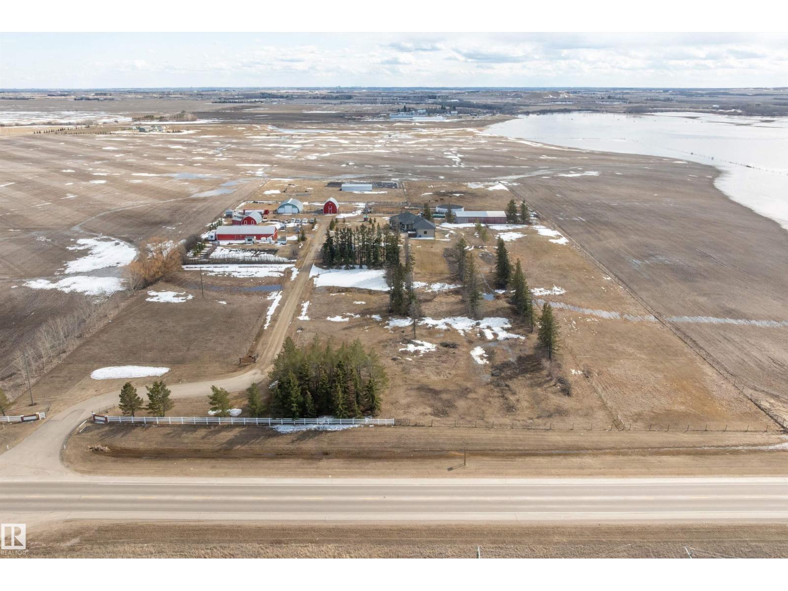 15 minute drive north of St Albert and fronting on Highway 37 you will discover this Executive Style Acreage / Hobby Farm living at its best. 2240 Sq Ft Bungalow custom built in 2011 open concept 4 bedrooms 3.5 bathrooms with a fully finished basement with in-floor heating. A 26ft by 38ft attached garage with in-floor heating. View this 14.21 acres of beautiful professionally landscaped yard with enclosed gazebo and very large wood burning fire pit. Formal farm site with 40ft by 46 ft heated shop, 26ft by 80 ft Barn and 24ft by 44ft storage building. All out buildings have metal roofs plus home is energy efficient with 10 inch wall construction. Fully set up for Livestock or also can be utilized for a small business operation with highway access to 37 and only 5 minutes to highway 44. (id:51989)