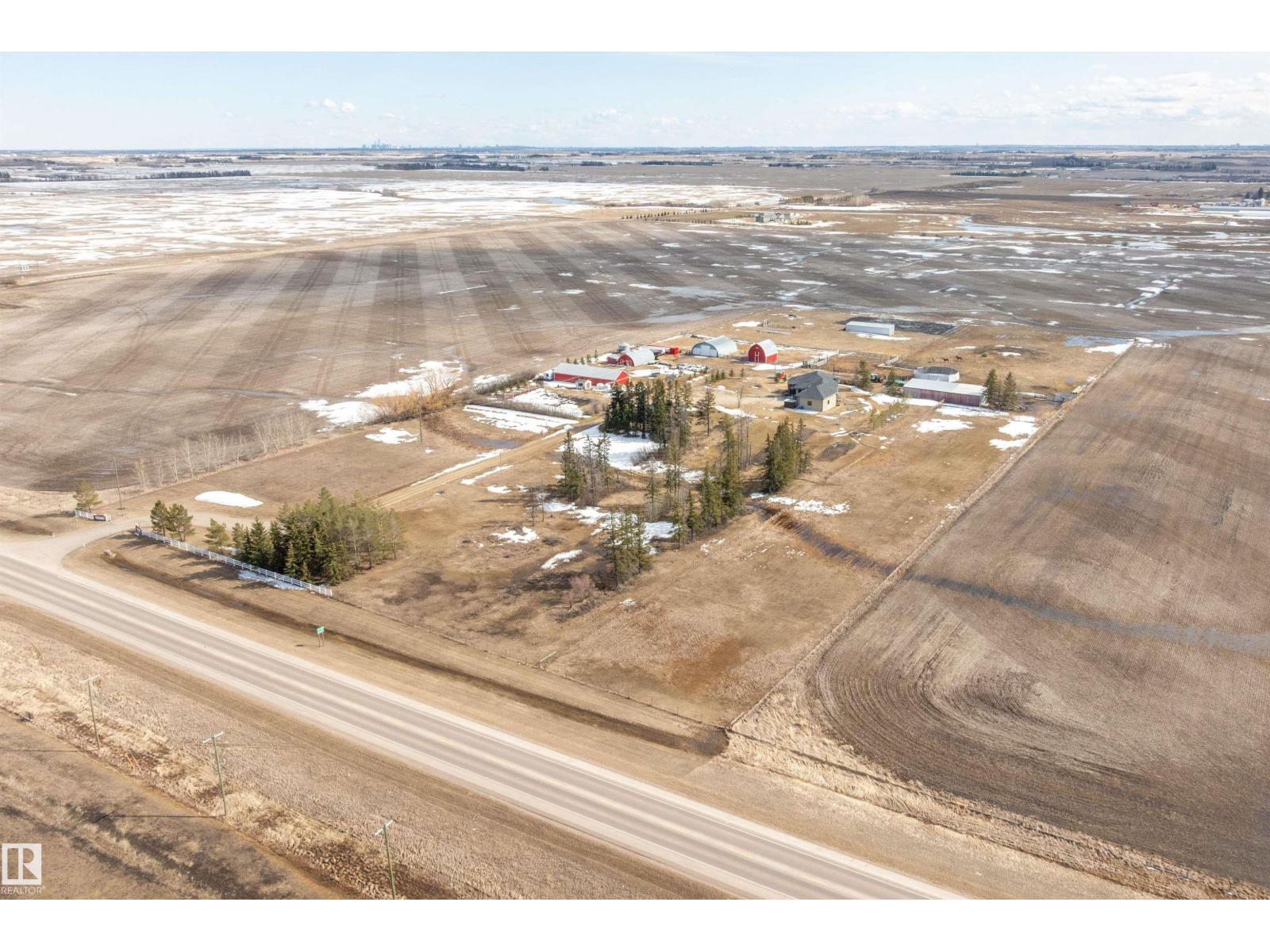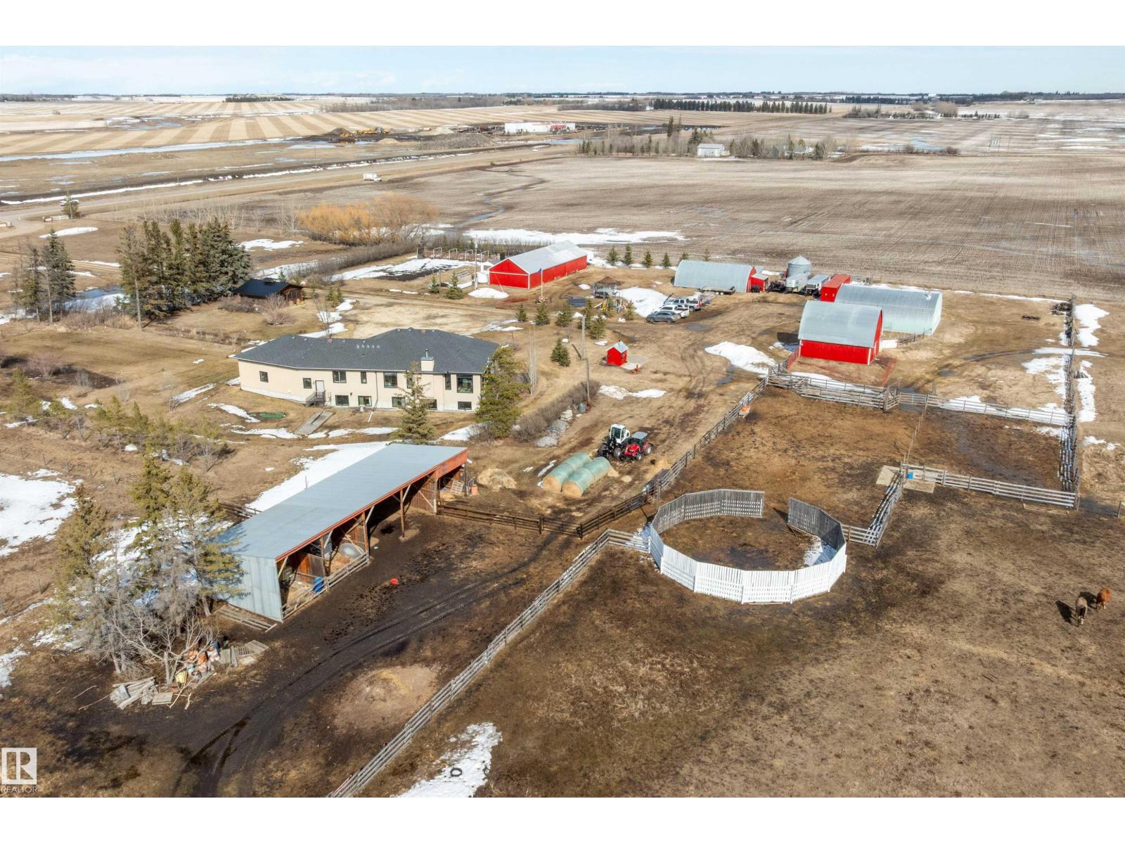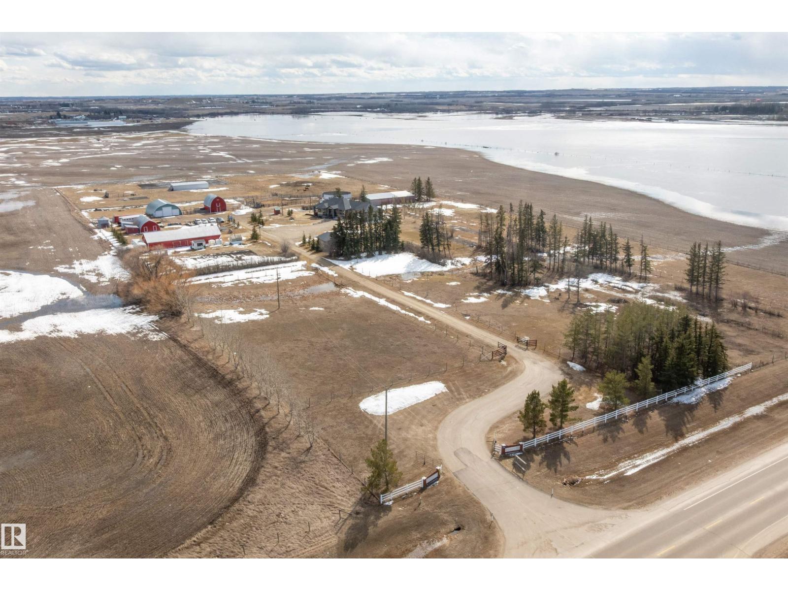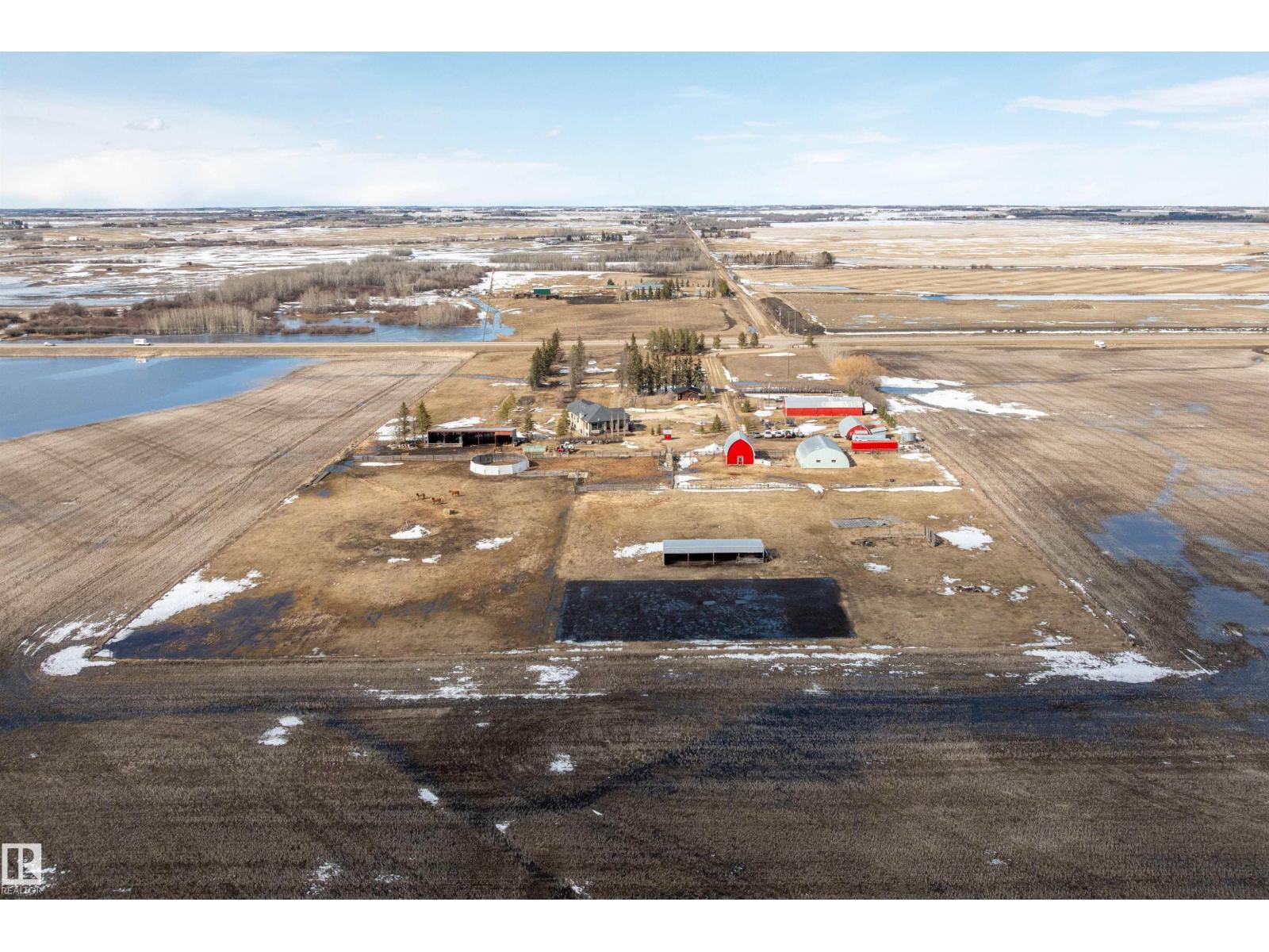15 minute drive north of St Albert and fronting on Highway 37 you will discover this Executive Style Acreage / Hobby Farm living at its best. 2240 Sq Ft Bungalow custom built in 2011 open concept 4 bedrooms 3.5 bathrooms with a fully finished basement with in-floor heating. A 26ft by 38ft attached garage with in-floor heating. View this 14.21 acres of beautiful professionally landscaped yard with enclosed gazebo and very large wood burning fire pit. Formal farm site with 40ft by 46 ft heated shop, 26ft by 80 ft Barn and 24ft by 44ft storage building. All out buildings have metal roofs plus home is energy efficient with 10 inch wall construction. Fully set up for Livestock or also can be utilized for a small business operation with highway access to 37 and only 5 minutes to highway 44. (id:51989)