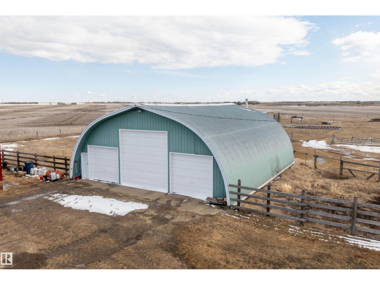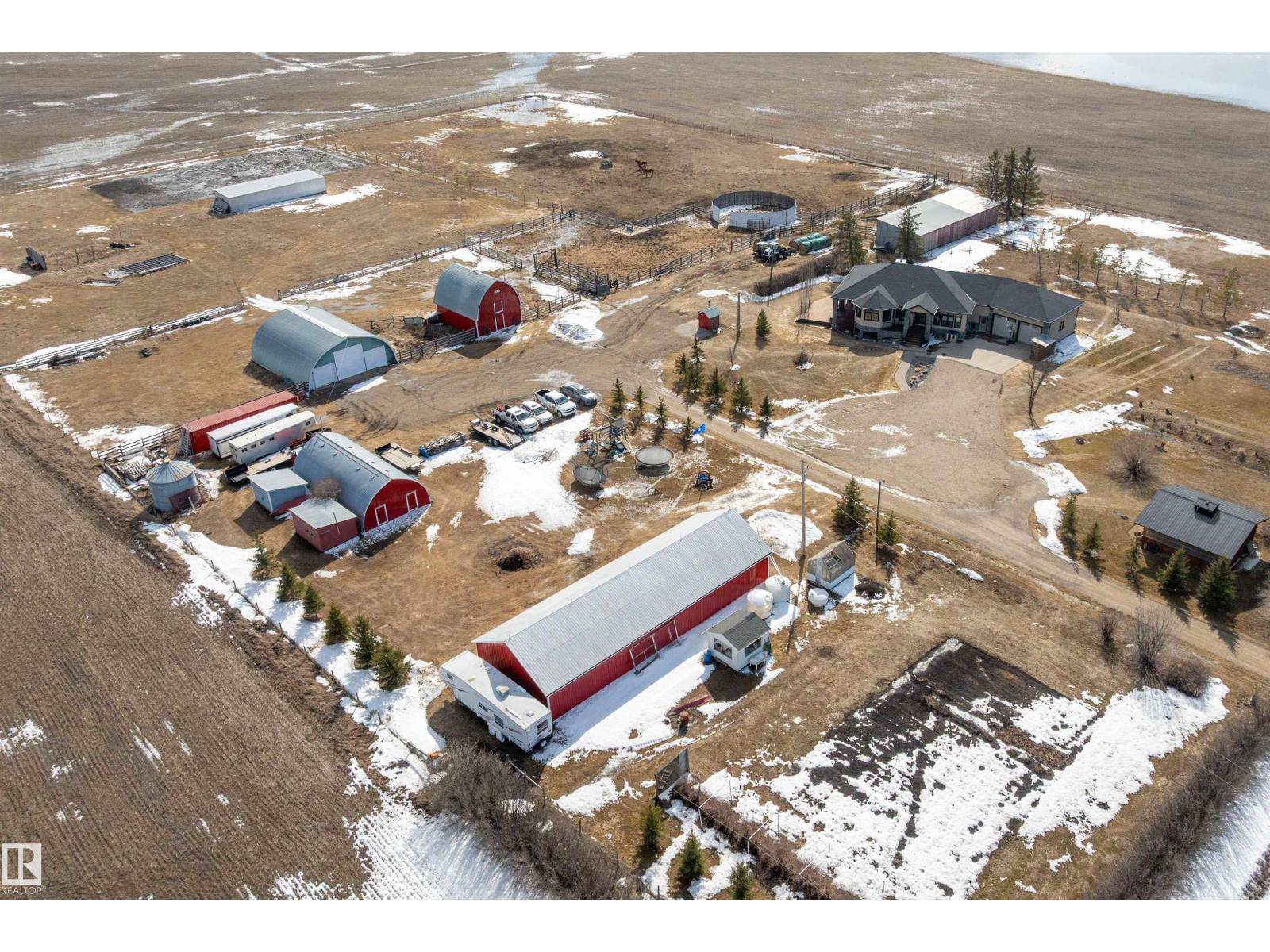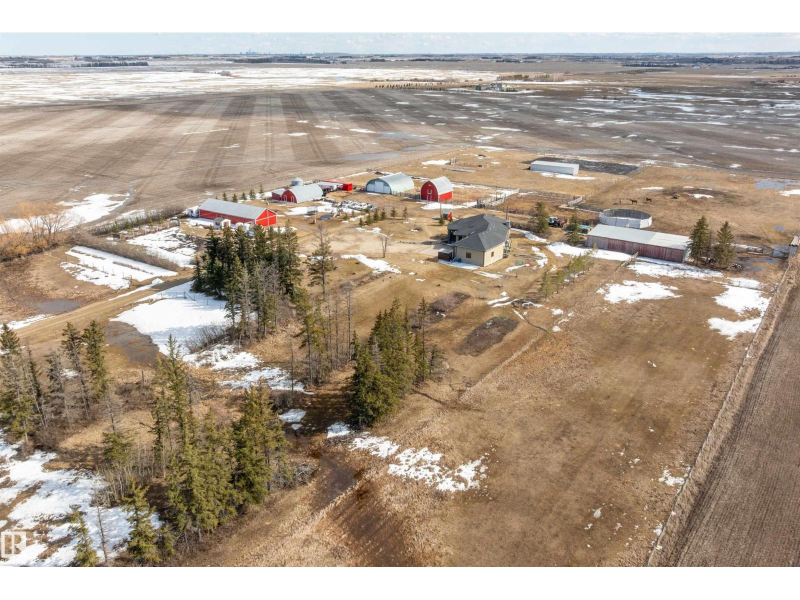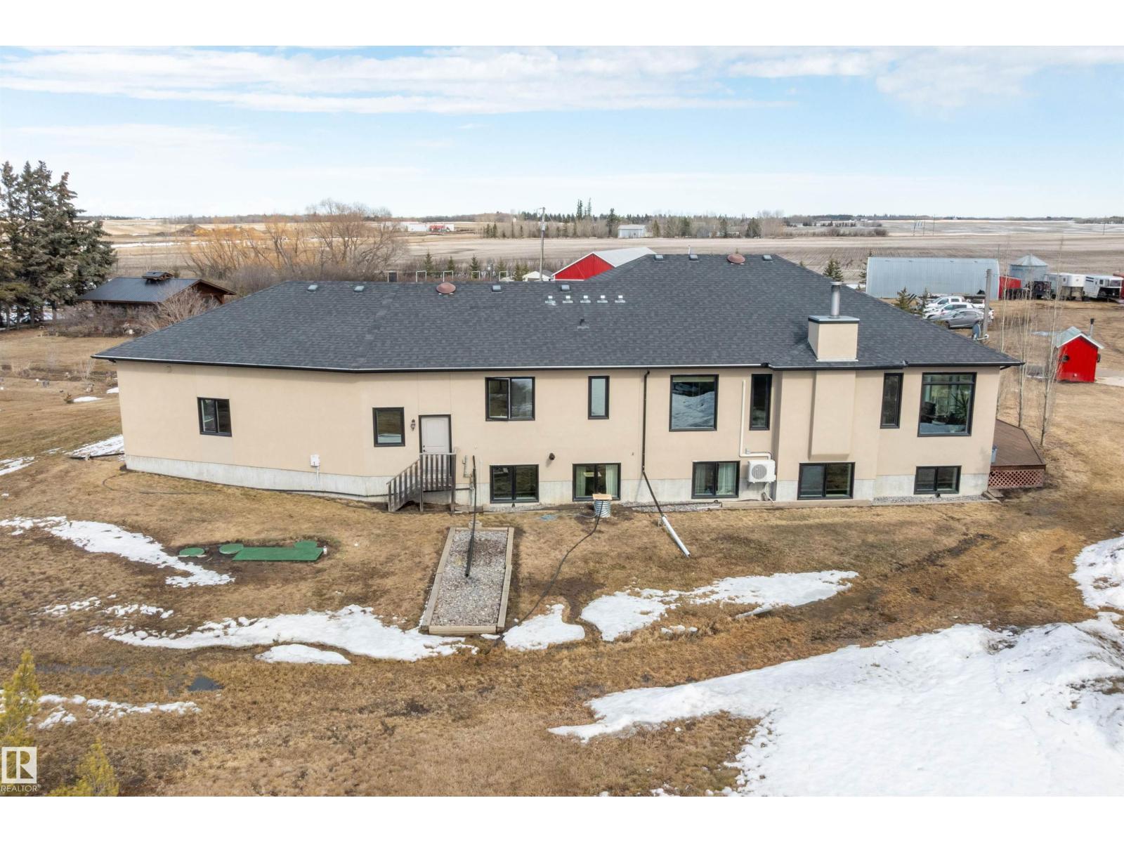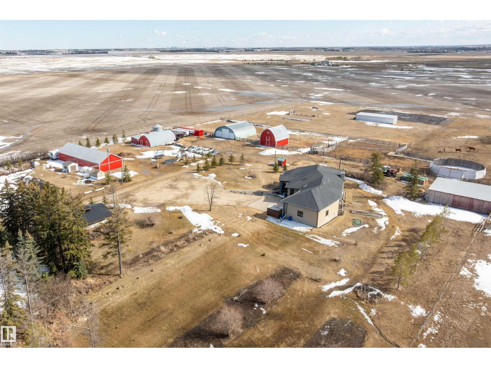 15 minute drive north of St Albert and fronting on Highway 37 you will discover this Executive Style Acreage / Hobby Farm living at its best. 2240 Sq Ft Bungalow custom built in 2011 open concept 4 bedrooms 3.5 bathrooms with a fully finished basement with in-floor heating. A 26ft by 38ft attached garage with in-floor heating. View this 14.21 acres of beautiful professionally landscaped yard with enclosed gazebo and very large wood burning fire pit. Formal farm site with 40ft by 46 ft heated shop, 26ft by 80 ft Barn and 24ft by 44ft storage building. All out buildings have metal roofs plus home is energy efficient with 10 inch wall construction. Fully set up for Livestock or also can be utilized for a small business operation with highway access to 37 and only 5 minutes to highway 44. (id:51989)