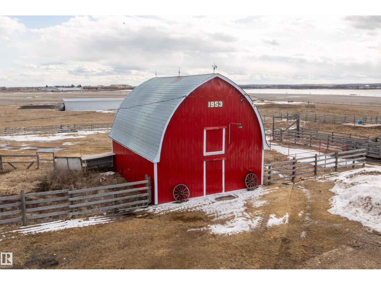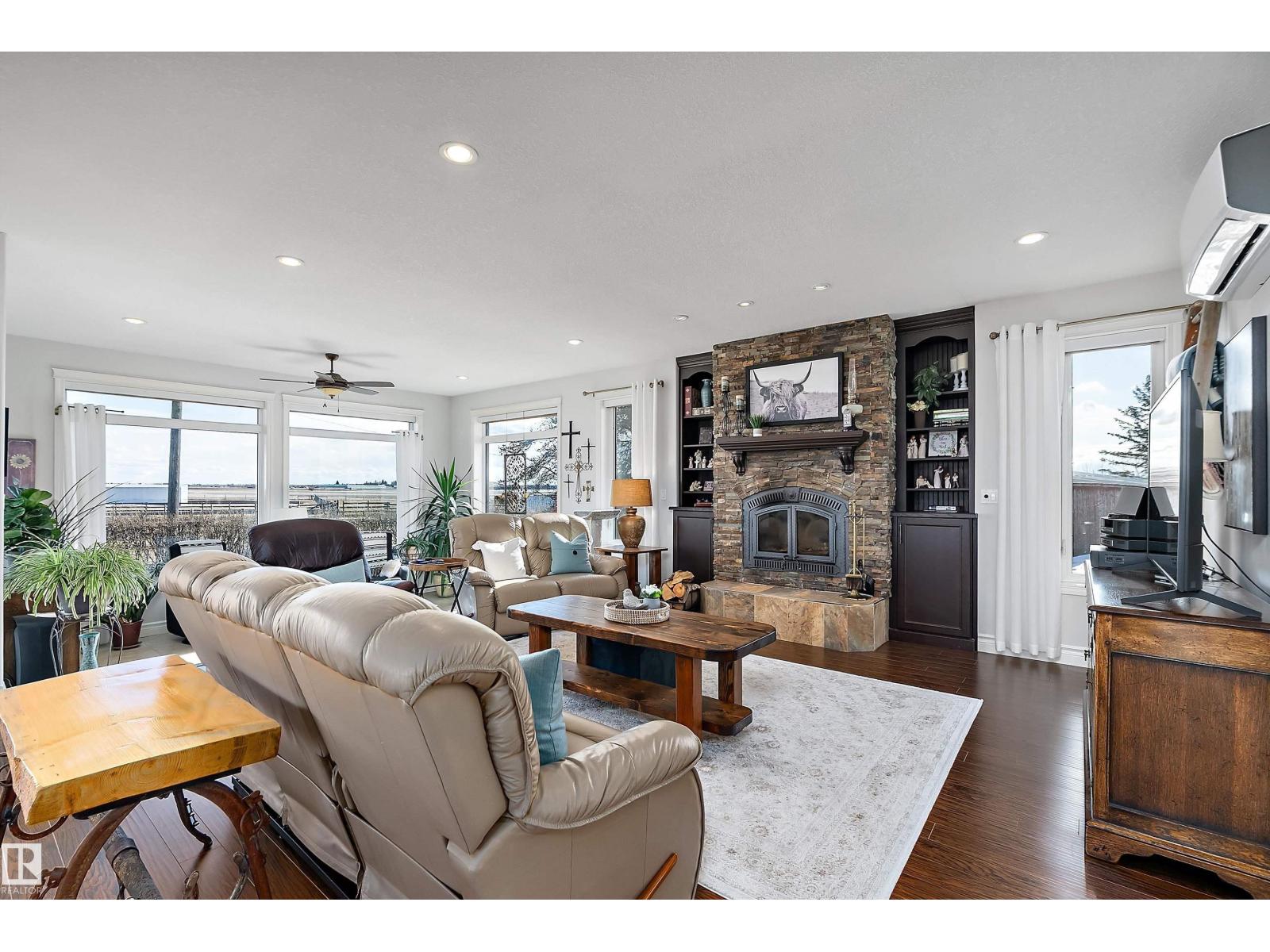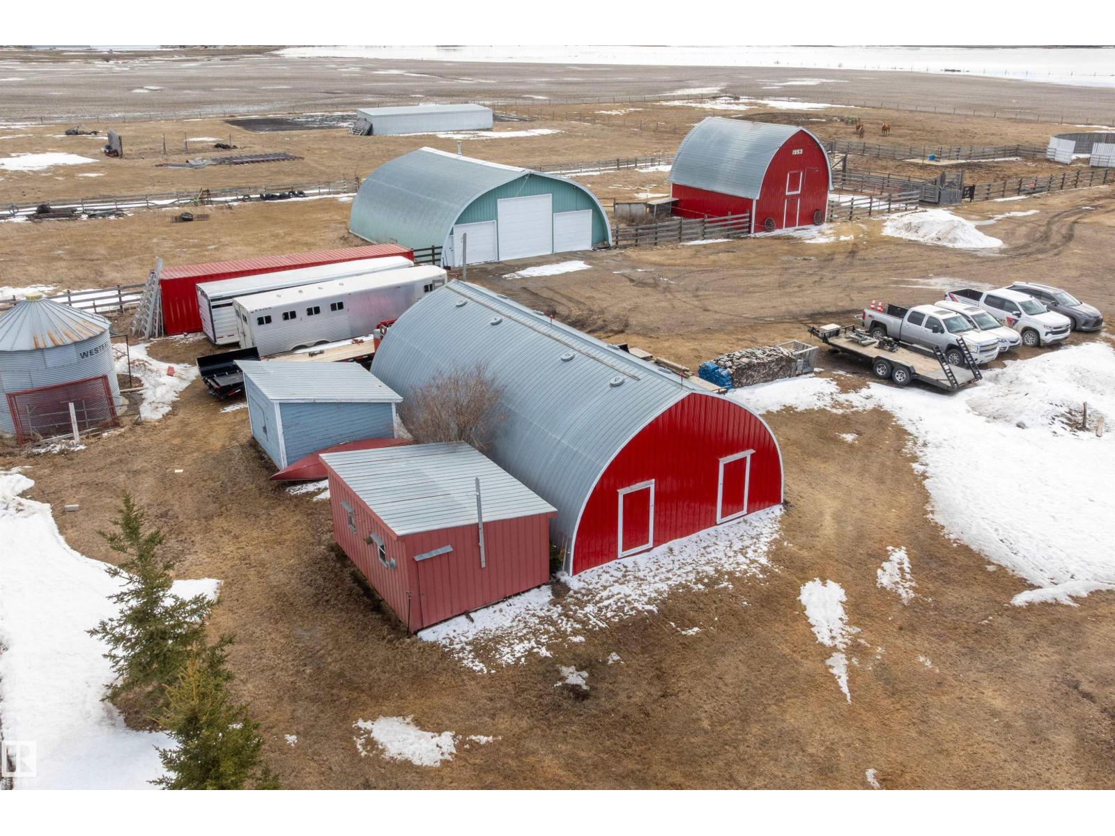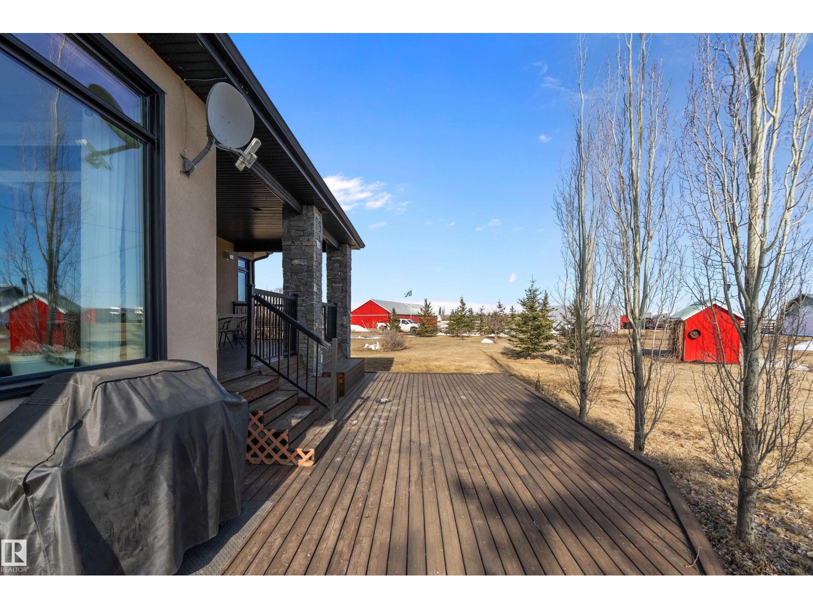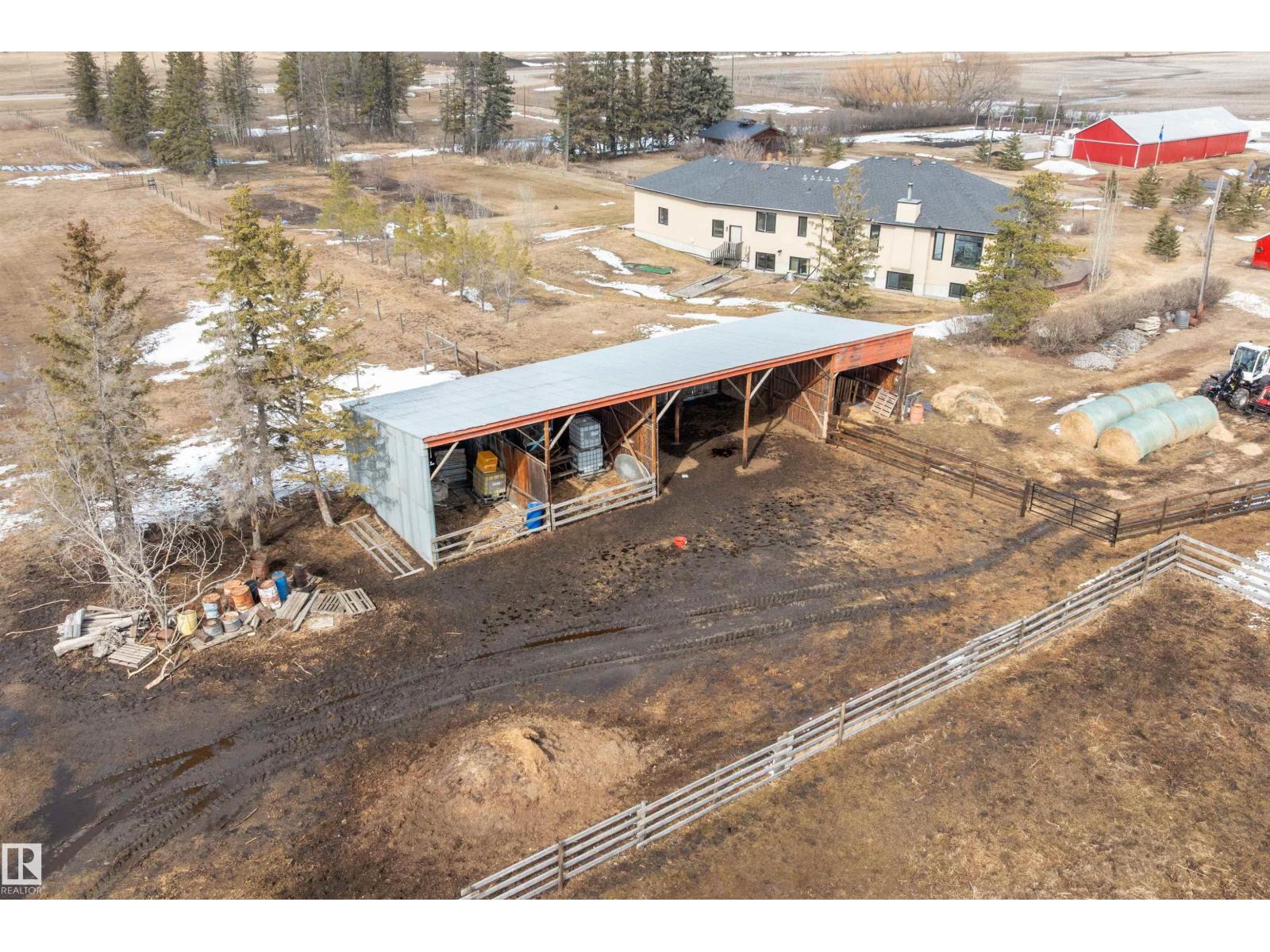 15 minute drive north of St Albert and fronting on Highway 37 you will discover this Executive Style Acreage / Hobby Farm living at its best. 2240 Sq Ft Bungalow custom built in 2011 open concept 4 bedrooms 3.5 bathrooms with a fully finished basement with in-floor heating. A 26ft by 38ft attached garage with in-floor heating. View this 14.21 acres of beautiful professionally landscaped yard with enclosed gazebo and very large wood burning fire pit. Formal farm site with 40ft by 46 ft heated shop, 26ft by 80 ft Barn and 24ft by 44ft storage building. All out buildings have metal roofs plus home is energy efficient with 10 inch wall construction. Fully set up for Livestock or also can be utilized for a small business operation with highway access to 37 and only 5 minutes to highway 44. (id:51989)
