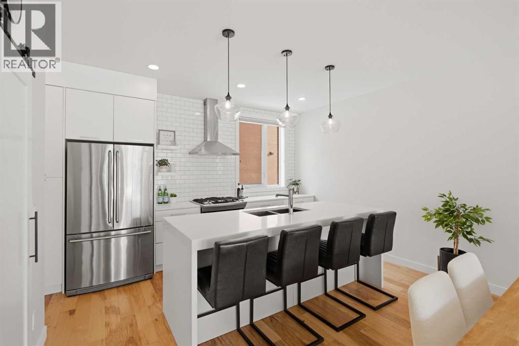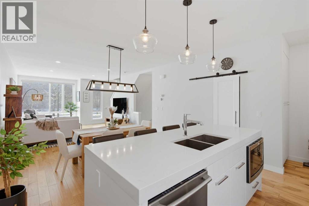 **BOW RIVER VIEWS | ROOFTOP PATIO | 2-BED | 2.5 BATH | DOUBLE ATTACHED GARAGE | LOW CONDO FEES | DESIGNER UPGRADES | PRIME INNER-CITY LOCATION.** Breathtaking views of the Bow River define this 1,676 sq ft townhome in The Henry, one of Parkdale’s most sought-after modern brownstones. The bright open main level captures river and pathway views through large front windows and features a designer kitchen with full-height cabinetry, quartz counters, stainless steel appliances and a large island that connects seamlessly to the dining and living areas. Upstairs, both bedrooms include walk-in closets and private ensuites, including a primary suite overlooking the river. The private rooftop patio with sunny southwest exposure creates an incredible outdoor space for relaxing or entertaining while taking in the Bow River setting. The entry level offers a versatile flex space ideal for a home office or gym, plus a double attached garage with additional storage. Located directly across from the Bow River pathway system and minutes to Foothills Hospital, the University District and downtown. Opportunities to own a river-facing brownstone with a rooftop patio in The Henry rarely become available. Book your private showing today. (id:51989)