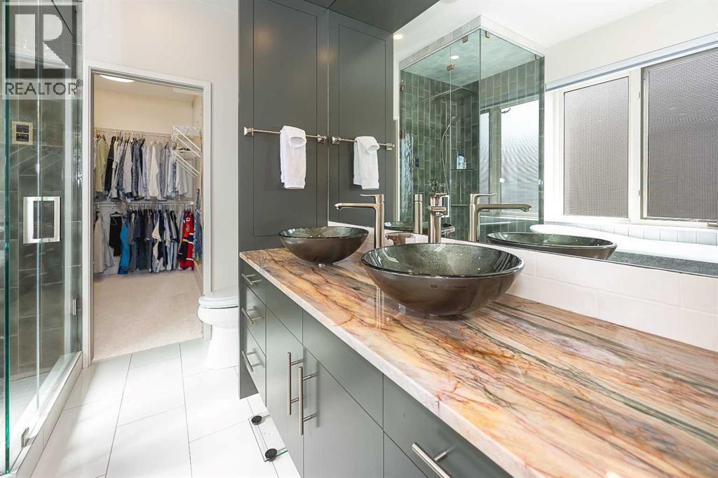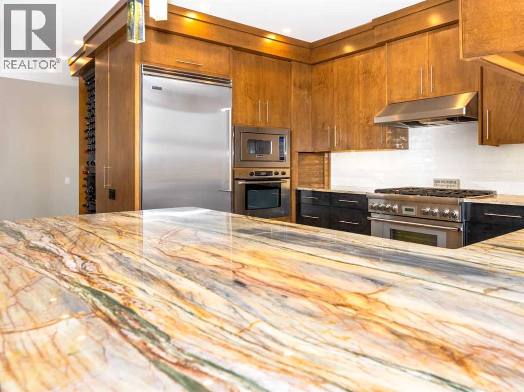 Luxury and sophistication converge in this meticulously renovated penthouse in the heart of Hillhurst. Just steps from Kensington’s vibrant shops and restaurants, the Bow River pathways, and the downtown core, this exceptional residence offers an elevated urban lifestyle. Situated in the boutique 12-unit Villagio building, constructed with superior ICF for outstanding soundproofing and energy efficiency, the home features a semi-private elevator that opens directly to the unit’s entrance. A grand foyer with soaring ceilings and an overhead skylight sets the tone as you enter this impressive two-level residence. The open-concept design is highlighted by dramatic 18-foot ceilings and a stunning south-facing wall of windows that fills the space with natural light. The central living room showcases a custom stone gas fireplace and a striking imported 120-piece hand-blown glass chandelier. Patio doors lead to one of two south-facing outdoor spaces, ideal for relaxing or entertaining. The chef’s kitchen is a true showpiece, featuring premium appliances including a Thermador dual-fuel gas range, Sapphire dishwasher, Viking refrigerator, and built-in microwave. Hand-selected quartzite countertops complement the space, while imported custom light fixtures add refined character. Adjacent to the kitchen, the dining area features a custom wine display with oak racking and a built-in buffet complete with a wine fridge and quartzite counters. A distinctive custom light fixture adds warmth and elegance to the space. The main-level primary retreat offers built-in cabinetry and a luxurious spa-inspired ensuite with dual sinks, Hansgrohe fixtures, quartzite countertops, a steam shower, and a custom cast-iron slipper tub. The suite is completed by a spacious walk-in closet. A powder room and convenient laundry area complete the main floor. The upper level features a second bedroom with access to a large in-suite storage room, a three-piece bathroom, and a versatile flex space ideal fo r a home office. A catwalk overlooking the living area below leads to patio doors that open onto the second south-facing patio, creating another private outdoor retreat. Extensive renovations throughout the home include new quarter-sawn engineered oak flooring on the main level, newer carpeting upstairs, modern railings overlooking the living room, fresh paint, and new remote-controlled window coverings. Comfort is enhanced by a newly installed Fujitsu mini-split four-zone inverter system, providing flexible climate control with independent heating, cooling, or fan settings for individual areas. The unit also includes two titled parking stalls, both generously sized to accommodate a full-size truck. This remarkable penthouse must be experienced in person to be fully appreciated. (id:51989)