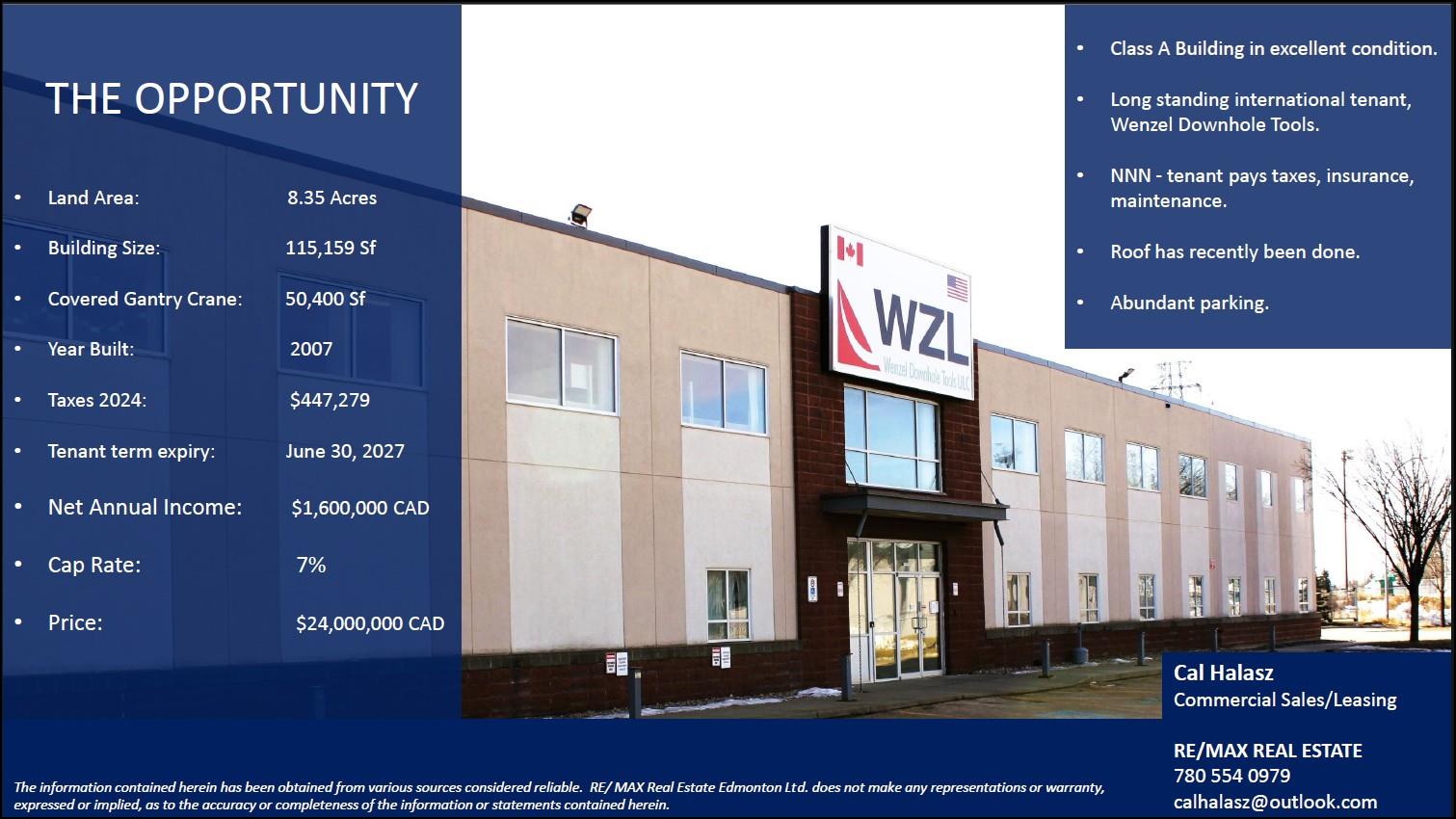 INVESTMENT OPPORTUNITY: This is a rare chance to purchase a high-quality Class A industrial building as an investment or owner-user. The property offers stable income with a triple-net lease. Built in 2007 and kept in excellent condition with recently replaced roof- the facility includes modern features like, LED lighting, multiple bridge cranes, and a secure, fenced yard. Located on 8.35 acres with great access to major highways and transportation routes, this is a turnkey investment generating $1.6 million in annual income with a 7% cap rate. The lease runs until June 30, 2027. Other Property Types: IndustrialOwnership Interest: Agent/Seller has InterestTitle to Land: Fee SimpleRPR Survey Available: YesSeller Rights: NoAppointment Name: Cal HalaszAppointment Phone: 780-554-0979Paragon Listing ID: E4428614 (id:51989)