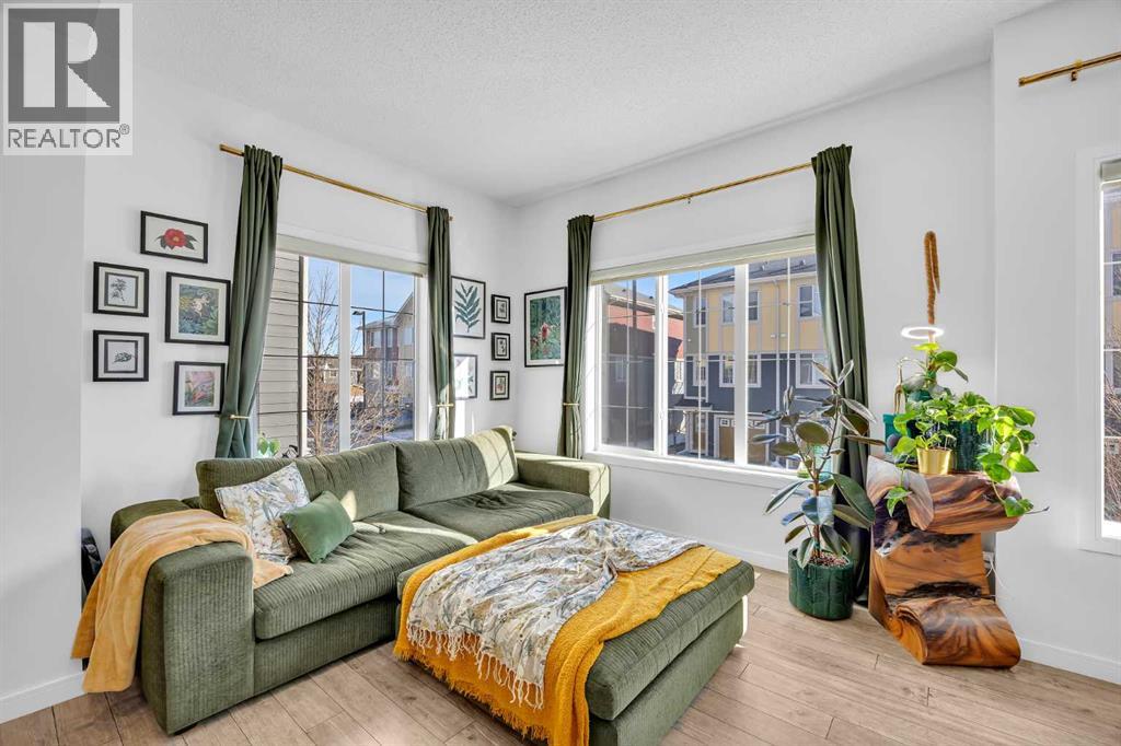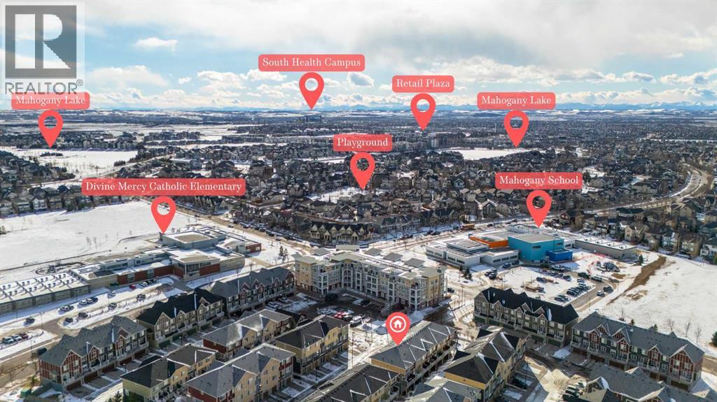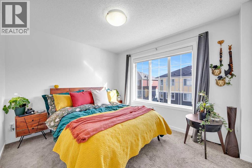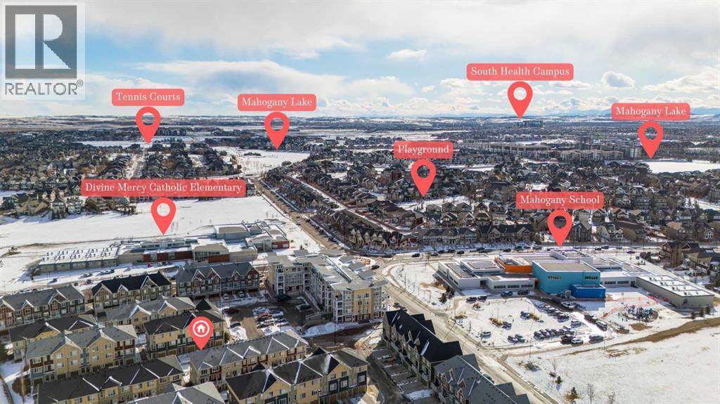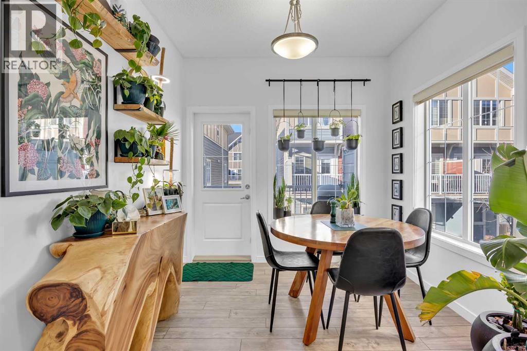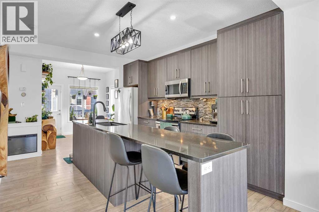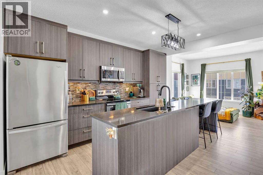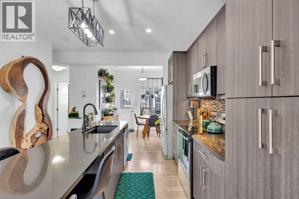 Welcome to this bright and well maintained corner unit townhouse located in the sought after lake community of Mahogany. Offering 3 bedrooms, 2.5 bathrooms, central air conditioning, and over 1,200 sq ft of living space, this home combines a functional layout with excellent natural light thanks to its end unit location.The main floor features an open concept design with a spacious living room, dedicated dining area, and a modern kitchen complete with quartz countertops, stainless steel appliances, mosaic tile backsplash, and a large island with seating. The dining area provides direct access to the balcony, making it easy to enjoy summer BBQs or relax outdoors. A convenient 2 piece bathroom is also located on this level.Upstairs you will find three bedrooms including the primary bedroom with a walk in closet and private 4 piece ensuite. Two additional bedrooms, another full bathroom, and upper level laundry add to the practical layout of the home. Parking is a standout feature with a double tandem attached heated garage plus driveway parking, providing space for multiple vehicles along with extra storage. The home also includes central air conditioning for added comfort during Calgary’s warmer months. Located in Ebony Townhomes, the complex offers visitor parking, landscaped green spaces, and courtyards. Residents also enjoy access to Mahogany’s private lake, along with nearby parks, pathways, schools, shopping, and restaurants.A great opportunity to own a corner unit townhouse in one of Calgary’s most desirable lake communities. (id:51989)