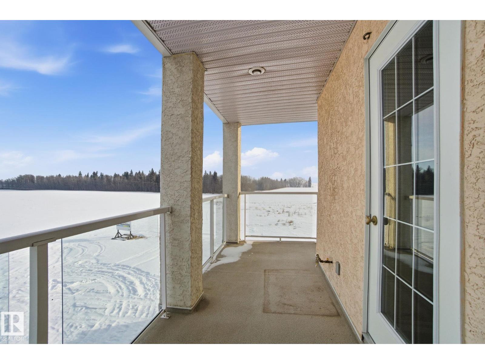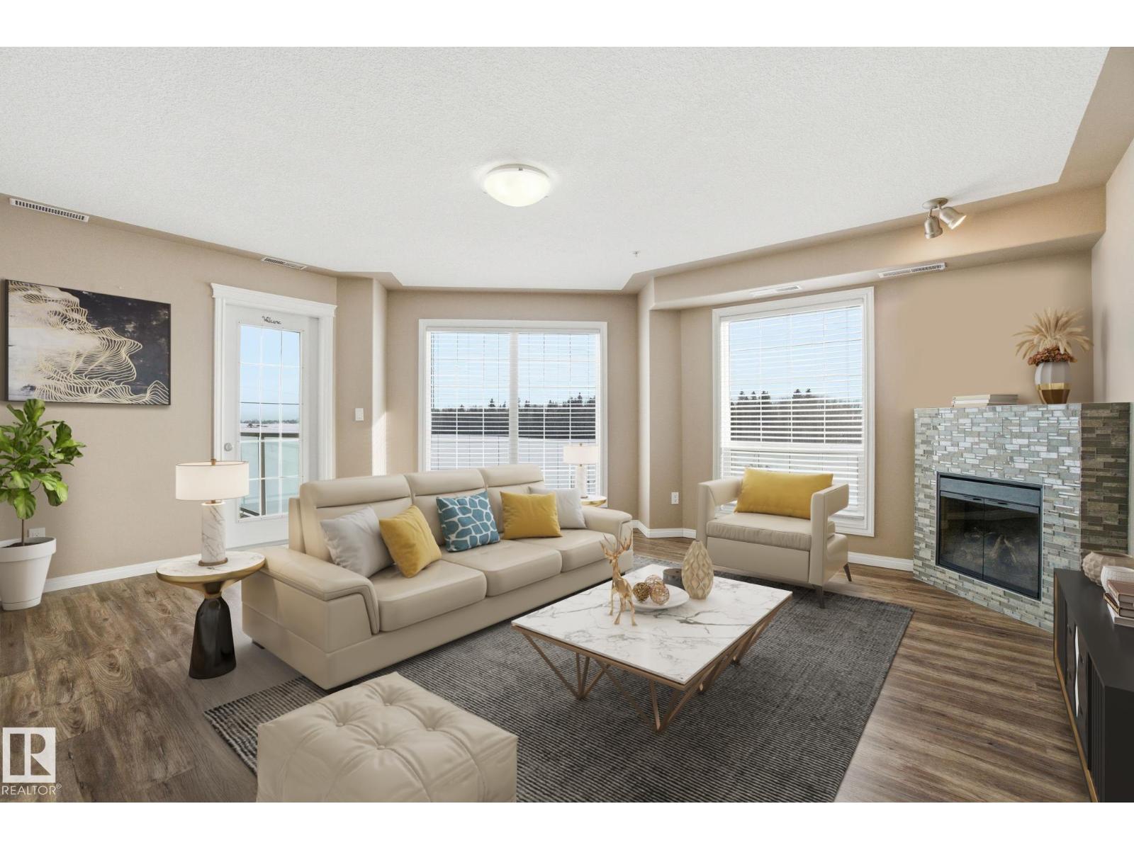 Live the relaxed & easy life here in Stony Plain!!! 35+ age restriction in this 2 bedroom, 2 bathroom condo is over 1000 sq ft. Beautiful 3rd floor CORNER unit with wrap around balcony! Great location with views onto the farm fields surrounding this complex. Loads of renovations here! Great kitchen with tons of space. Updated appliances, cabinets, counter tops, under cabinet lighting and more! Bright living room with plenty of windows & corner fireplace to cozy around on a winter evening! Master bedroom is a great space with separate entrance to the balcony. Walk in closet & 3pc ensuite. 2nd bedroom is perfect for guests or a home office. Additional 4pc bathroom! UNDERGROUND PARKING with bonus storage cage! Tons of social opportunities in this close community with rec room, gym equipment, social spaces, amenities building! Close to golf and walking paths!!! (id:51989)