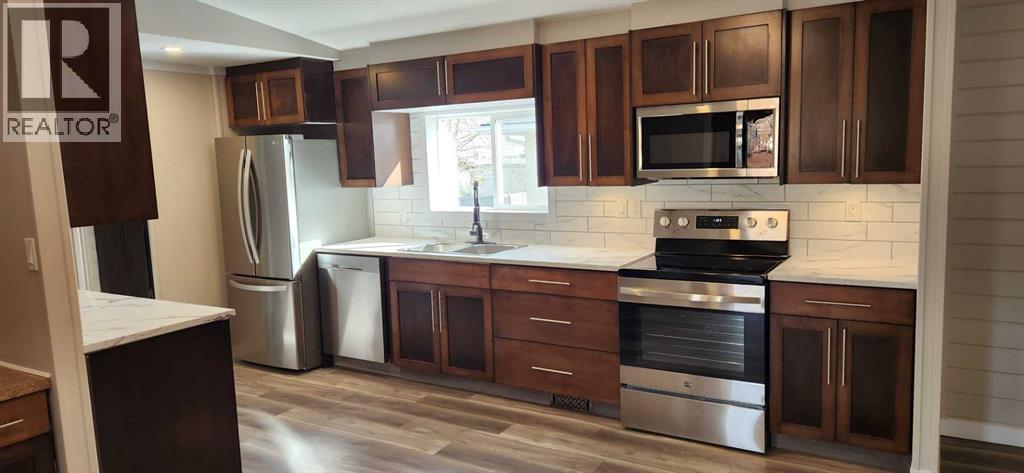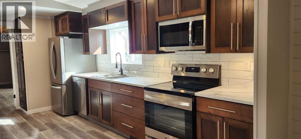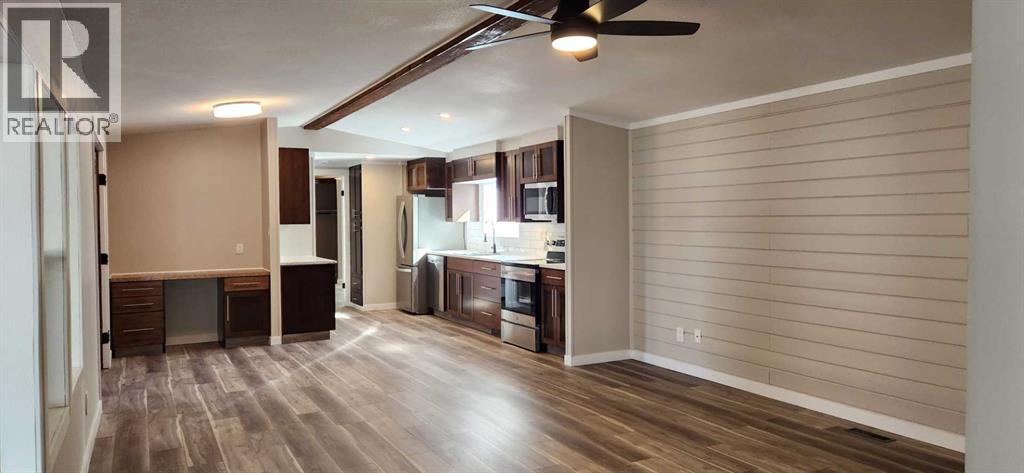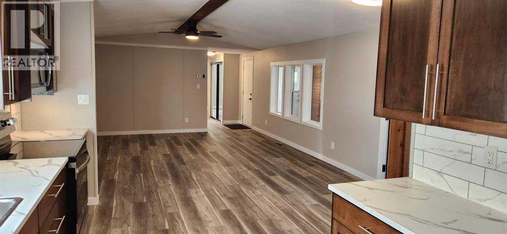 When you see this in person you are not going to believe your eyes. This is a large (16x76) 3 bedroom, 3 bathroom manufactured home is on a double size lot with an attached 2 car heated garage. Located in the Westside trailer park this extensively renovated home is now ready for the next owner. The list of new items are insane, but the short version is this: roof, siding, windows and doors, plumbing lines and fixtures, H/W tank, electrical plugs, lights, fans and switches, flooring, paint and kitchen appliances and more. This large manufactured home has 2 bedrooms up front, a 3 piece bathroom, cozy living room with shiplap walls, an AMAZING KITCHEN with new appliances, laundry room and a private Master bedroom at the back of the home with cedar lined ceilings that carry on into ensuite and closet.This home is highlighted by the open concept feel of the inside and of course by the great room looking out onto the large easy to keep landscaped yard. This great room has many functional options available to you like a games room for the kids, theater room maybe, or sports lounge perhaps. It comes with 11 foot cedar ceilings and another 3 piece bath. Park inside the 17x20 heated garage, and stay out of the elements as you walk through the breezeway to the home. There is also a large enclosed porch great for additional relaxation space. There are no age restrictions at this park, dogs need park approval though, and the lot fee is $500 monthly, which includes garbage pickup and recycling, water and sewer (id:51989)