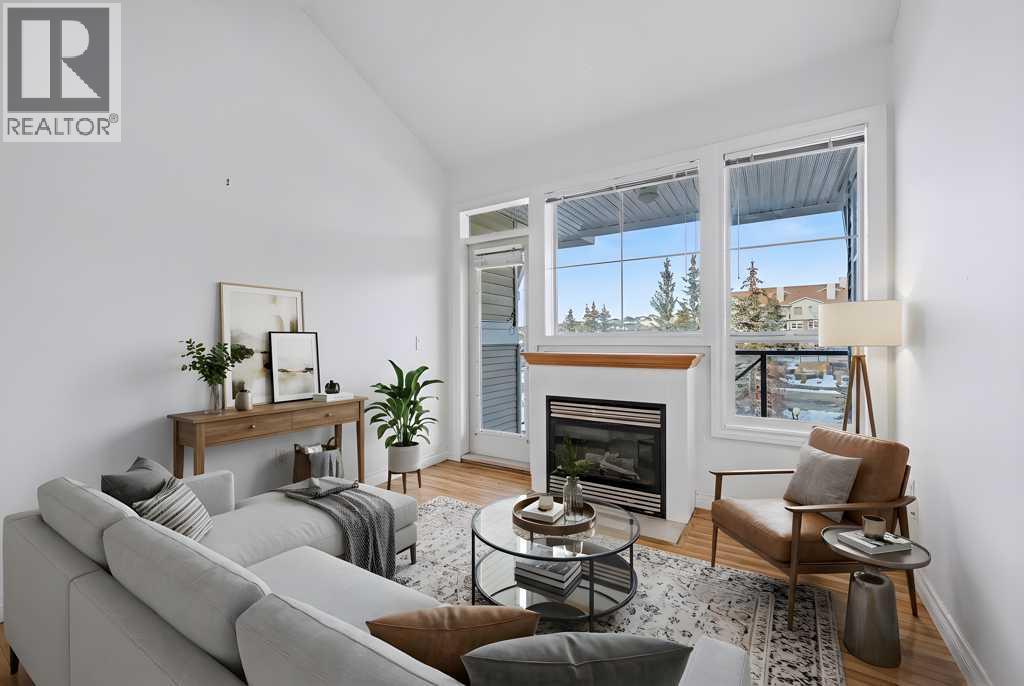 Bright top-floor condo in Stonecroft offering an easy, low-maintenance lifestyle in the sought-after lake community of Arbour Lake. This 2 bed + den, 2 updated bath home features vaulted ceilings, a cozy fireplace, and large windows that fill the space with natural light, plus a private deck for relaxing. The open-concept layout includes a stylish kitchen with stainless steel appliances, upgraded countertops, pantry, and eating bar, along with a spacious dining area perfect for hosting. The primary retreat offers a walk-in closet and updated ensuite, while the second bedroom is privately located across the unit and the den with French doors is ideal for an office or hobby space. Enjoy titled underground parking, storage, and great amenities including a social room, workshop, guest suite, and beautifully maintained grounds, all just steps from the lake, Crowfoot shopping, transit, YMCA, and easy access to Stoney Trail. Photos are Virtually Staged. (id:51989)