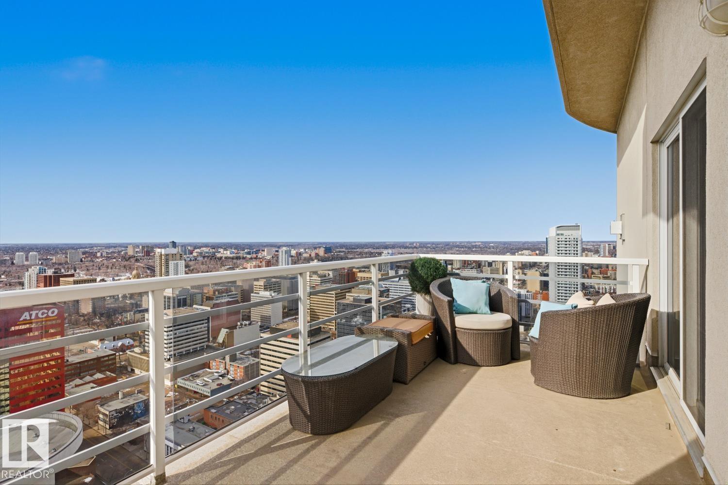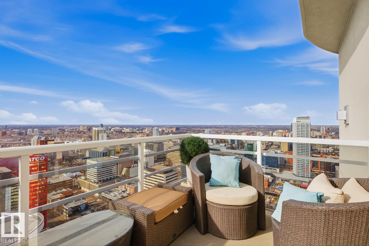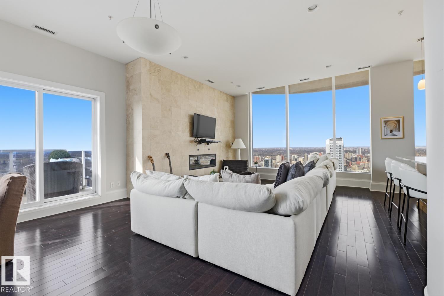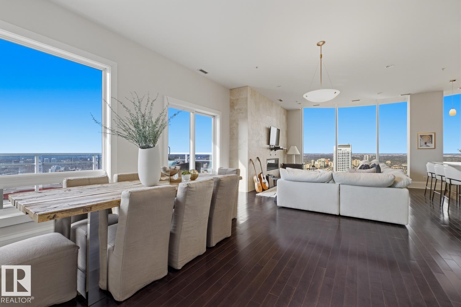 A rare opportunity to claim the penthouse in Icon II — where you can enjoy sweeping views over Edmonton expand from the Ice District to the horizon, over your daily morning coffee. Soaring 10’ ceilings and expansive walls of glass fill the space with natural light and frame the city below. The kitchen is both elegant and functional, finished with granite countertops, stainless steel appliances and rich hardwood flooring, all flowing seamlessly into the spacious living room with fireplace and an expansive dining area. Designed with privacy and comfort in mind, there are two beautifully appointed bedroom suites, each with its own ensuite. The primary retreat is further enhanced by a wraparound balcony, large walk-in closet, and stylish ensuite. A second private balcony, in-suite laundry, and a sleek 2-piece powder room add further convenience and functionality. Complete with two titled underground parking stalls and the security of a well-managed building, this is elevated downtown living at its finest. (id:51989)