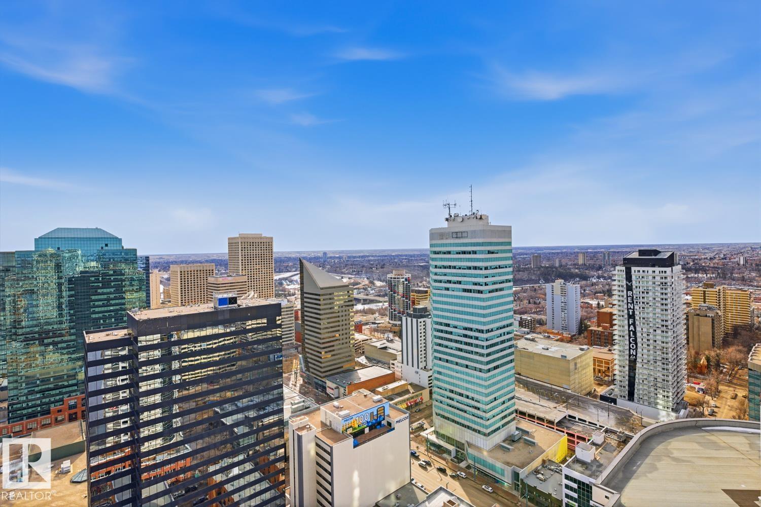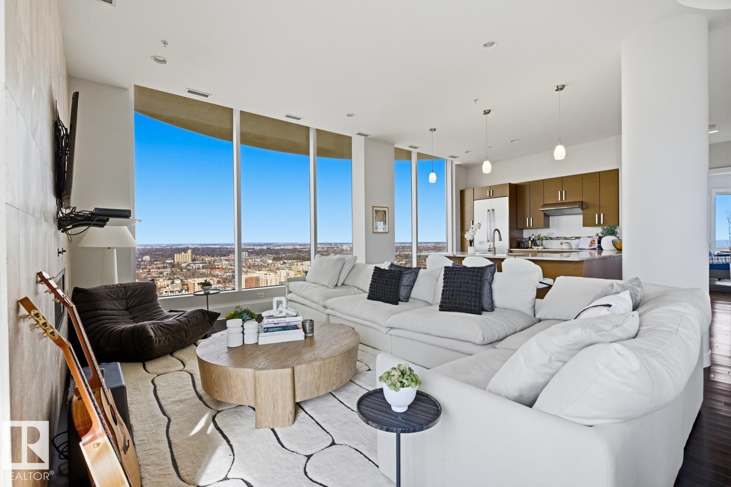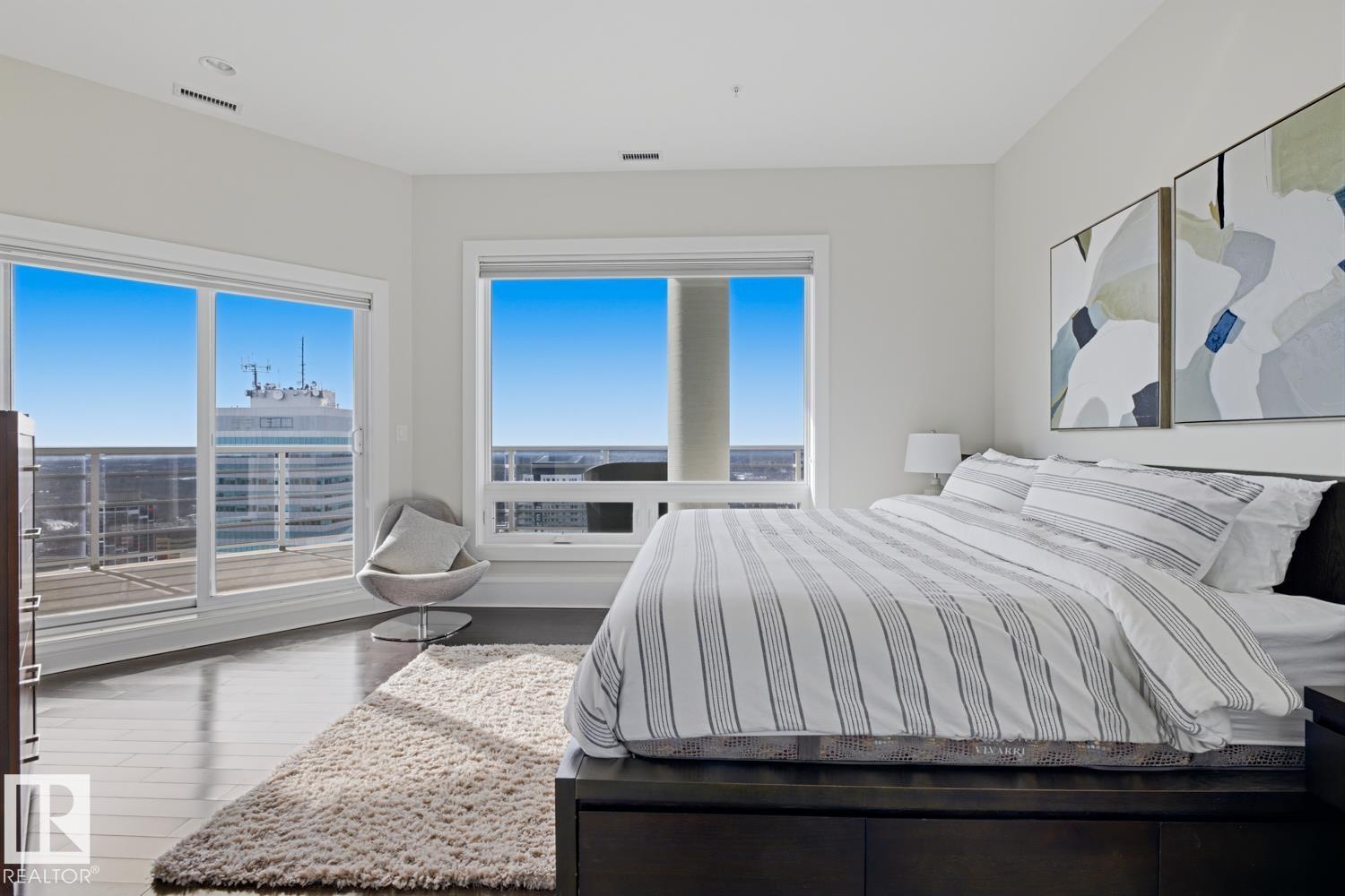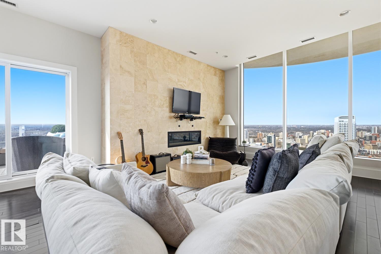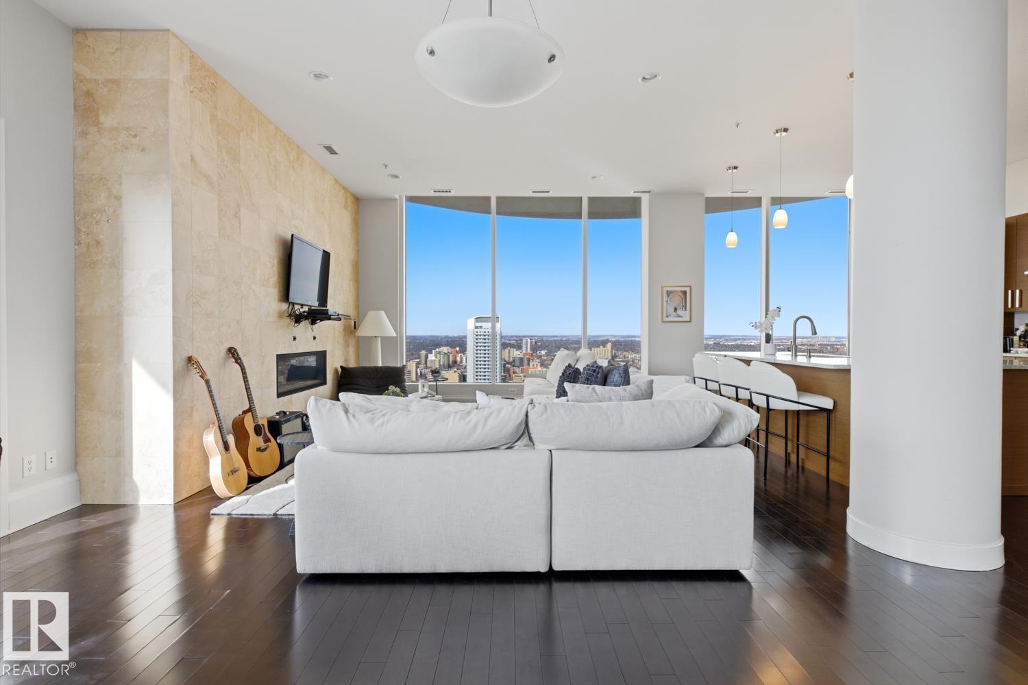 A rare opportunity to claim the penthouse in Icon II — where you can enjoy sweeping views over Edmonton expand from the Ice District to the horizon, over your daily morning coffee. Soaring 10’ ceilings and expansive walls of glass fill the space with natural light and frame the city below. The kitchen is both elegant and functional, finished with granite countertops, stainless steel appliances and rich hardwood flooring, all flowing seamlessly into the spacious living room with fireplace and an expansive dining area. Designed with privacy and comfort in mind, there are two beautifully appointed bedroom suites, each with its own ensuite. The primary retreat is further enhanced by a wraparound balcony, large walk-in closet, and stylish ensuite. A second private balcony, in-suite laundry, and a sleek 2-piece powder room add further convenience and functionality. Complete with two titled underground parking stalls and the security of a well-managed building, this is elevated downtown living at its finest. (id:51989)