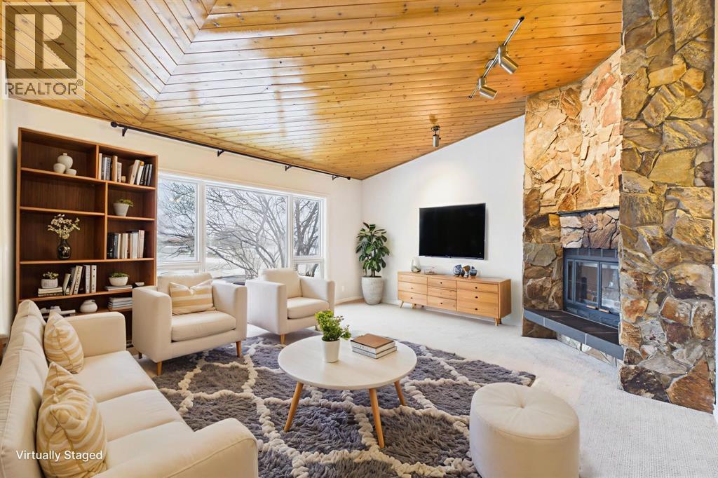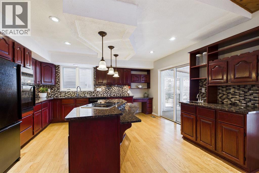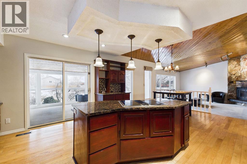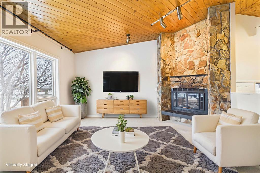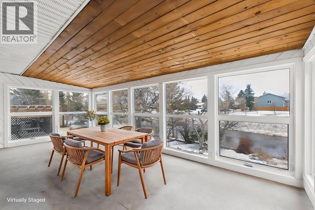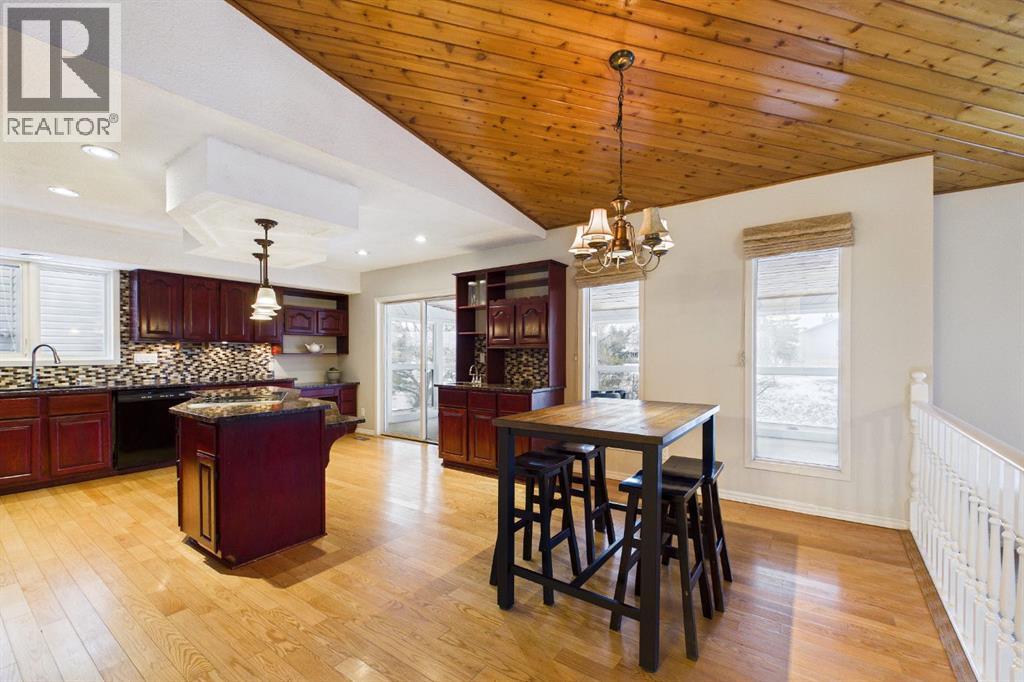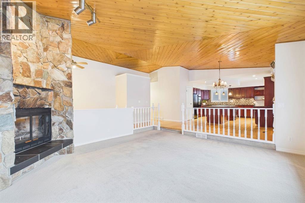 Nestled in a quiet cul-de-sac and backing directly onto the scenic Nose Creek, this spectacular property offers a rare blend of private outdoor tranquility and nearly 2,700 square feet of developed living space. The interior immediately impresses with 14-foot vaulted wood ceilings and a dramatic expanse of west-facing windows that flood the great room—complete with a stone-faced wood-burning fireplace—with natural light. Entertaining is effortless in the granite-clad kitchen and spacious dining area, while the sunroom addition provides a seamless transition to a treed backyard oasis with direct gate access to the creek-side pathway system. This functional home features a primary suite with a three-piece ensuite, two additional main-floor bedrooms, and a massive lower-level family room and rec area. With two more flex rooms and a full bathroom down stairs, this home is great for the growing family. Close to schools, parks and a playground this house is a must-see! (id:51989)