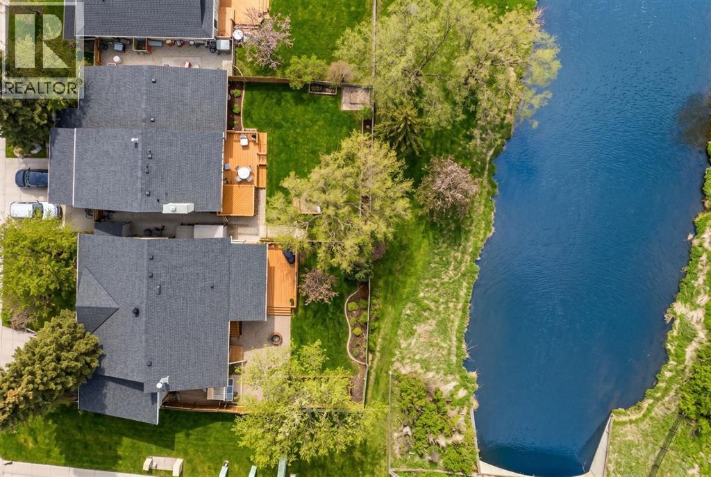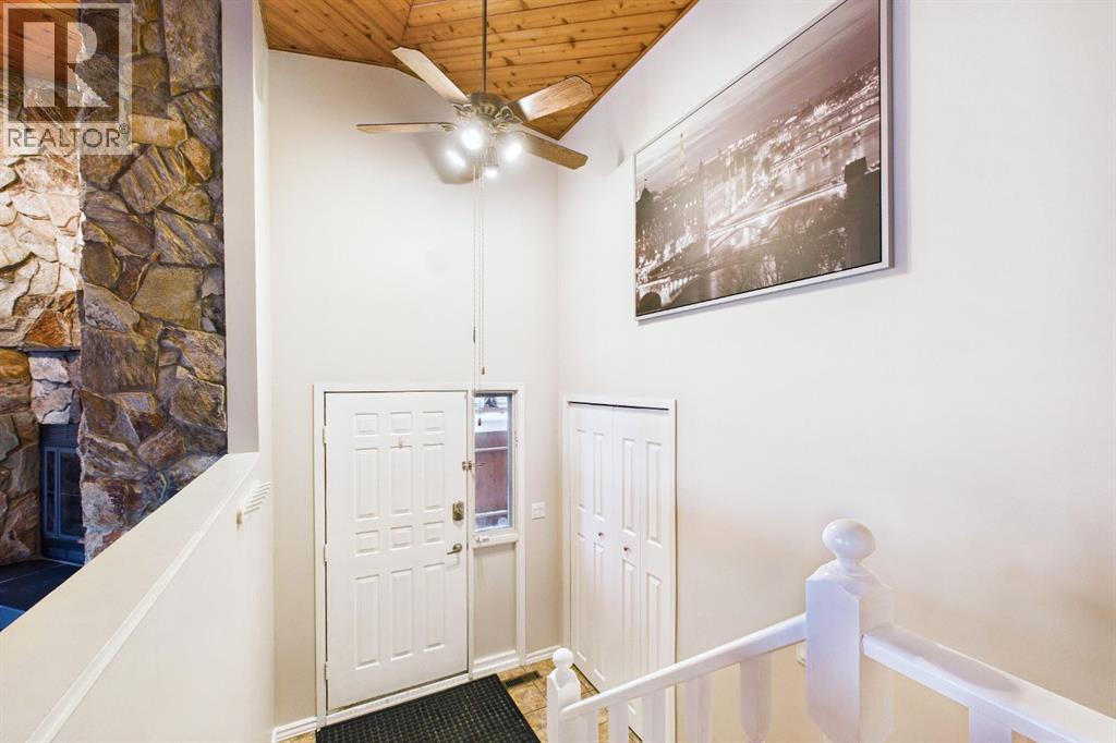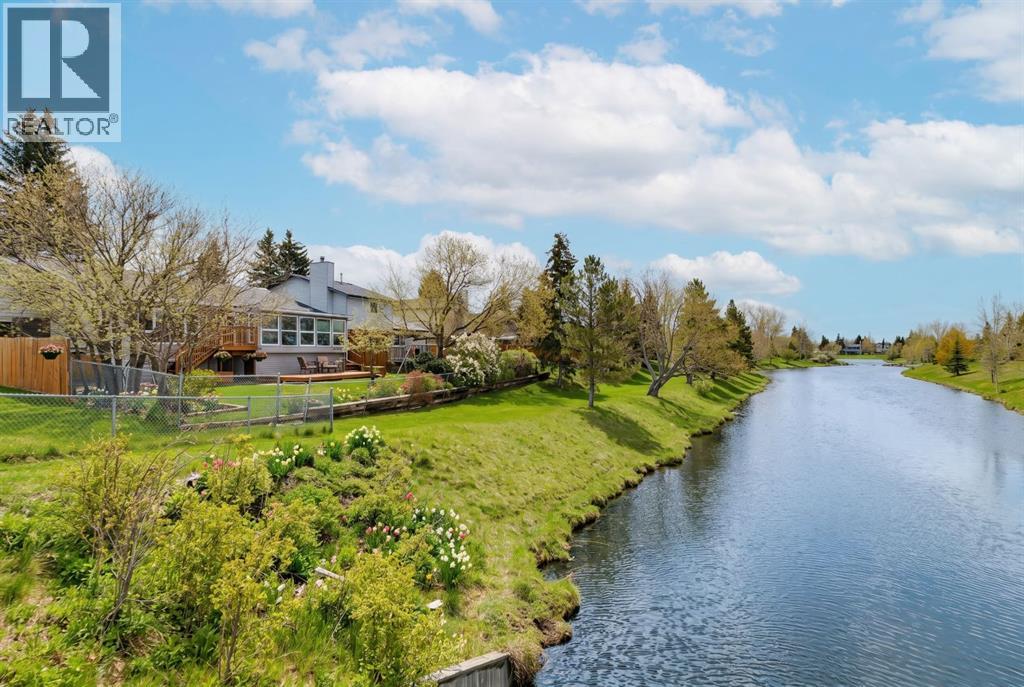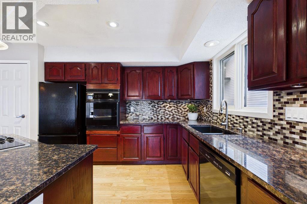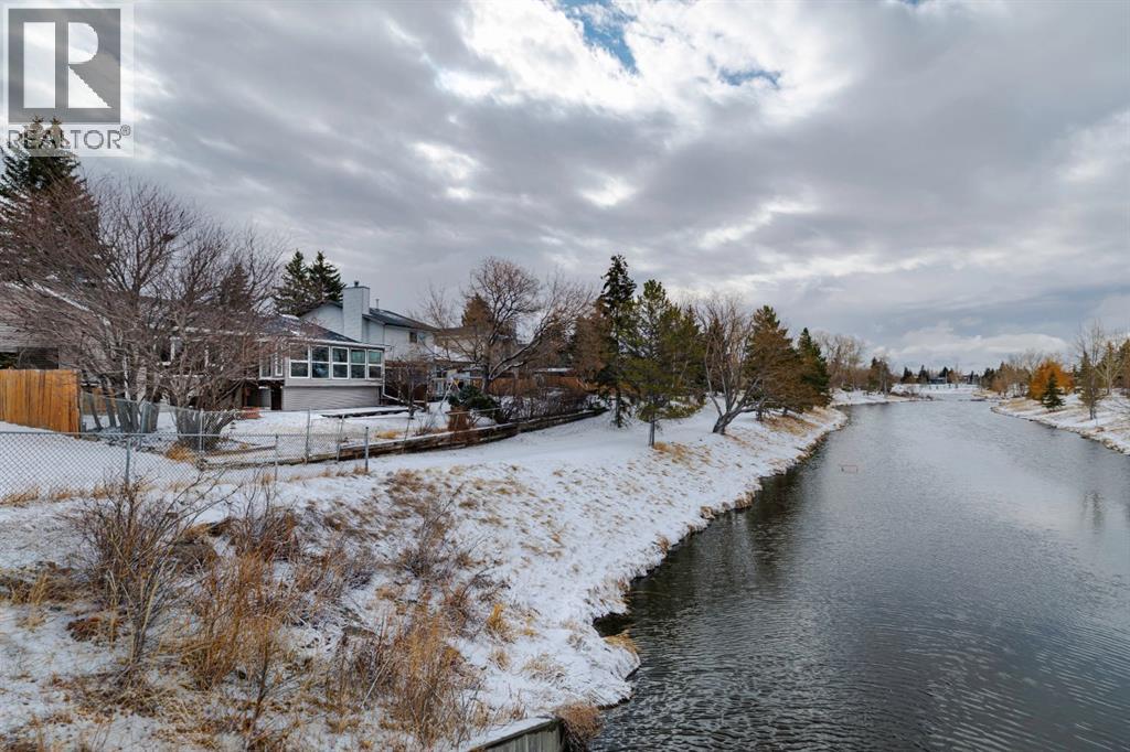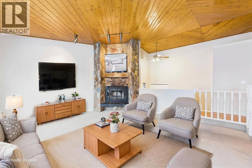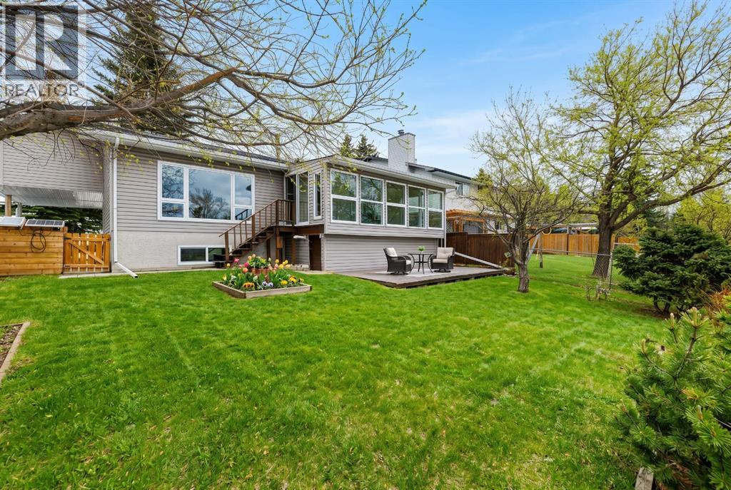 Nestled in a quiet cul-de-sac and backing directly onto the scenic Nose Creek, this spectacular property offers a rare blend of private outdoor tranquility and nearly 2,700 square feet of developed living space. The interior immediately impresses with 14-foot vaulted wood ceilings and a dramatic expanse of west-facing windows that flood the great room—complete with a stone-faced wood-burning fireplace—with natural light. Entertaining is effortless in the granite-clad kitchen and spacious dining area, while the sunroom addition provides a seamless transition to a treed backyard oasis with direct gate access to the creek-side pathway system. This functional home features a primary suite with a three-piece ensuite, two additional main-floor bedrooms, and a massive lower-level family room and rec area. With two more flex rooms and a full bathroom down stairs, this home is great for the growing family. Close to schools, parks and a playground this house is a must-see! (id:51989)