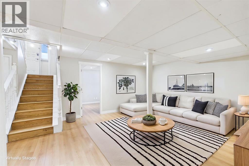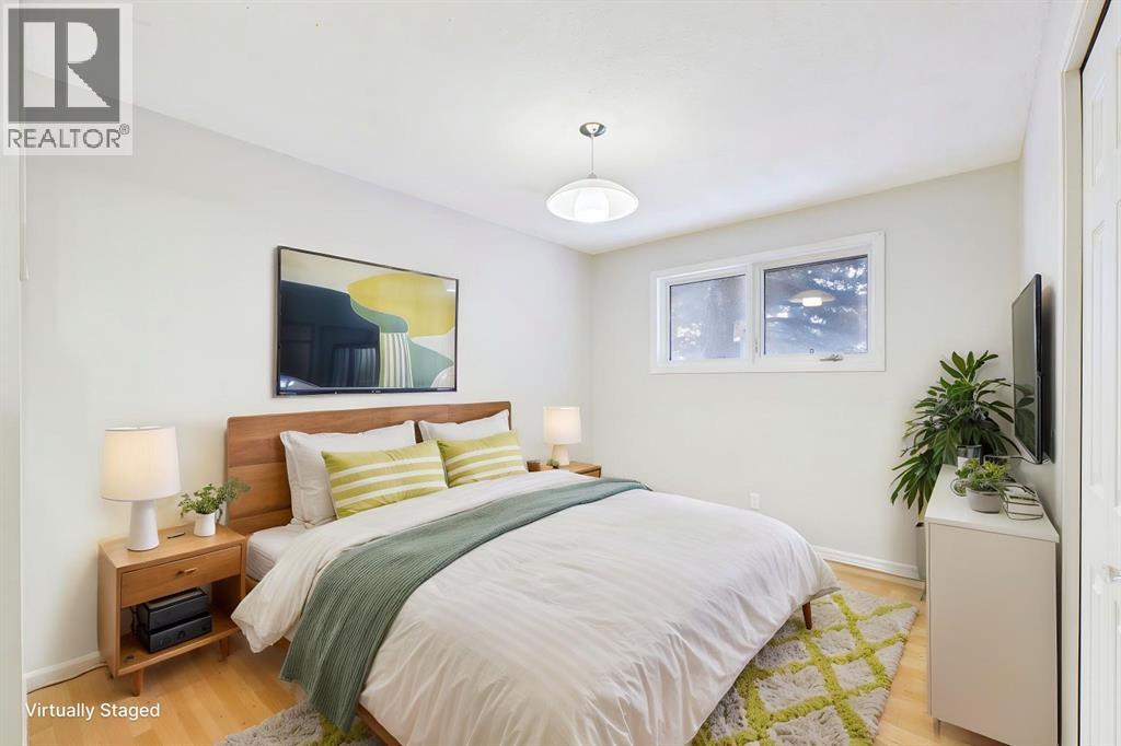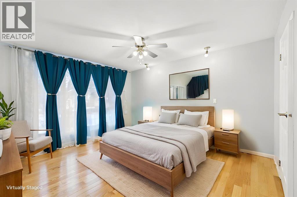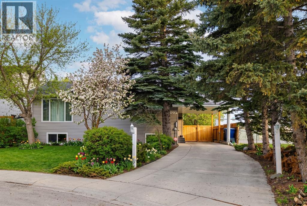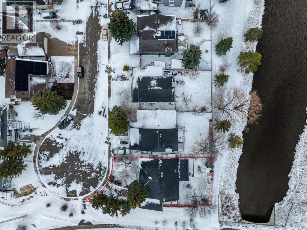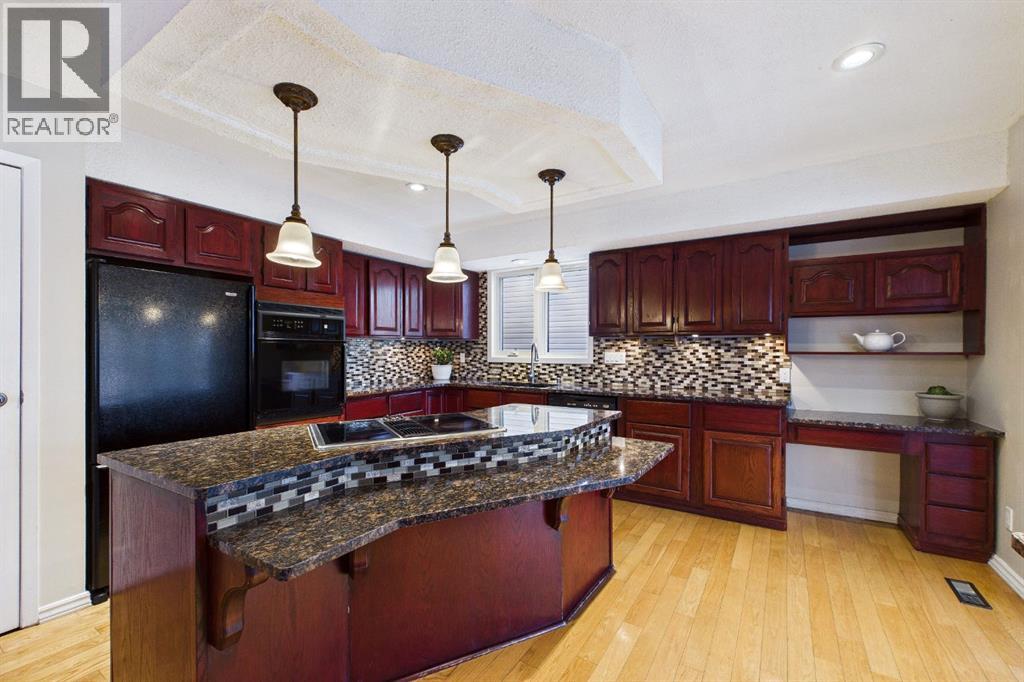 Nestled in a quiet cul-de-sac and backing directly onto the scenic Nose Creek, this spectacular property offers a rare blend of private outdoor tranquility and nearly 2,700 square feet of developed living space. The interior immediately impresses with 14-foot vaulted wood ceilings and a dramatic expanse of west-facing windows that flood the great room—complete with a stone-faced wood-burning fireplace—with natural light. Entertaining is effortless in the granite-clad kitchen and spacious dining area, while the sunroom addition provides a seamless transition to a treed backyard oasis with direct gate access to the creek-side pathway system. This functional home features a primary suite with a three-piece ensuite, two additional main-floor bedrooms, and a massive lower-level family room and rec area. With two more flex rooms and a full bathroom down stairs, this home is great for the growing family. Close to schools, parks and a playground this house is a must-see! (id:51989)