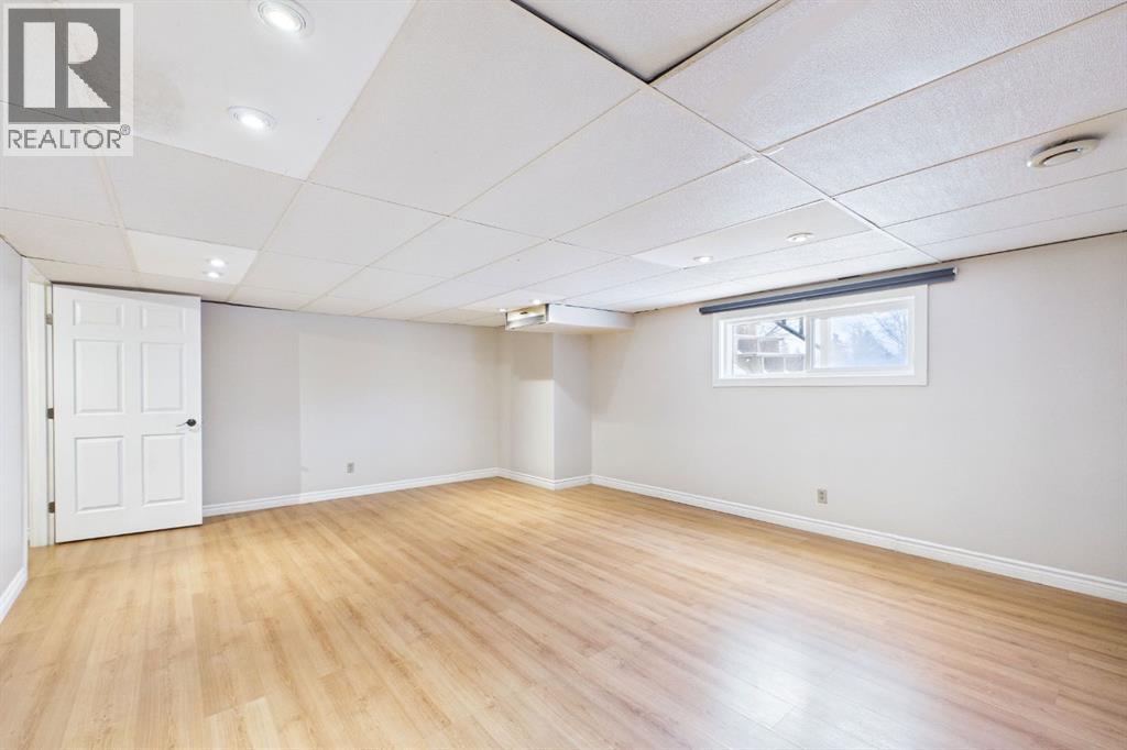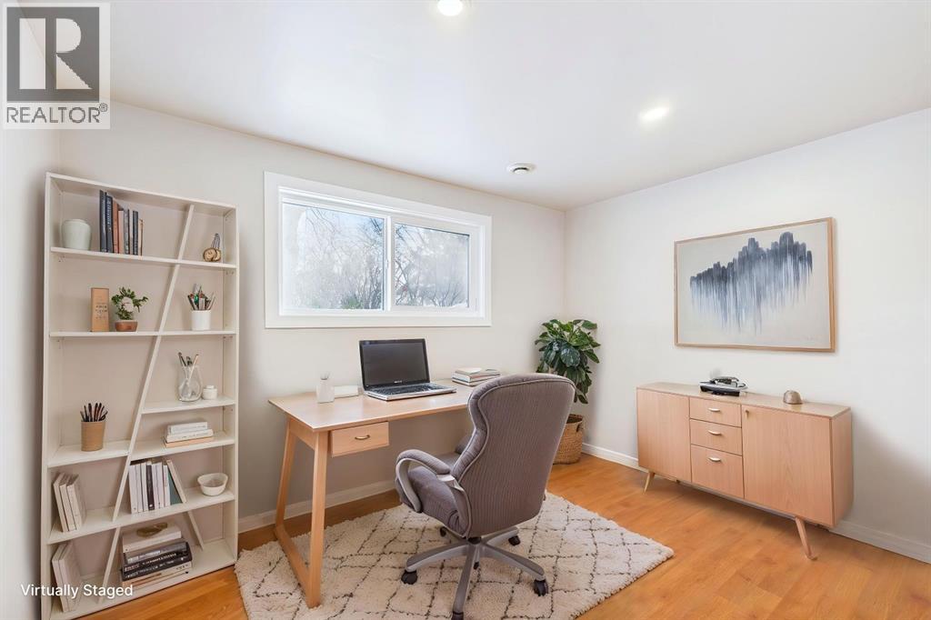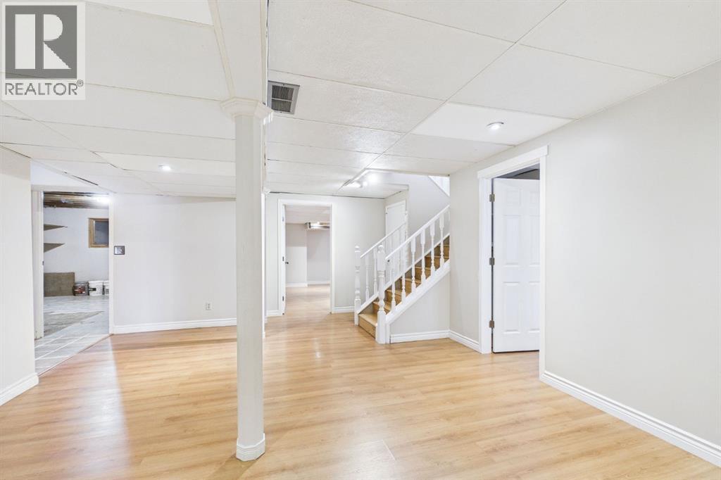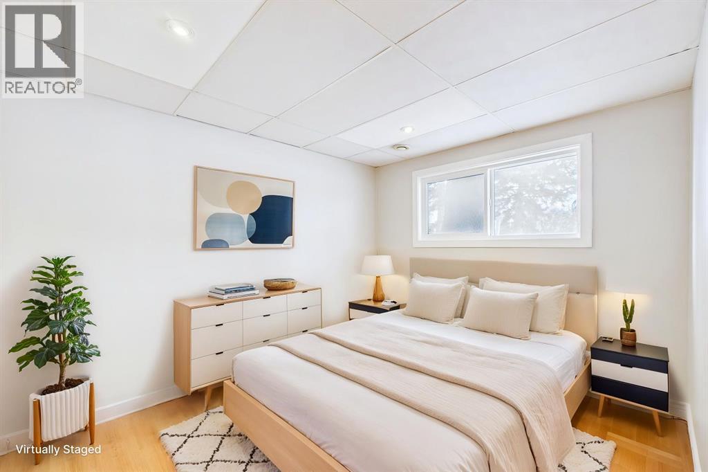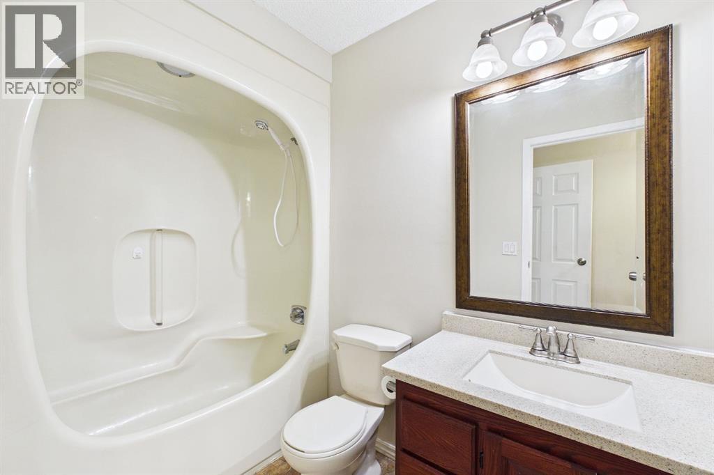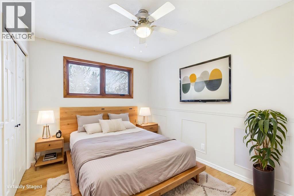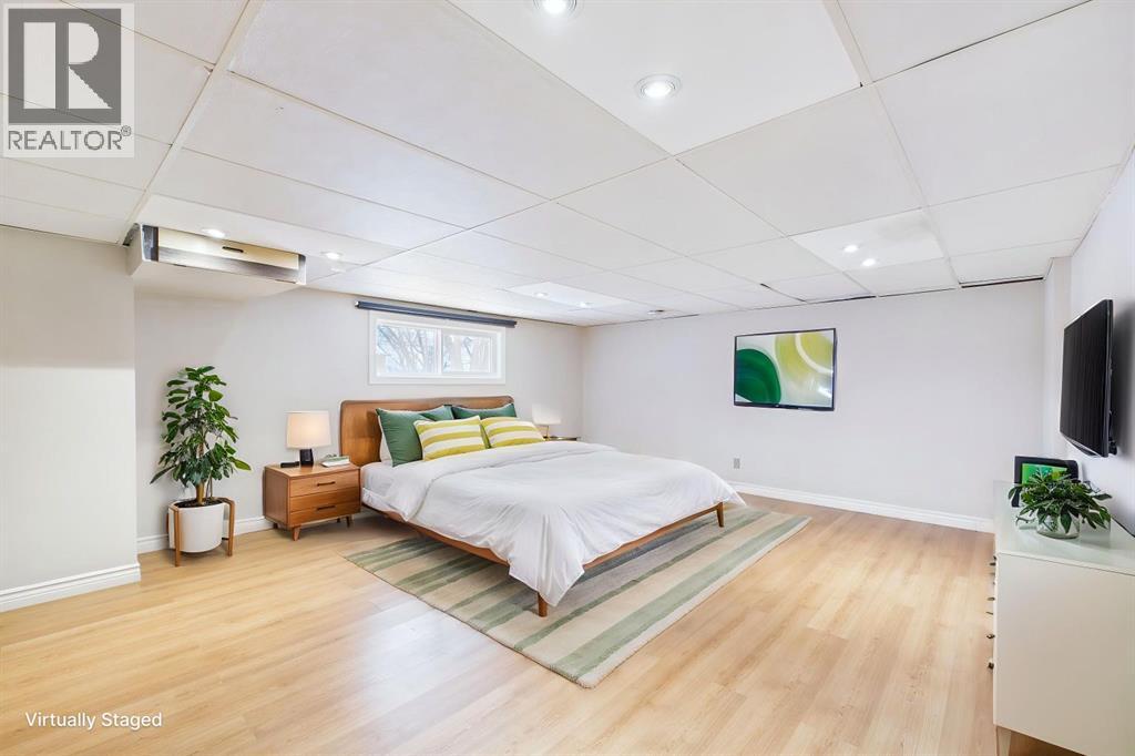 Nestled in a quiet cul-de-sac and backing directly onto the scenic Nose Creek, this spectacular property offers a rare blend of private outdoor tranquility and nearly 2,700 square feet of developed living space. The interior immediately impresses with 14-foot vaulted wood ceilings and a dramatic expanse of west-facing windows that flood the great room—complete with a stone-faced wood-burning fireplace—with natural light. Entertaining is effortless in the granite-clad kitchen and spacious dining area, while the sunroom addition provides a seamless transition to a treed backyard oasis with direct gate access to the creek-side pathway system. This functional home features a primary suite with a three-piece ensuite, two additional main-floor bedrooms, and a massive lower-level family room and rec area. With two more flex rooms and a full bathroom down stairs, this home is great for the growing family. Close to schools, parks and a playground this house is a must-see! (id:51989)