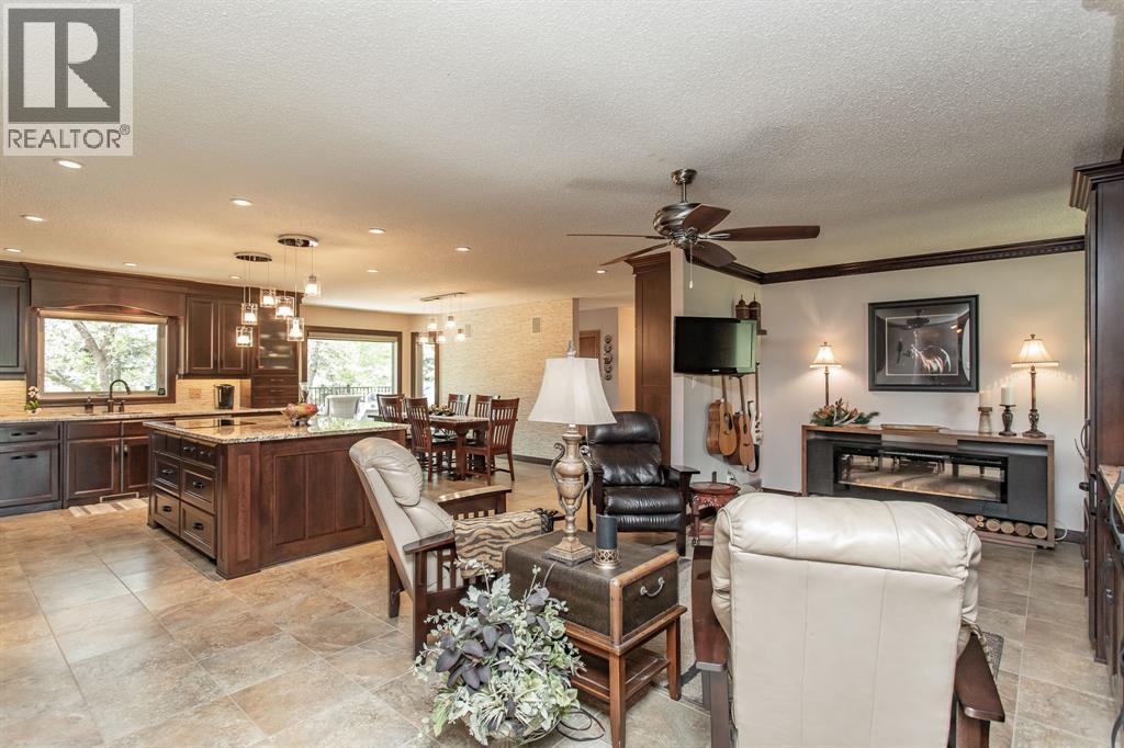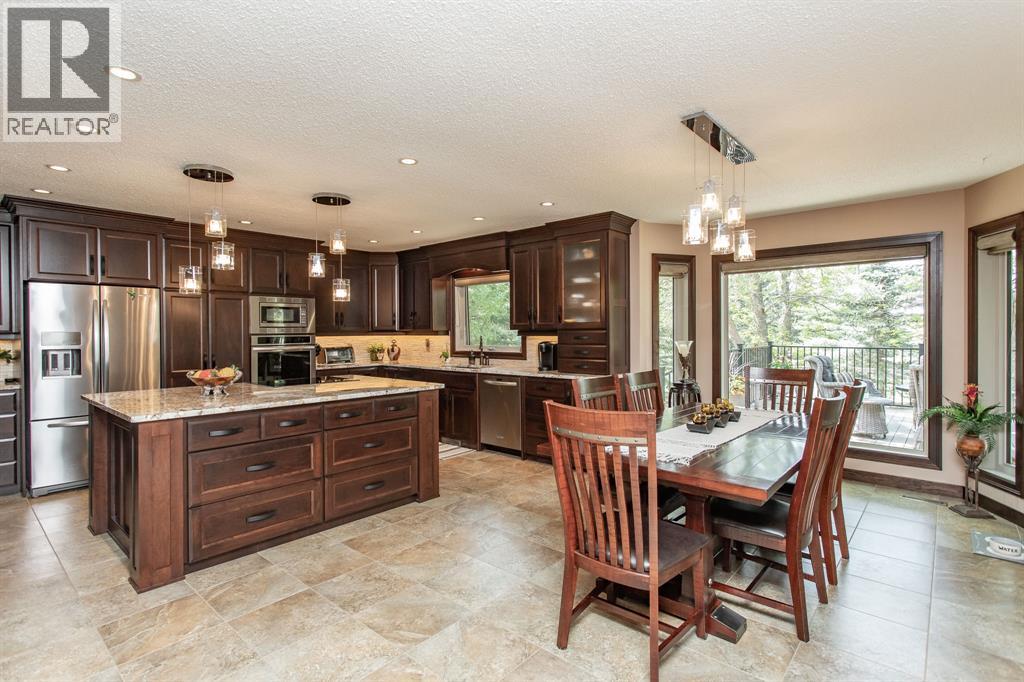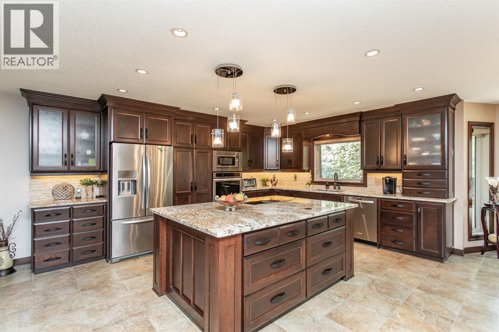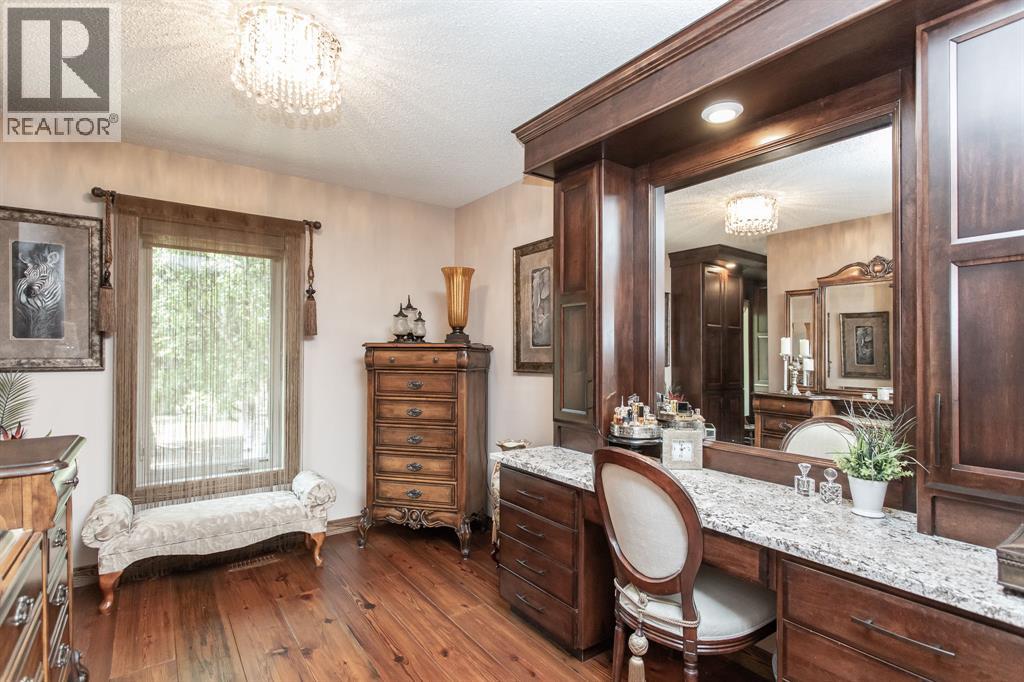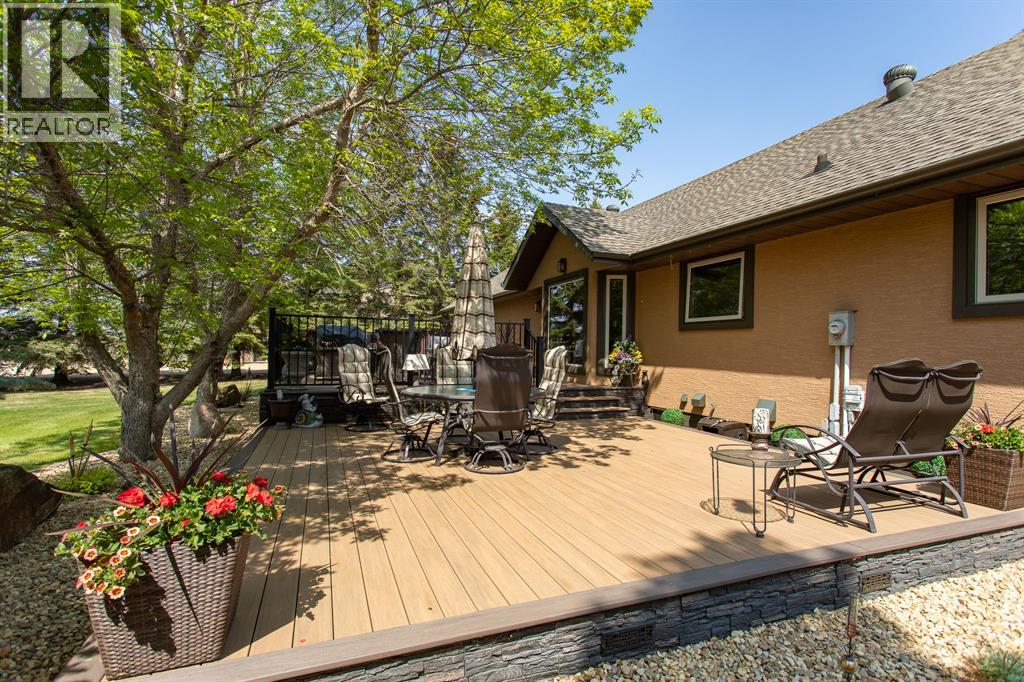 The perfect acreage for the discerning buyer—where unmatched quality, luxury, and lifestyle come together effortlessly. Set on 32 private acres, this extraordinary property features a beautifully renovated 3,100+ sq.ft. bungalow with an attached heated Garage and Workshop, plus a fully equipped 52x70 detached shop. Every want is fulfilled—from refined interior finishes to exceptional outdoor space, privacy, and functionality. This is a property that exceeds expectations, offering a rare combination of sophistication, space, and seclusion for those who value excellence in every detail. Completely renovated from top to bottom, including brand new furnaces and water tanks, this home reflects careful craftsmanship throughout. From the 200-year-old reclaimed hardwood floors to the sprinkler system servicing the spruce trees on the berm along the south side of the driveway, every element has been thoughtfully selected and executed by Central Alberta’s skilled tradespeople. The spacious Chef’s Kitchen features granite counters, a massive centre island, upgraded stainless appliances including an induction stove, and custom cabinetry throughout—including a rich dark cherrywood wall pantry. Grouted vinyl tile floors, LED and recessed lighting, and a travertine backsplash (which continues on a striking feature wall in the Dining Area) contribute to the home’s refined atmosphere. The attached Sitting Room is ideal for after-dinner conversation, while the Living Room—anchored by a true wood-burning masonry fireplace—offers a warm and inviting space to unwind while taking in the East-facing views. When it’s time to entertain, head downstairs to the Theatre Room with a 98” screen and wet bar, or step outside onto the expansive 1,000 sq.ft. west-facing Wolf-brand deck, complete with powder-coated aluminum railings and LED lighting on every post, all backing onto the peaceful beauty of Jones Creek. The main floor features three Bedrooms, including an exceptional Primary Suit e with dual vanities, a tiled rain shower, and a luxurious Dressing Room with built-in makeup vanity and an impressive walk-in closet finished with custom wood cabinetry for organized storage. The attached heated Double Garage and 15x22 Workshop with in-floor heat provide flexibility for hobbies, projects, or additional storage. The 52x70 detached shop is equally impressive, complete with a Bathroom, radiant gas heat, and two 14x14 overhead electric doors—ideal for business use or substantial recreational storage. Additional highlights include energy-efficient triple-pane windows, updated electrical and plumbing, Hunter Douglas blinds, solid core interior doors, and a custom stone pillar security gate at the entrance. Surrounded by mature trees and backing onto Jones Creek, this acreage offers remarkable privacy just 10 minutes from Red Deer.Properties of this caliber are rare—this is a distinctive opportunity to own one of Central Alberta’s (id:51989)