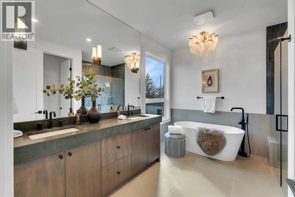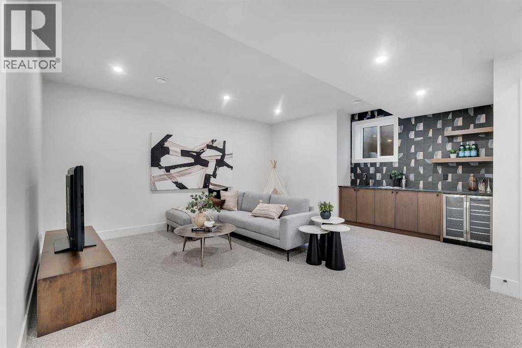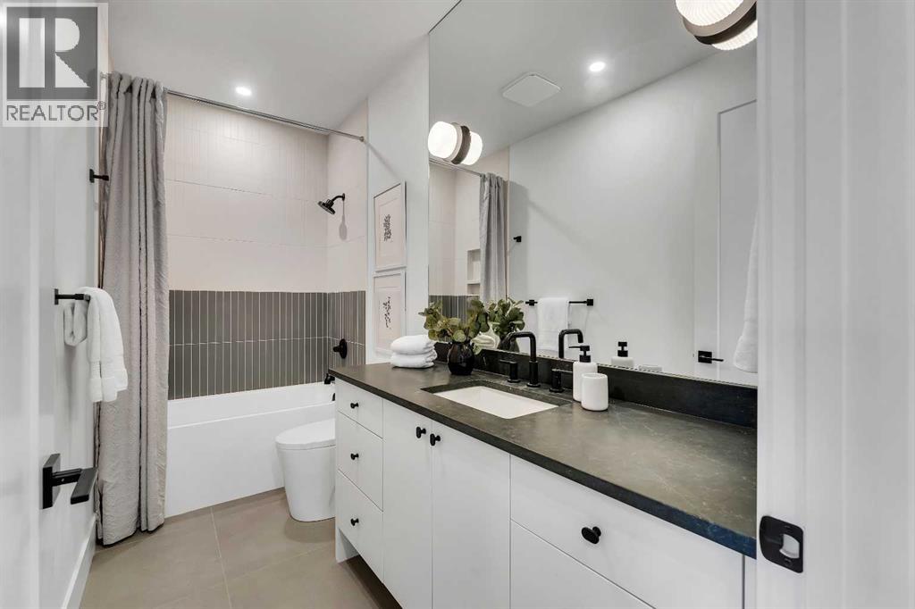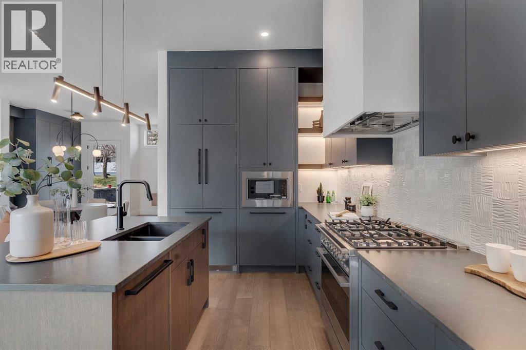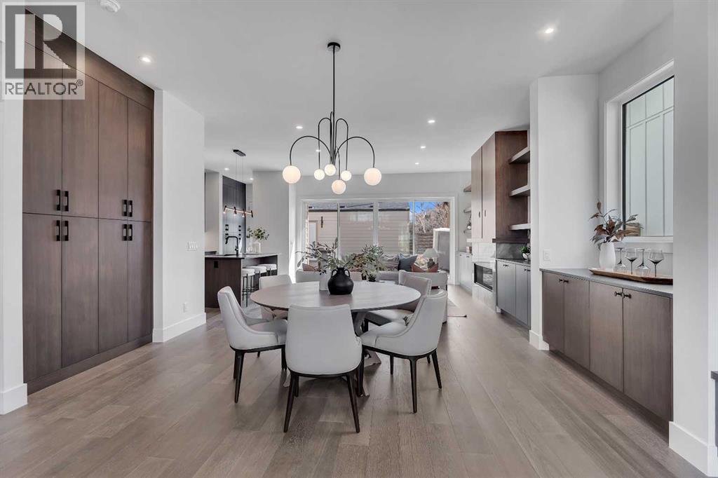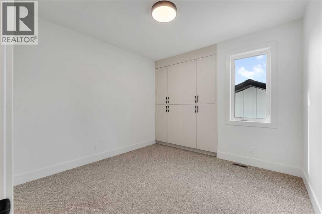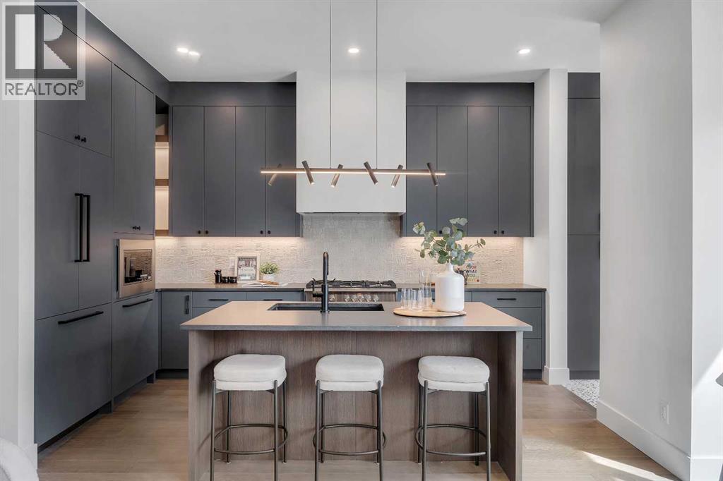 A statement of inner city luxury, this extra-wide residence by Ambedo Custom Homes and Stephanie Martin Interior Design redefines the duplex category. Moving beyond the generic "spec-build" aesthetic, the home embraces a "dark-themed serenity" that feels deeply personal and curated. Every element, from the custom tiling throughout to the specialized party wall engineered for a level of quiet not found in standard builds, has been selected for the homeowner who values both scale and quality.The main level features 10-foot ceilings that soar over a chef-inspired kitchen defined by its moody allure and intentional design. The space is anchored by a professional 36" gas range, panel-ready Fisher & Paykel appliances, and bespoke cabinetry. Natural light pours through 14-foot architectural patio doors, dissolving the boundary between the sophisticated interior and the south-facing backyard.The vaulted primary retreat serves as a sanctuary, joined by two additional large bedrooms. Intentionally designed without a secondary suite, the lower level is dedicated entirely to personal use, offering a massive recreation area and custom wet bar.Wrapped in a striking metal and stucco facade with a double garage, you are a short stroll from the Westbrook CTrain station and vibrant new coffee shops. Discover the exclusivity of a designer-led, extra-wide build—book your tour today. (id:51989)