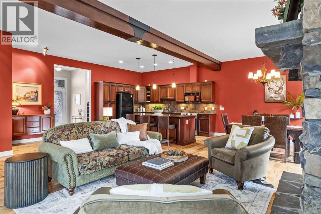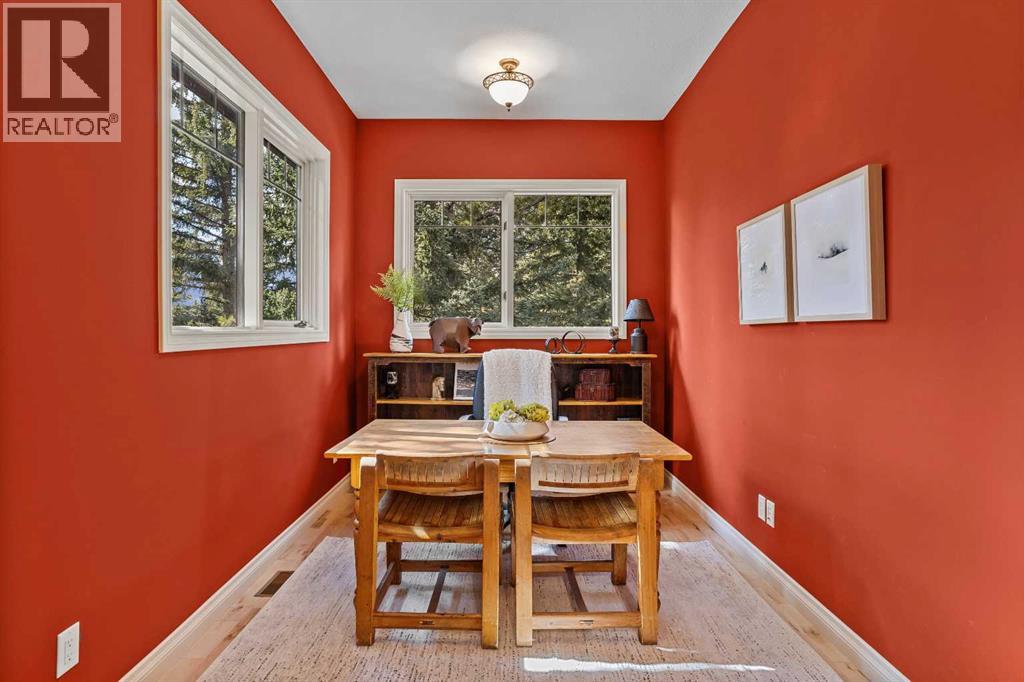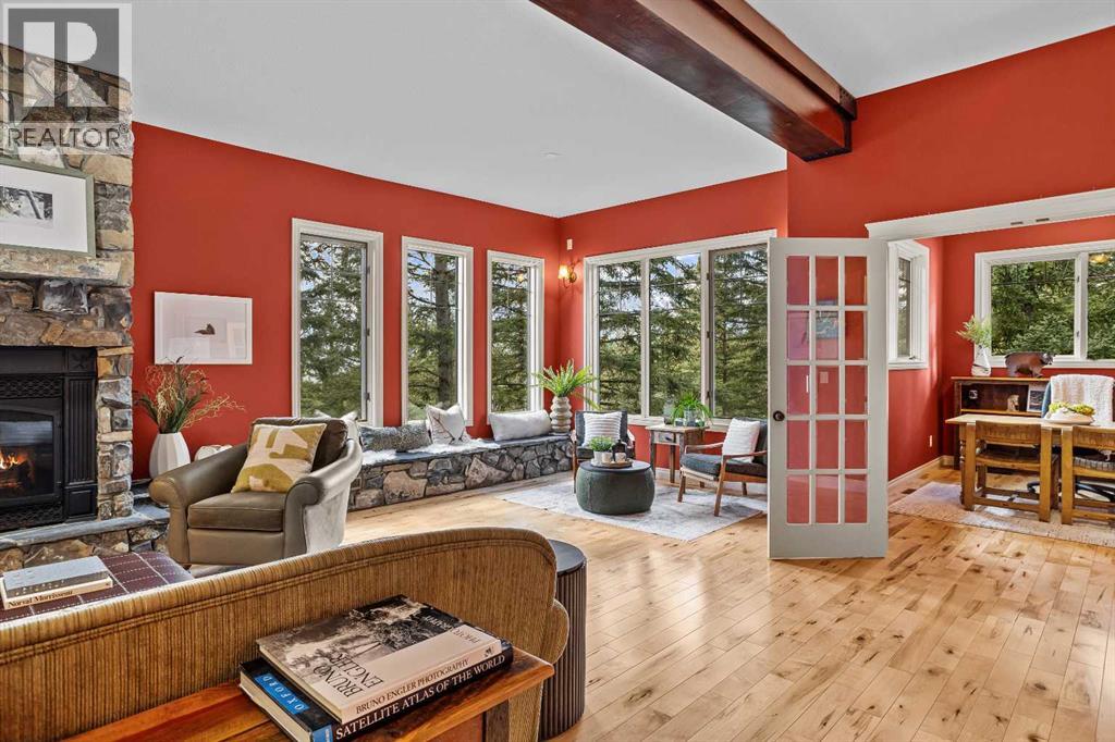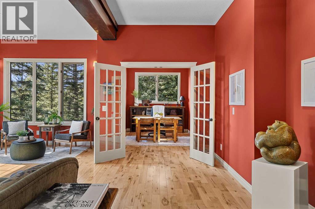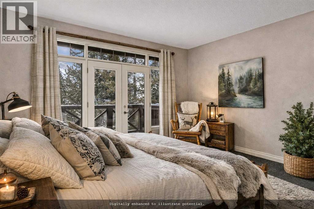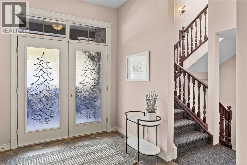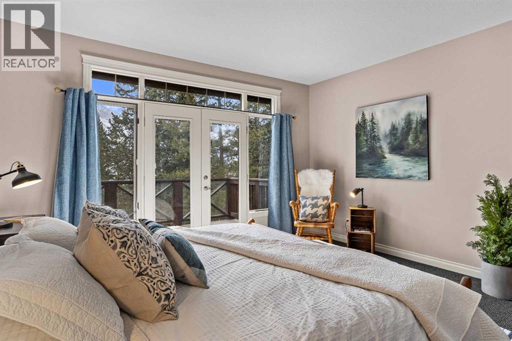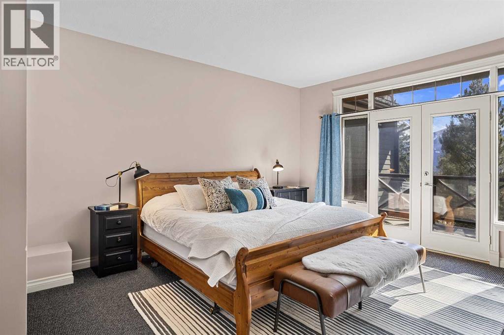 Some properties in Canmore have a great view. This one has the whole picture.Sitting at the quiet end of Stone Creek Road, this 3,000+ sq ft southwest-facing end-unit is perched up in the trees above the Bow Valley, looking out over the 9th tee of Silvertip Golf Course and the full south range beyond. Walk out your front door and you are straight onto the trail network. No neighbours behind, no traffic coming through, just the creek, the trees, and the mountains in every direction.From the moment you step inside, the pace of life slows down. The main floor is anchored by a Rundlestone fireplace, with big windows that bring the outside in and an open-concept kitchen and dining area designed for easy entertaining, framing uninterrupted views of the valley below from morning through to sunset. Tucked into the trees on the main level, a window-wrapped office offers a genuinely inspiring place to spend a morning.Upstairs, a tranquil sitting area gazes over the creek bed toward the peaks, alongside 2 spacious bedrooms and a primary retreat with a private balcony and elevated mountain views. The steam shower ensuite adds a layer of comfort that makes this space feel like a proper escape from the everyday.The walkout lower level includes a 3rd bedroom and a generous unfinished space with in-floor heating already roughed in, offering real potential for a 4th bedroom, media room, or whatever your lifestyle calls for. Large windows and direct patio access keep it bright and connected to the outdoors.With the Silvertip clubhouse, restaurant, and market just a short walk away and Canmore's trail network right at your door, this property offers a balance that is genuinely hard to find in the mountains. Privacy without isolation. Tranquility without compromise. Properties at this end of the road, up in the trees with this kind of setting, do not come available often. (id:51989)