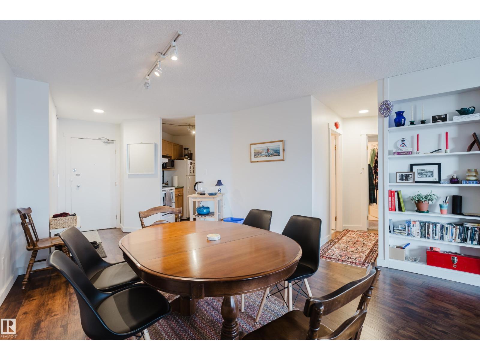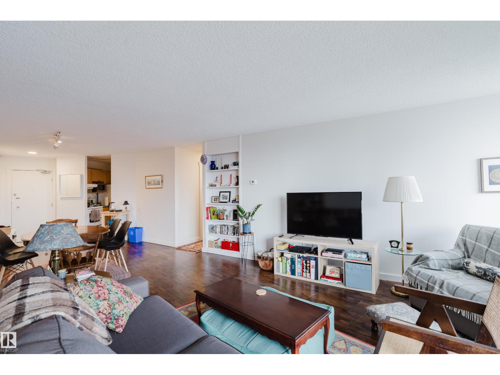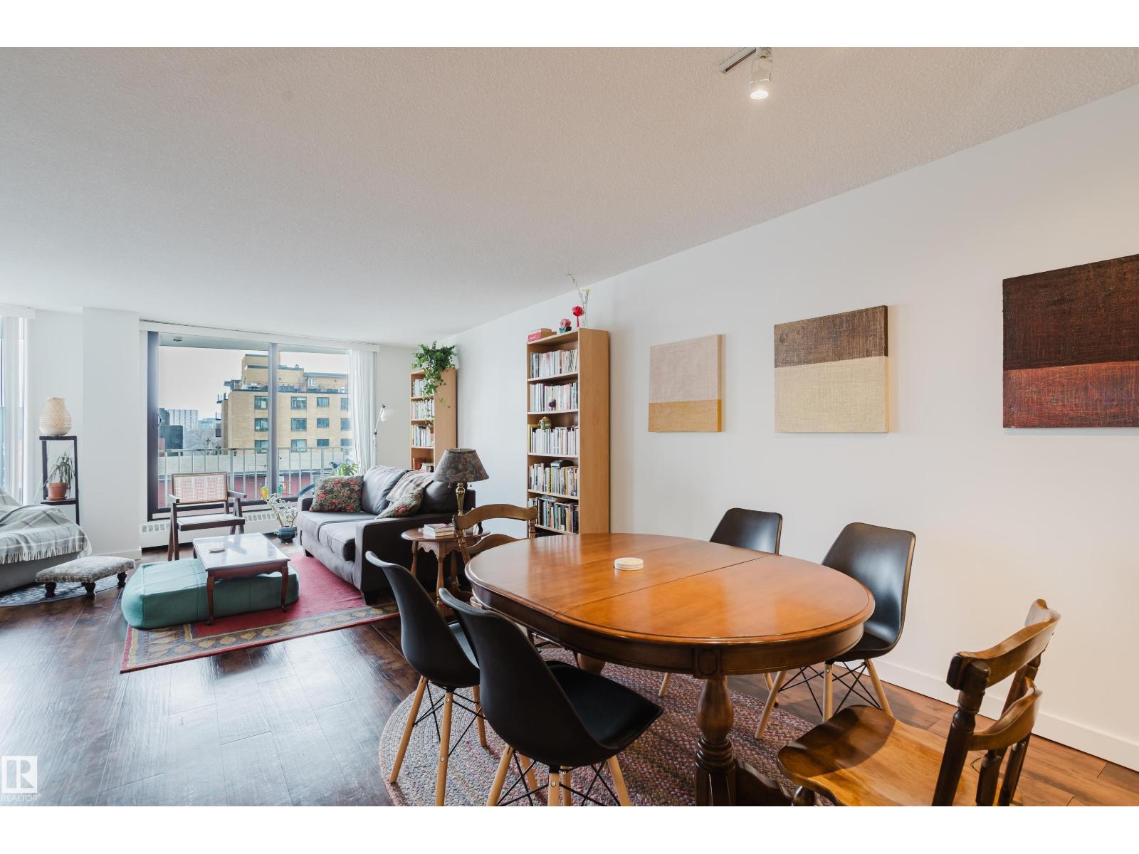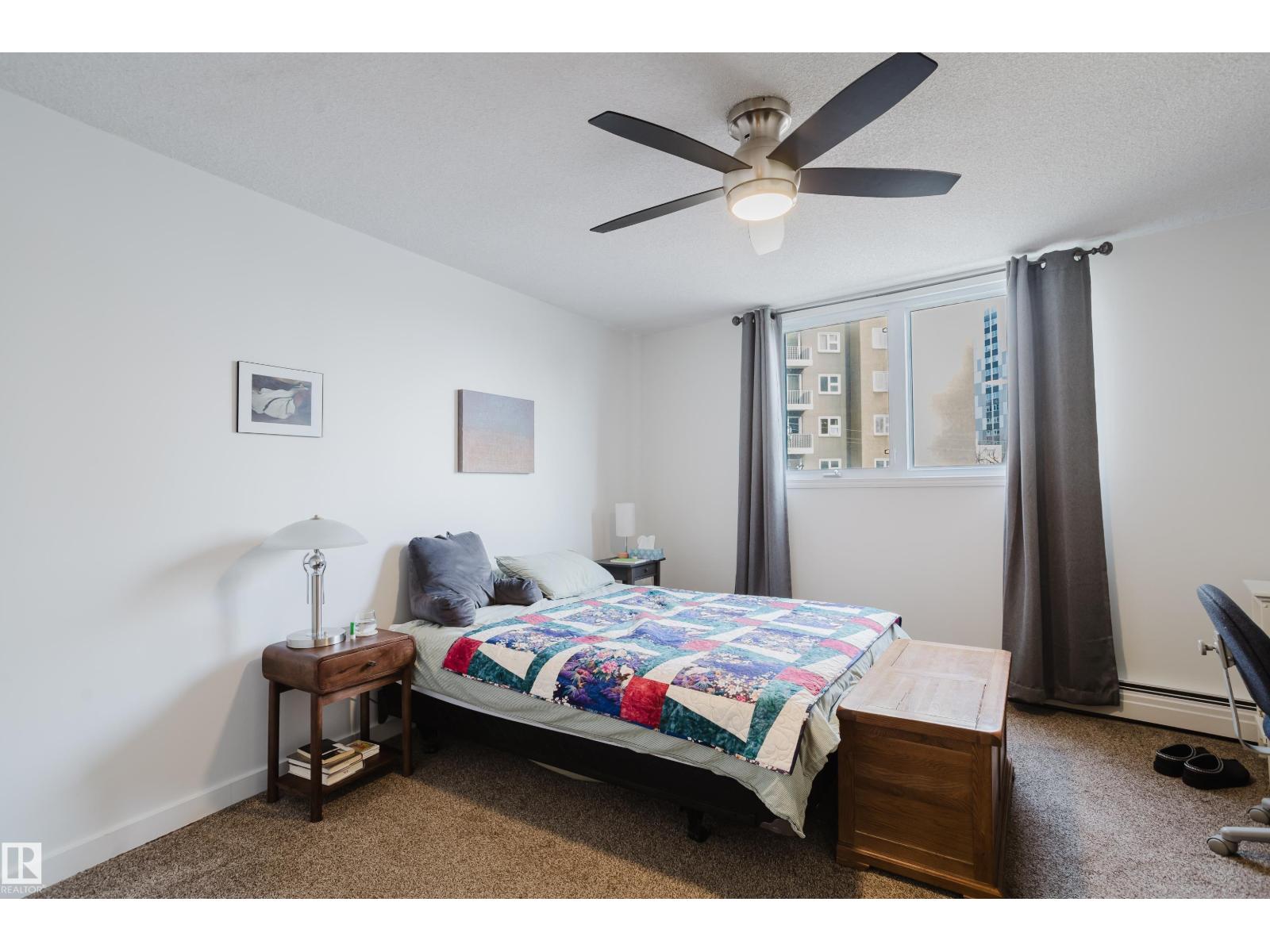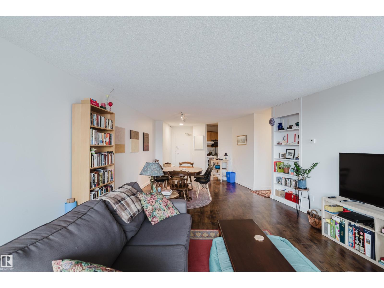 Turnkey 1,013 sq.ft. 2 bedroom, 2 bathroom condo with titled underground parking in a solid concrete high rise just steps from the river valley and Jasper Avenue. The layout offers well-separated bedrooms, ideal for shared living, guests, or a home office, along with a spacious primary suite and flexible second bedroom. Bright south-facing exposure fills the large living and defined dining areas, creating a comfortable space for everyday living and entertaining. The efficient kitchen supports low-maintenance urban living. Enjoy a full amenity building with pool, gym, sauna, library, visitor parking, same-floor laundry, and garbage chute access. Condo fees include all utilities, offering simple, predictable ownership in one of Edmonton’s most walkable central locations. (id:51989)