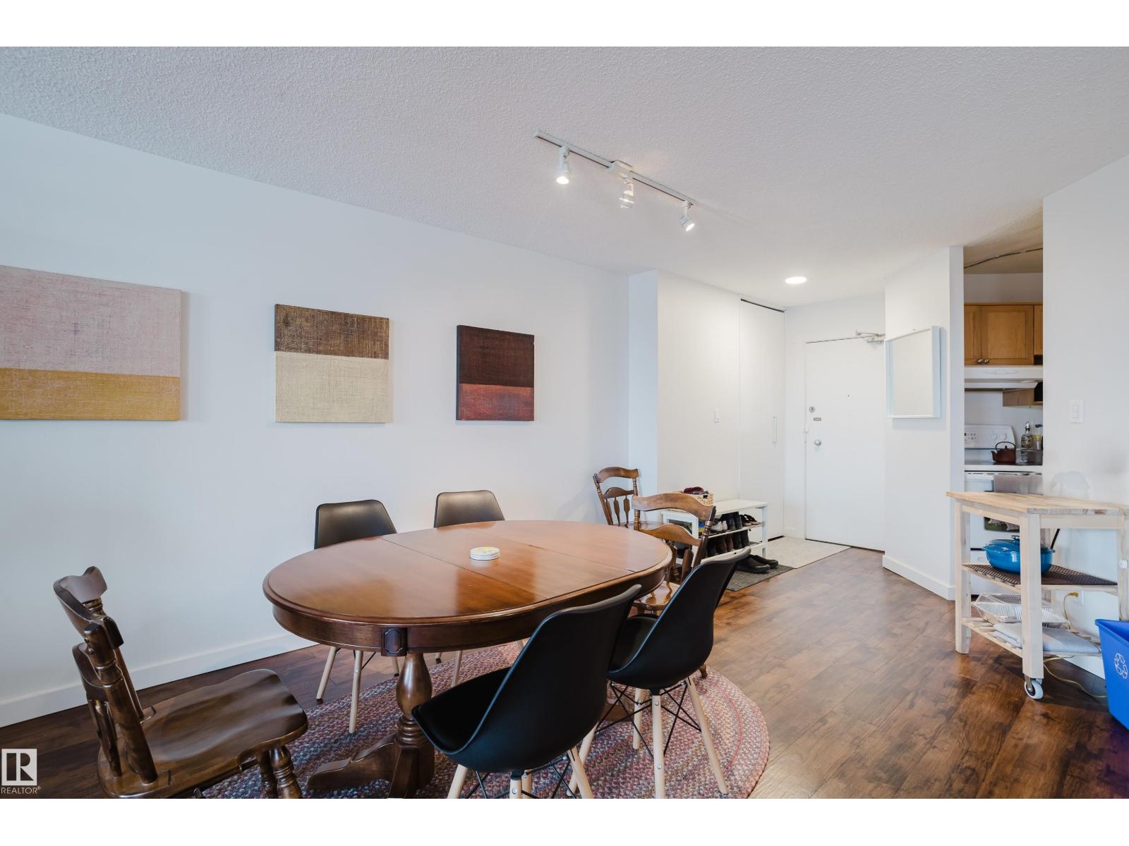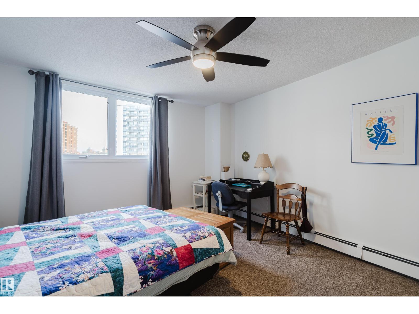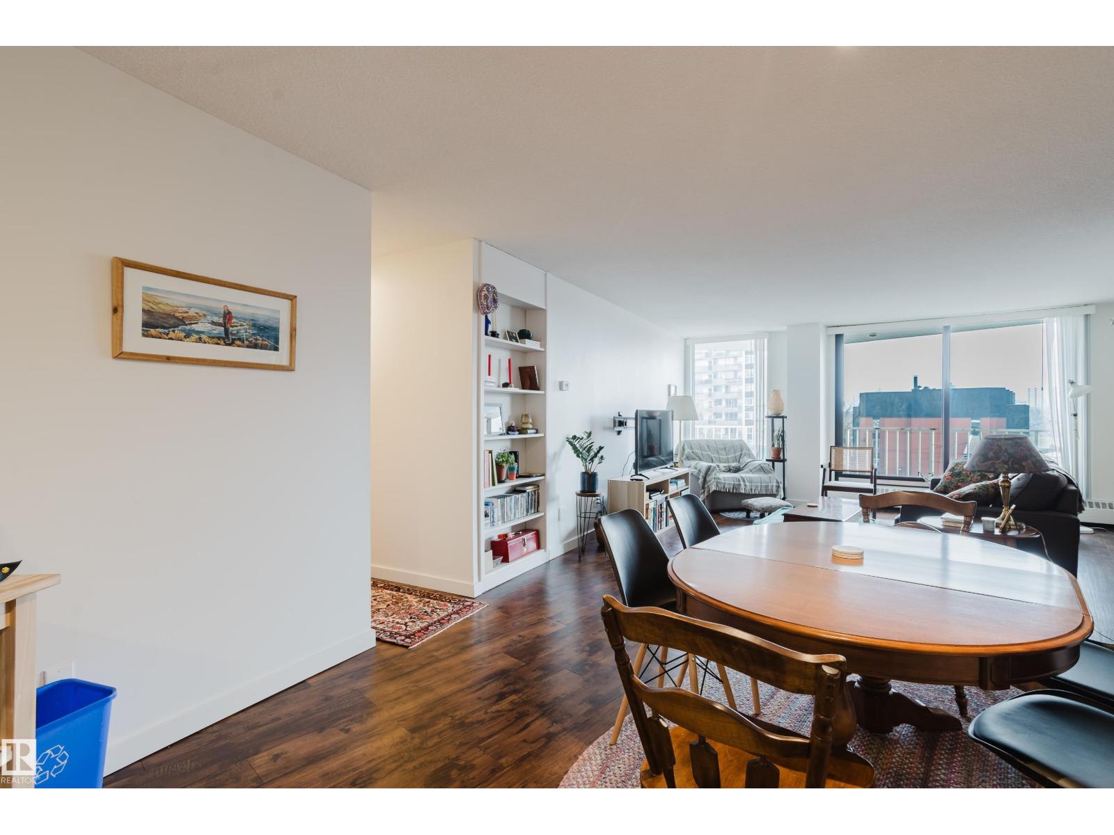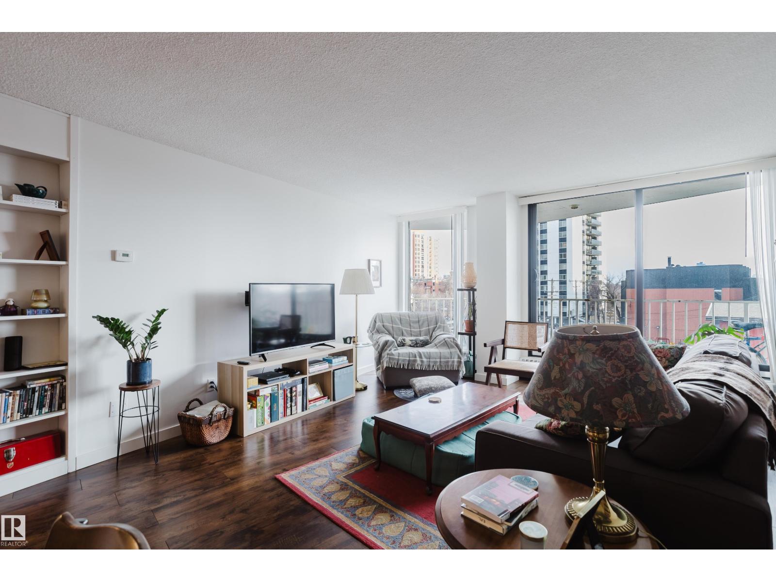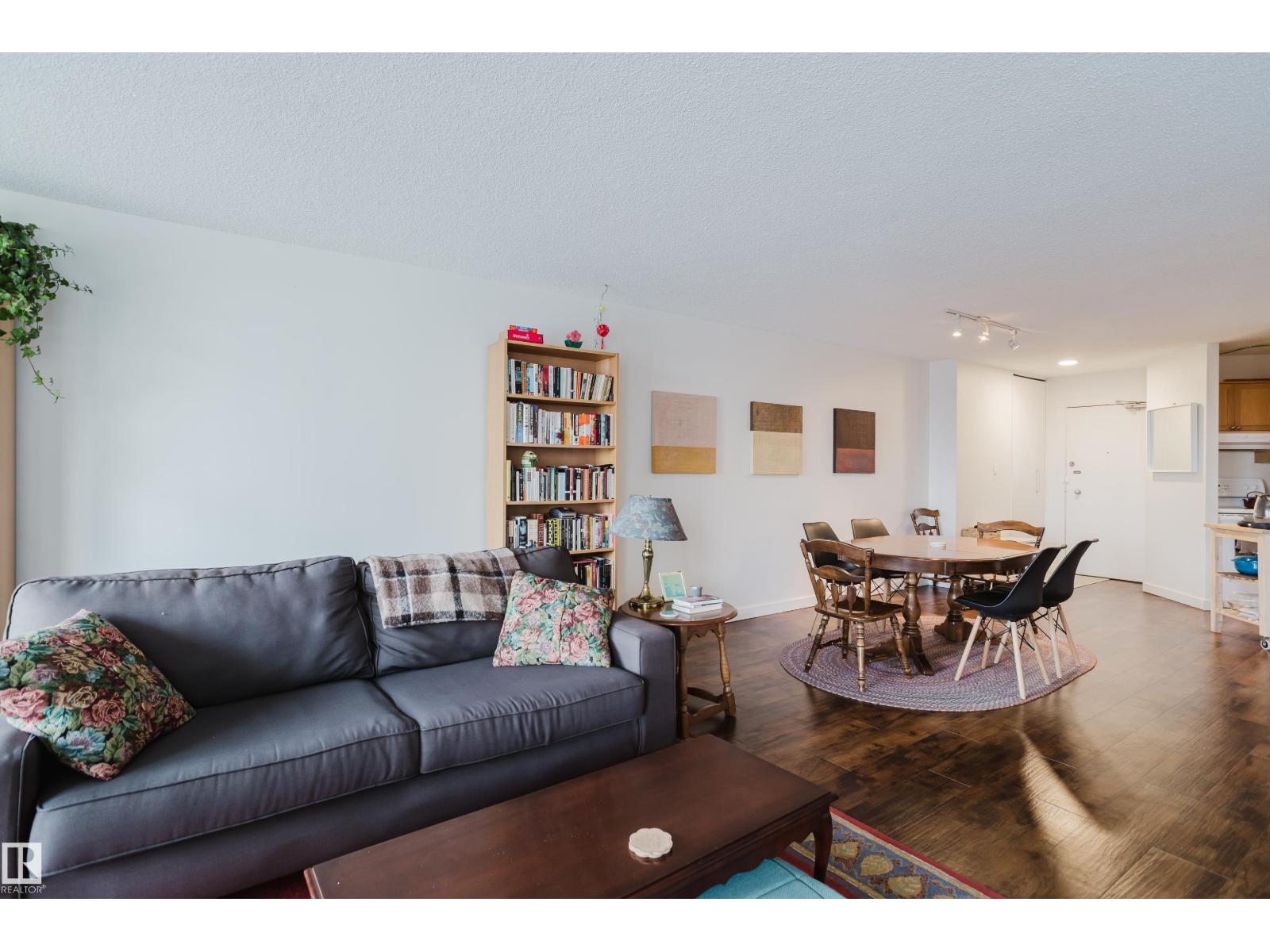 Turnkey 1,013 sq.ft. 2 bedroom, 2 bathroom condo with titled underground parking in a solid concrete high rise just steps from the river valley and Jasper Avenue. The layout offers well-separated bedrooms, ideal for shared living, guests, or a home office, along with a spacious primary suite and flexible second bedroom. Bright south-facing exposure fills the large living and defined dining areas, creating a comfortable space for everyday living and entertaining. The efficient kitchen supports low-maintenance urban living. Enjoy a full amenity building with pool, gym, sauna, library, visitor parking, same-floor laundry, and garbage chute access. Condo fees include all utilities, offering simple, predictable ownership in one of Edmonton’s most walkable central locations. (id:51989)