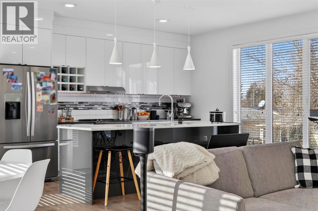 Welcome to this exceptional end-unit townhouse in the established and historic community of Bowness. Offering the rare combination of an end unit location and an attached double garage, this home provides both added privacy and convenience. The spacious lower level welcomes you with a bright foyer and a convenient 2-piece bathroom, creating a functional entry space for guests and daily living. Upstairs, the main living area is flooded with natural light thanks to the end-unit positioning. The open-concept layout features a beautiful living room, a generous dining area, and a well-appointed kitchen complete with an island, stone countertops, and stainless steel appliances. The upper level offers a spacious primary bedroom with a walk-in closet and private ensuite. Two additional well-sized bedrooms, a full bathroom, and a dedicated laundry room complete the upper floor, providing excellent functionality for families or professionals alike. Enjoy outdoor living with a balcony off the main floor and a patio off the lower level that opens directly onto a playground, an ideal setting for young families. Perfectly situated, this home is just minutes from multiple retail plazas offering grocery stores, cafes, and dining options. You are also a short drive to Bowness Park, one of Calgary’s most beloved parks, with access to the scenic Bow River Pathway. This is a fantastic opportunity for young families or professionals looking for comfort, convenience, and an outstanding location. (id:51989)