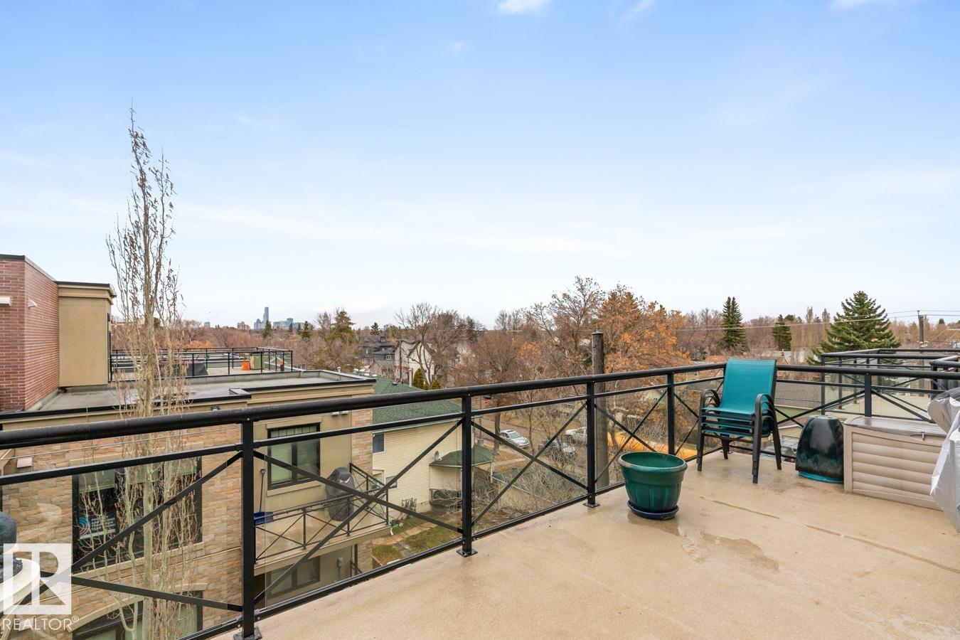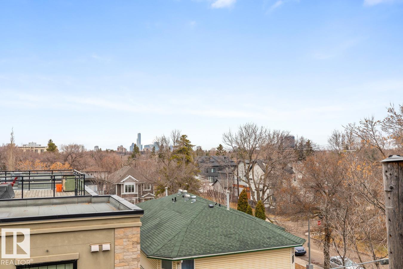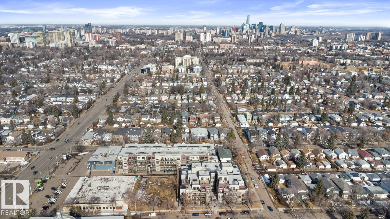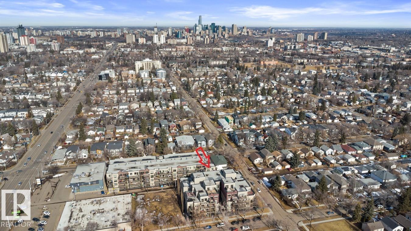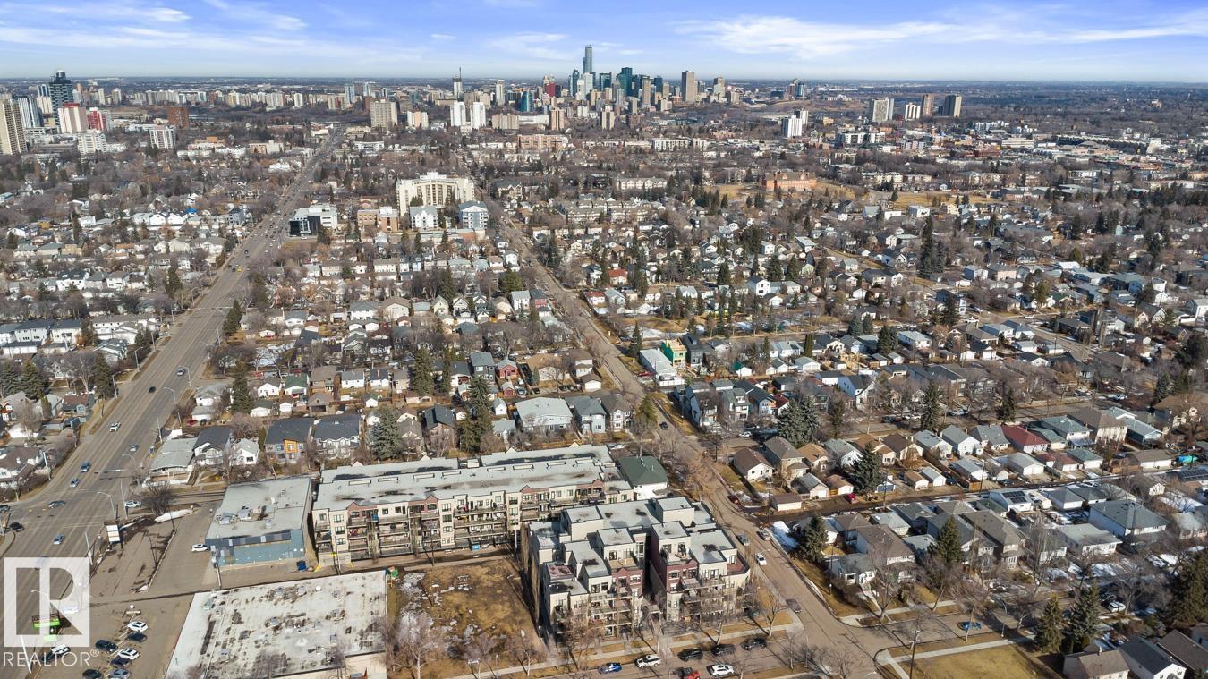 Top floor living in a beautiful Brownstone! This spacious 2 bed, 1 bath open-concept condo offers 9' ceilings, A/C, hardwood floors, fresh paint, and an immaculate interior. The inviting space features a stunning electric fireplace and flows onto a huge private balcony with downtown views - perfect for relaxing or entertaining. Both bedrooms are generously sized, and the large bathroom includes a soaker tub and separate shower. Enjoy in-suite laundry, plus a titled underground heated parking stall with storage cage. Located in a secure, pet-friendly building on tree-lined streets in a sought-after neighbourhood with shopping nearby. Ideal for professionals, students or investors; just minutes to Whyte Ave, U of A, downtown, and the Whitemud. (id:51989)