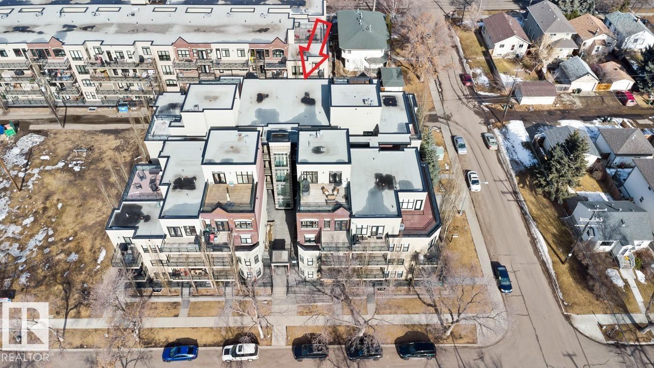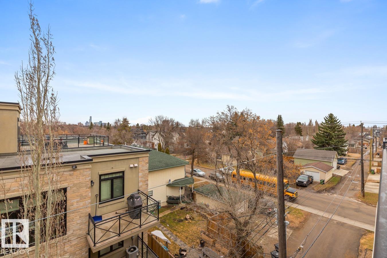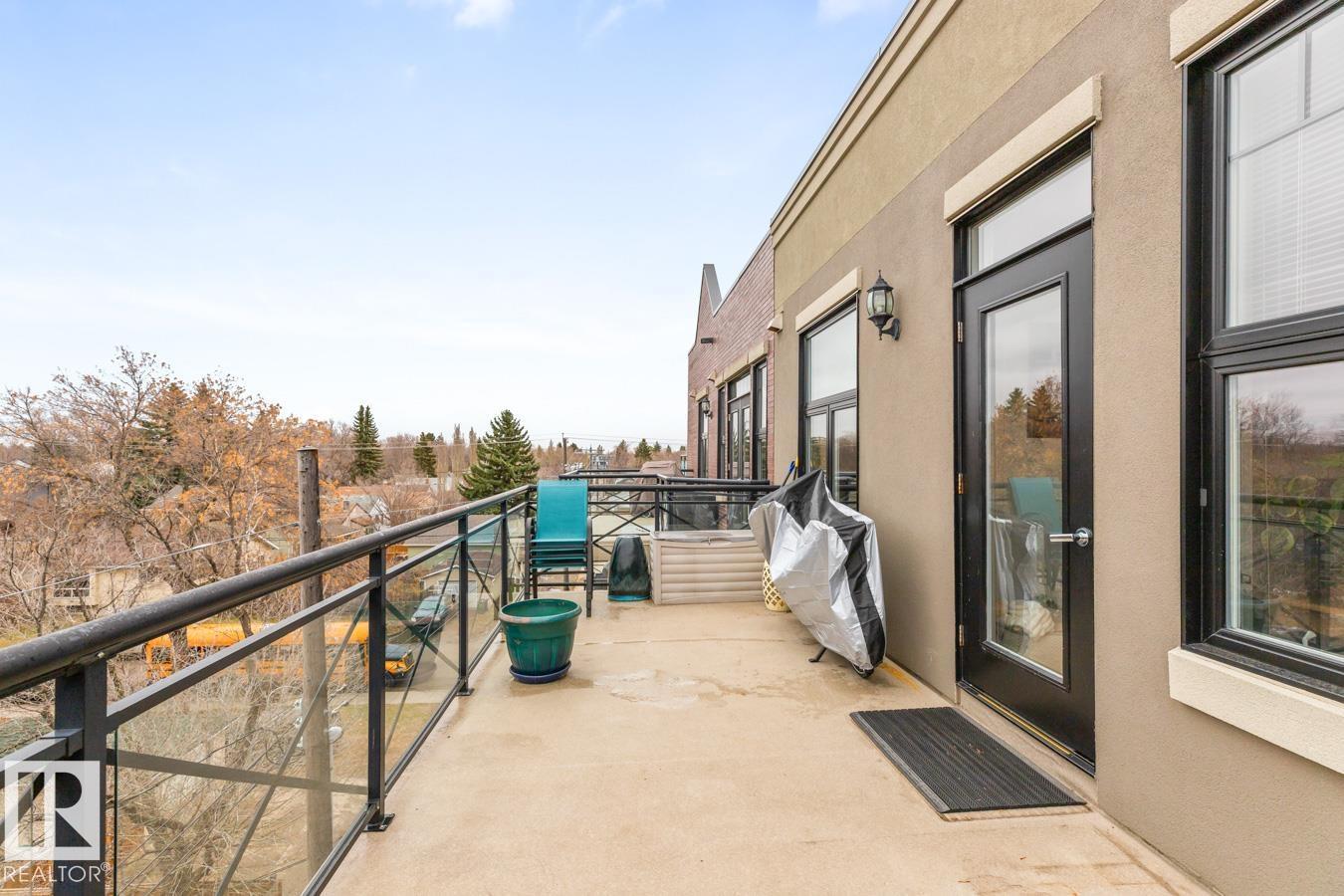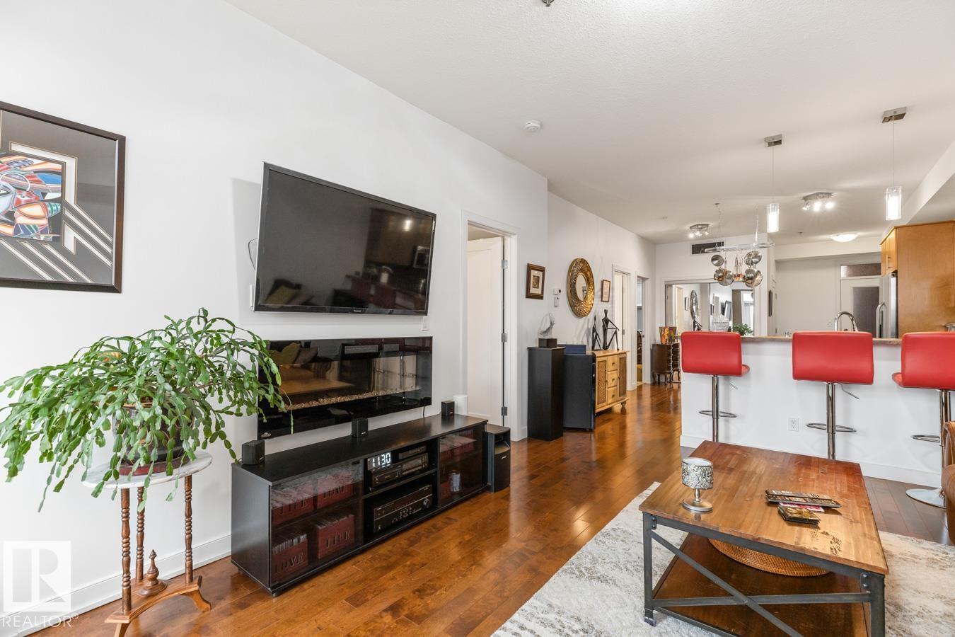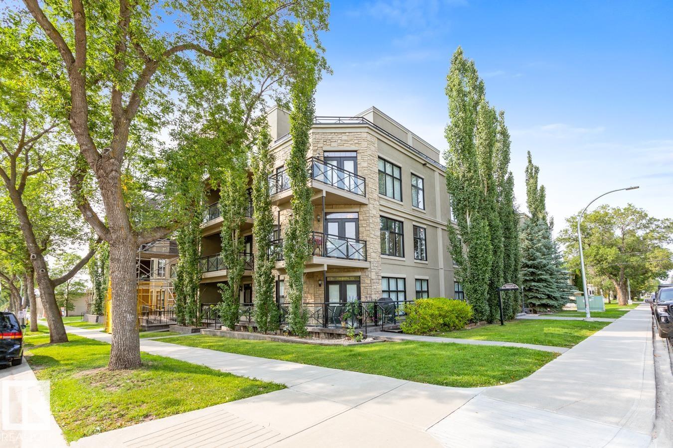 Top floor living in a beautiful Brownstone! This spacious 2 bed, 1 bath open-concept condo offers 9' ceilings, A/C, hardwood floors, fresh paint, and an immaculate interior. The inviting space features a stunning electric fireplace and flows onto a huge private balcony with downtown views - perfect for relaxing or entertaining. Both bedrooms are generously sized, and the large bathroom includes a soaker tub and separate shower. Enjoy in-suite laundry, plus a titled underground heated parking stall with storage cage. Located in a secure, pet-friendly building on tree-lined streets in a sought-after neighbourhood with shopping nearby. Ideal for professionals, students or investors; just minutes to Whyte Ave, U of A, downtown, and the Whitemud. (id:51989)