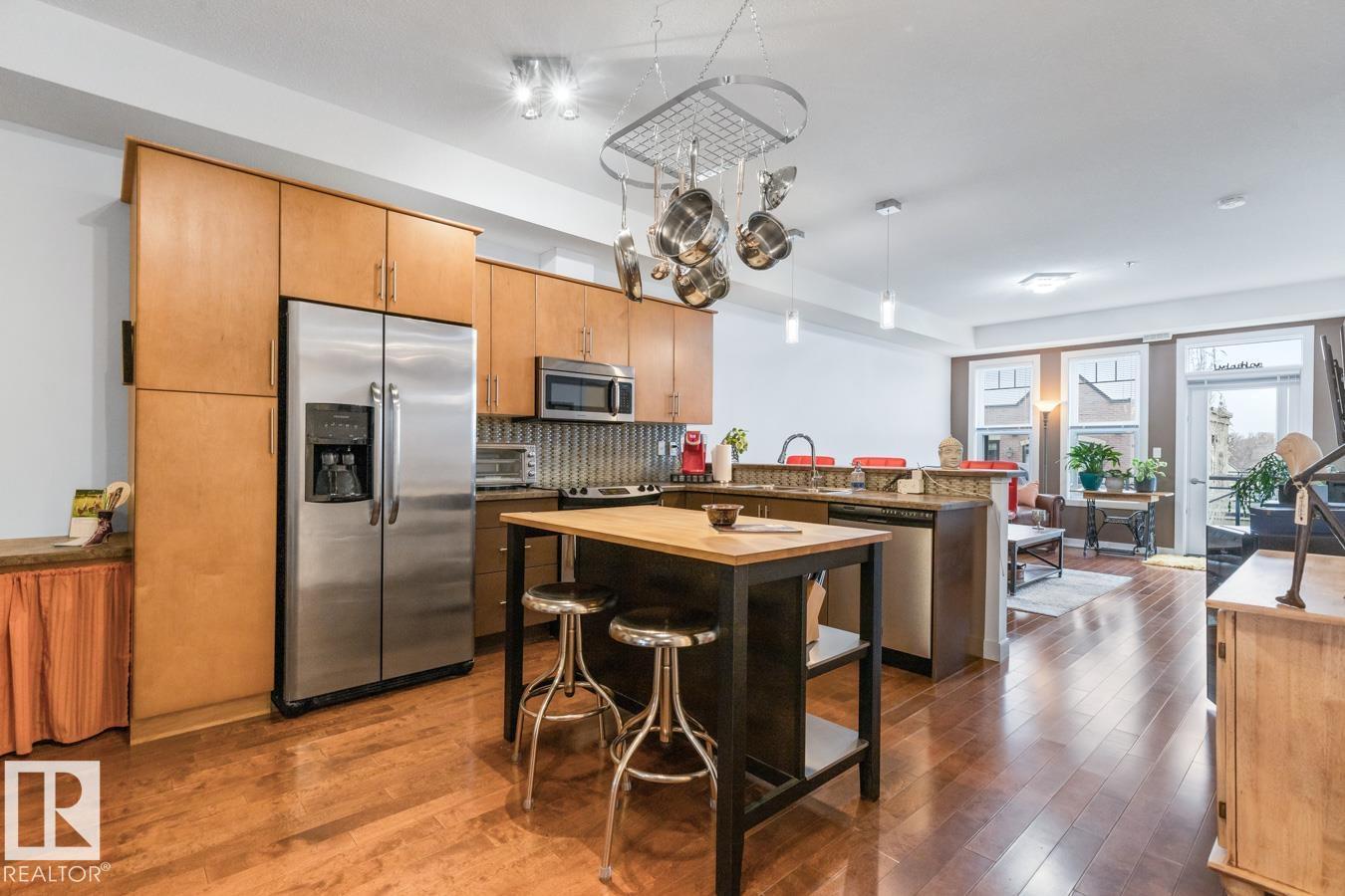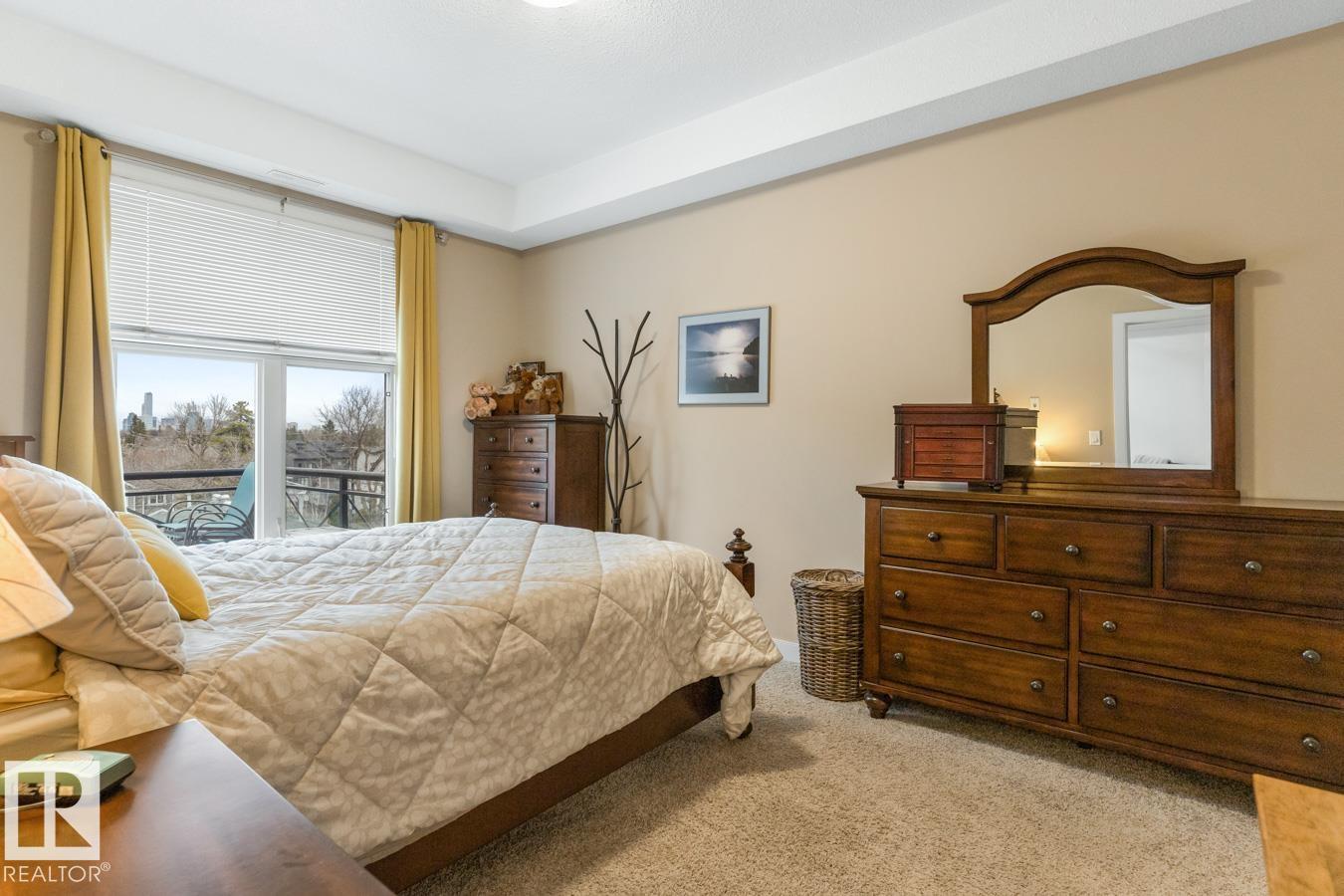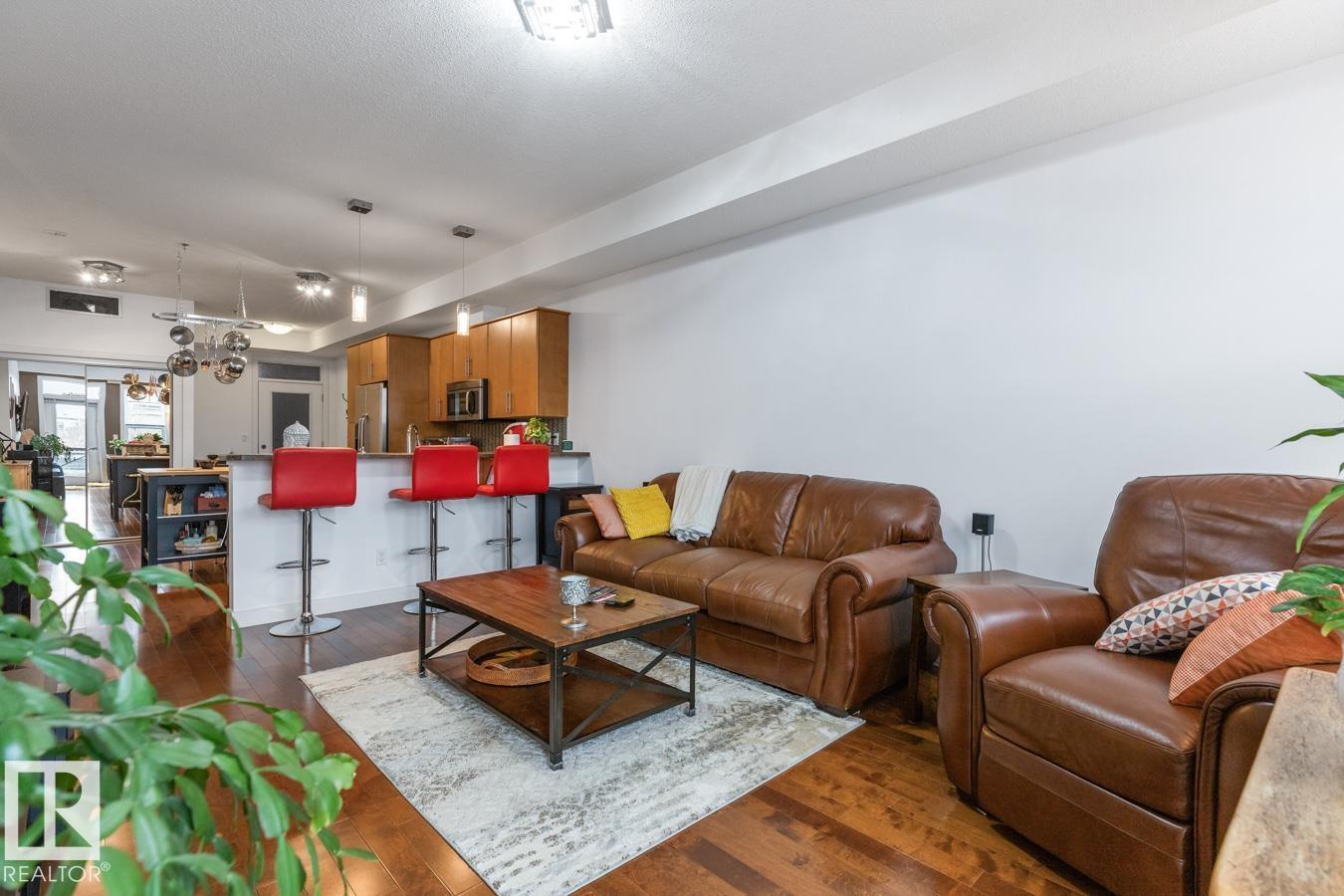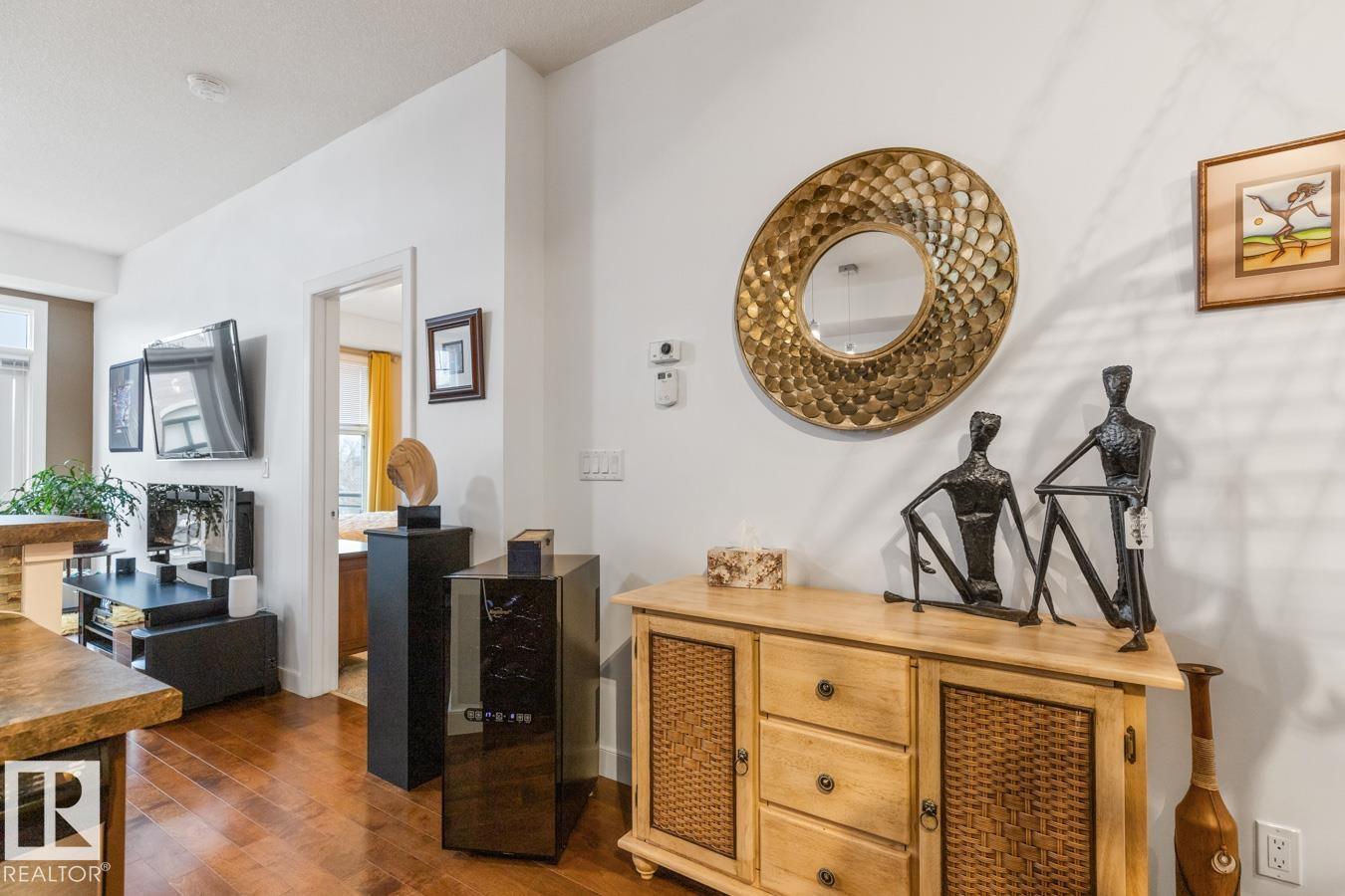 Top floor living in a beautiful Brownstone! This spacious 2 bed, 1 bath open-concept condo offers 9' ceilings, A/C, hardwood floors, fresh paint, and an immaculate interior. The inviting space features a stunning electric fireplace and flows onto a huge private balcony with downtown views - perfect for relaxing or entertaining. Both bedrooms are generously sized, and the large bathroom includes a soaker tub and separate shower. Enjoy in-suite laundry, plus a titled underground heated parking stall with storage cage. Located in a secure, pet-friendly building on tree-lined streets in a sought-after neighbourhood with shopping nearby. Ideal for professionals, students or investors; just minutes to Whyte Ave, U of A, downtown, and the Whitemud. (id:51989)
