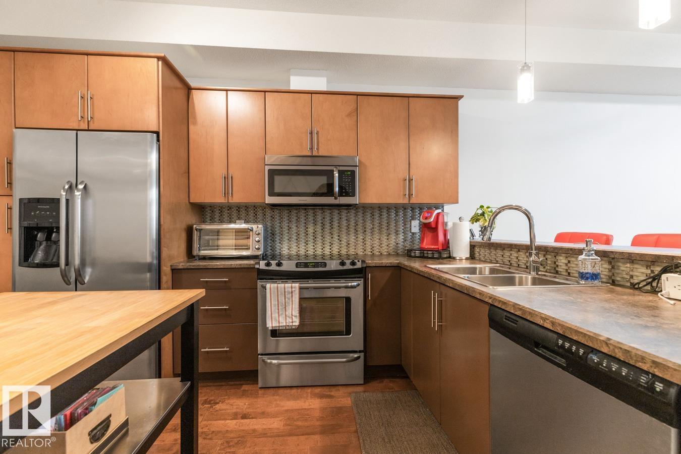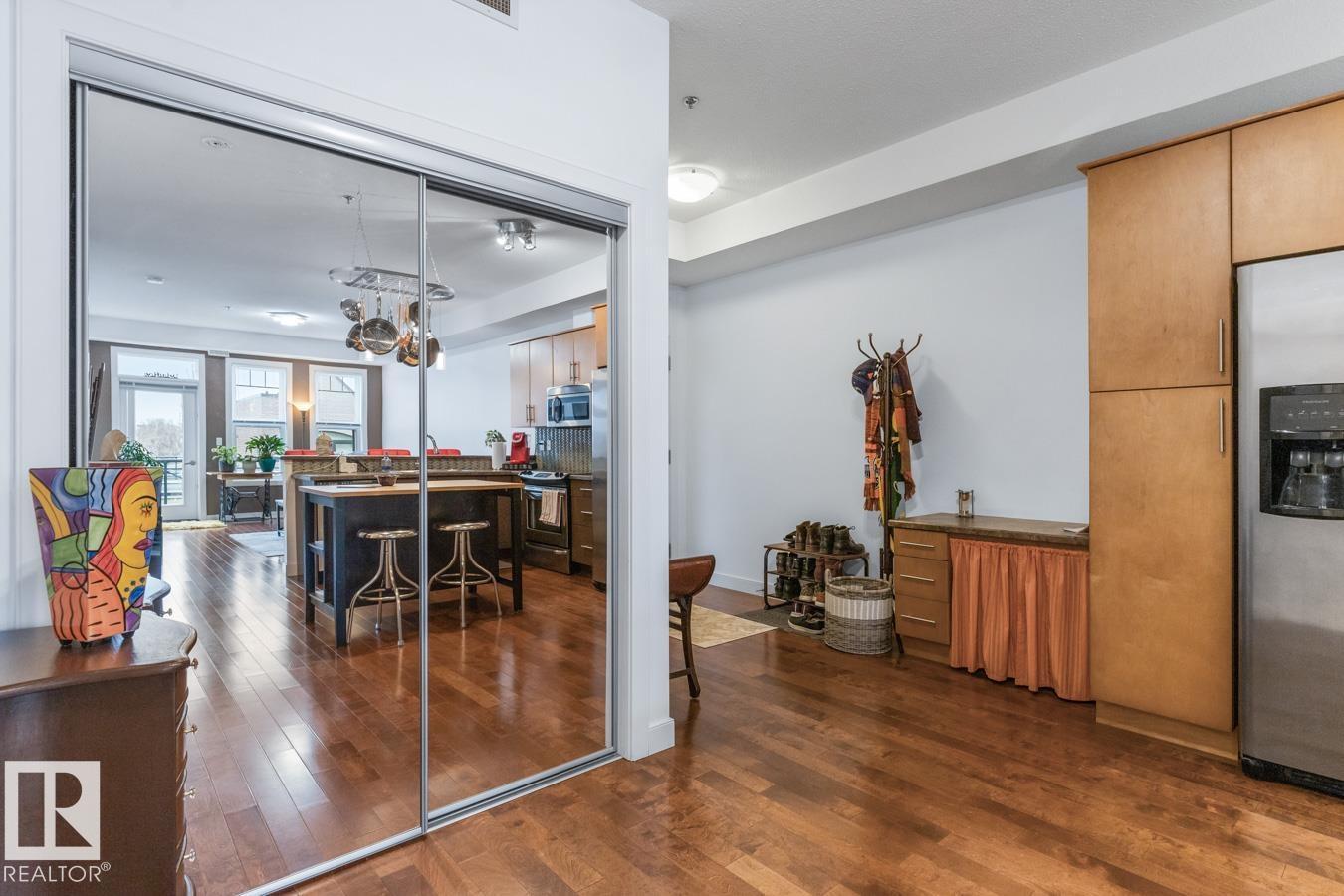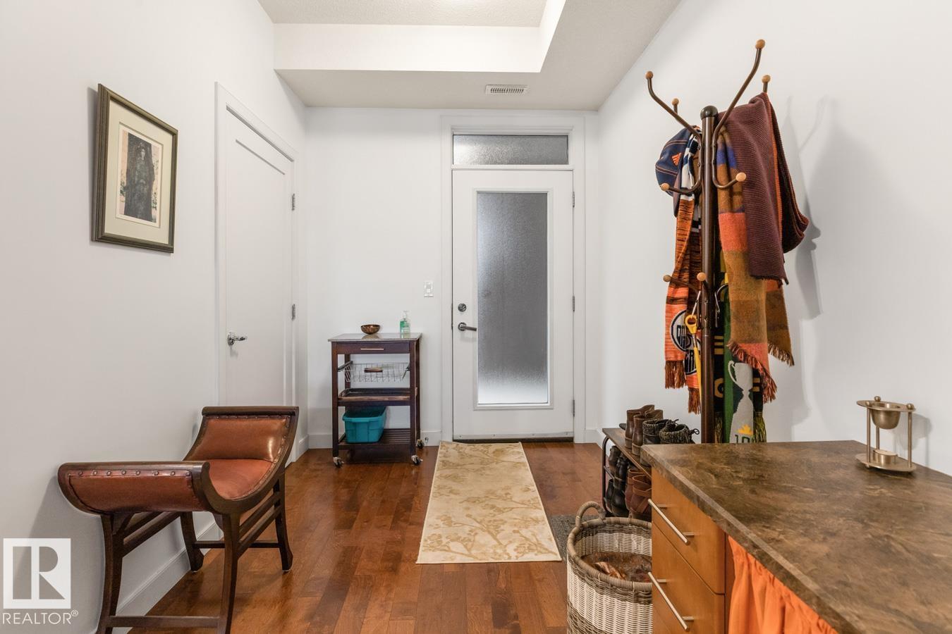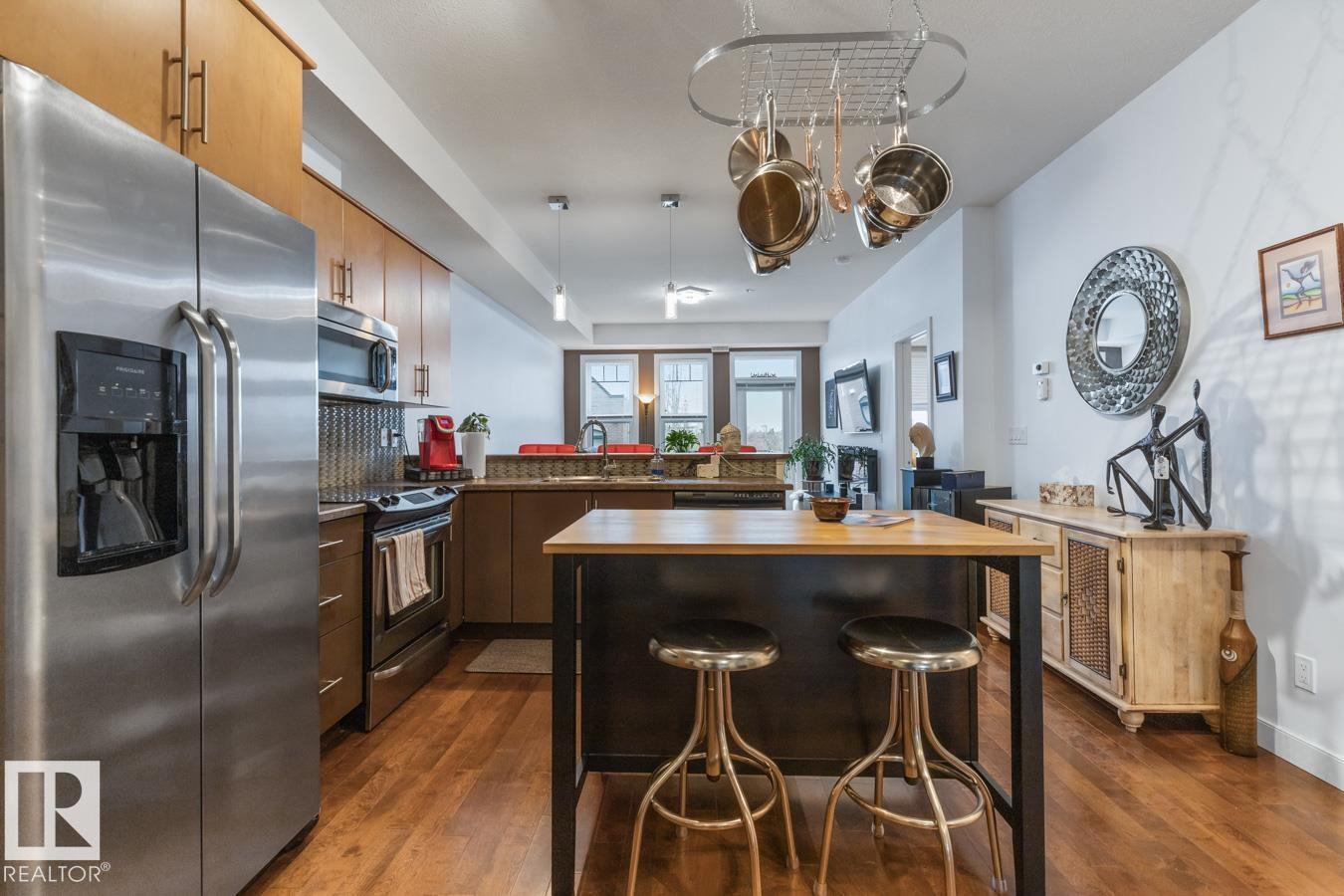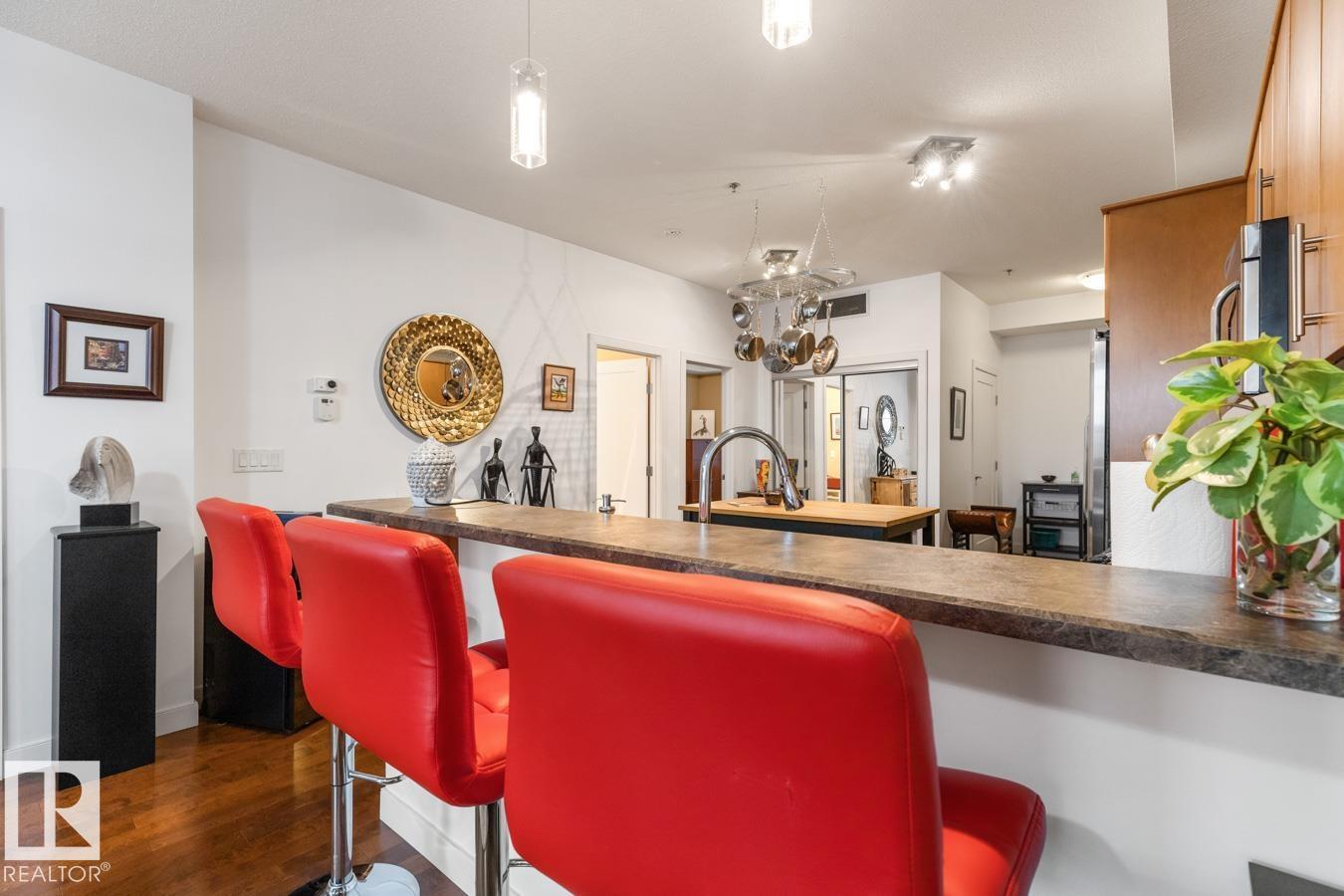 Top floor living in a beautiful Brownstone! This spacious 2 bed, 1 bath open-concept condo offers 9' ceilings, A/C, hardwood floors, fresh paint, and an immaculate interior. The inviting space features a stunning electric fireplace and flows onto a huge private balcony with downtown views - perfect for relaxing or entertaining. Both bedrooms are generously sized, and the large bathroom includes a soaker tub and separate shower. Enjoy in-suite laundry, plus a titled underground heated parking stall with storage cage. Located in a secure, pet-friendly building on tree-lined streets in a sought-after neighbourhood with shopping nearby. Ideal for professionals, students or investors; just minutes to Whyte Ave, U of A, downtown, and the Whitemud. (id:51989)
