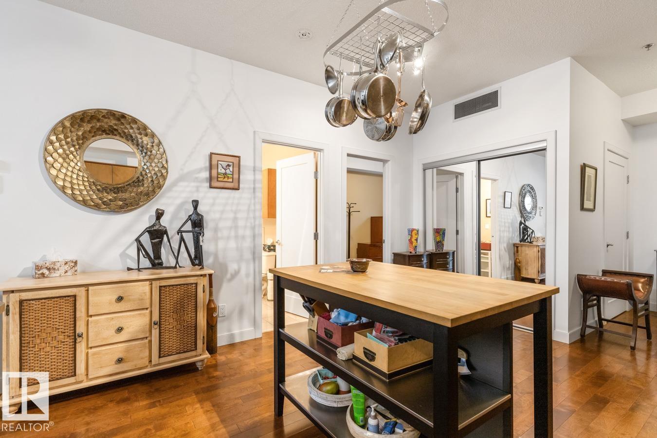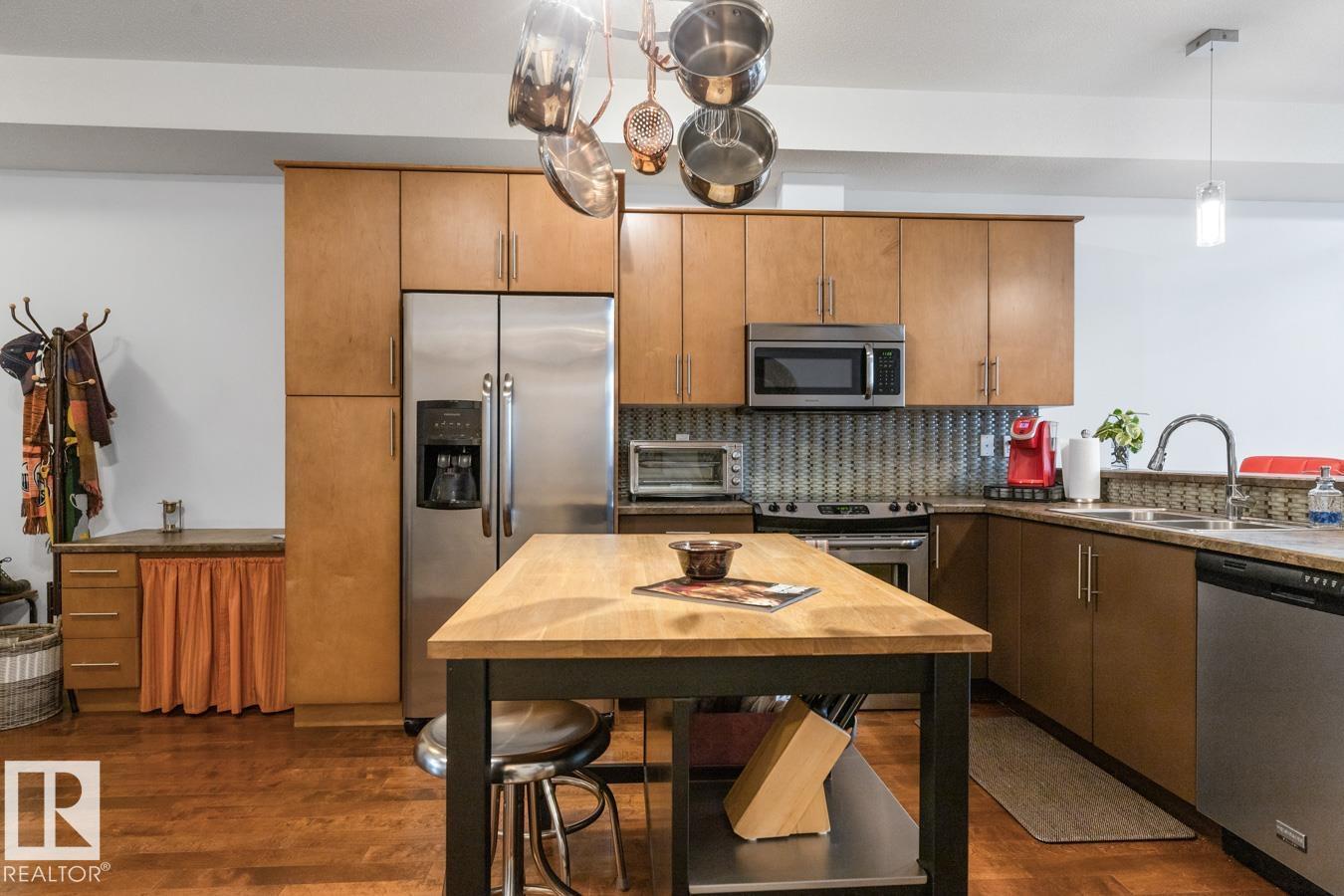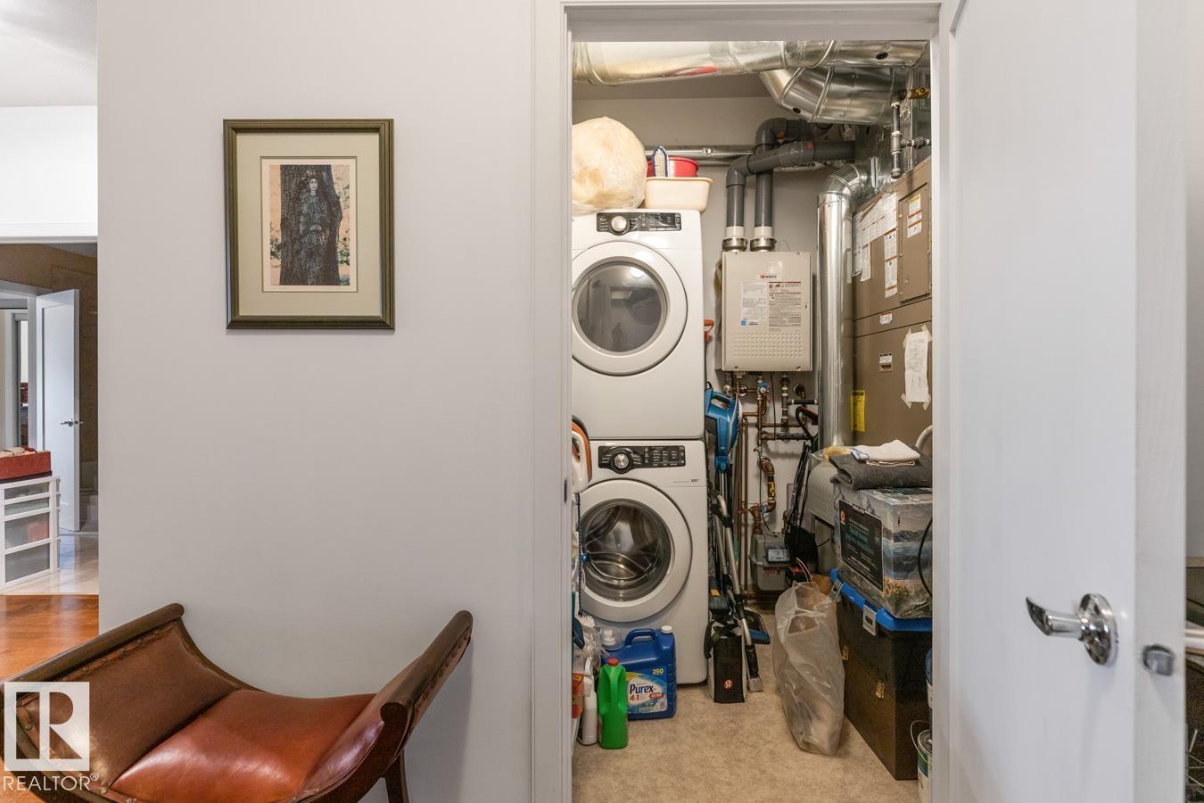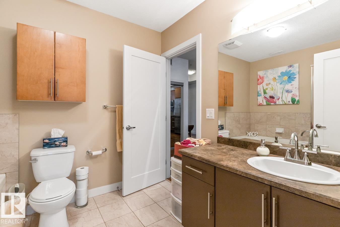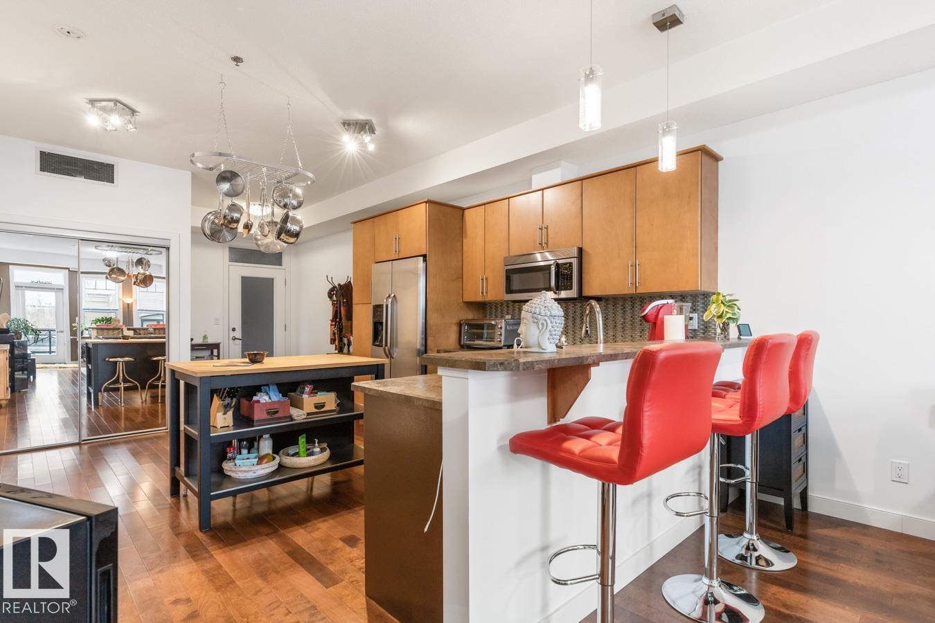 Top floor living in a beautiful Brownstone! This spacious 2 bed, 1 bath open-concept condo offers 9' ceilings, A/C, hardwood floors, fresh paint, and an immaculate interior. The inviting space features a stunning electric fireplace and flows onto a huge private balcony with downtown views - perfect for relaxing or entertaining. Both bedrooms are generously sized, and the large bathroom includes a soaker tub and separate shower. Enjoy in-suite laundry, plus a titled underground heated parking stall with storage cage. Located in a secure, pet-friendly building on tree-lined streets in a sought-after neighbourhood with shopping nearby. Ideal for professionals, students or investors; just minutes to Whyte Ave, U of A, downtown, and the Whitemud. (id:51989)