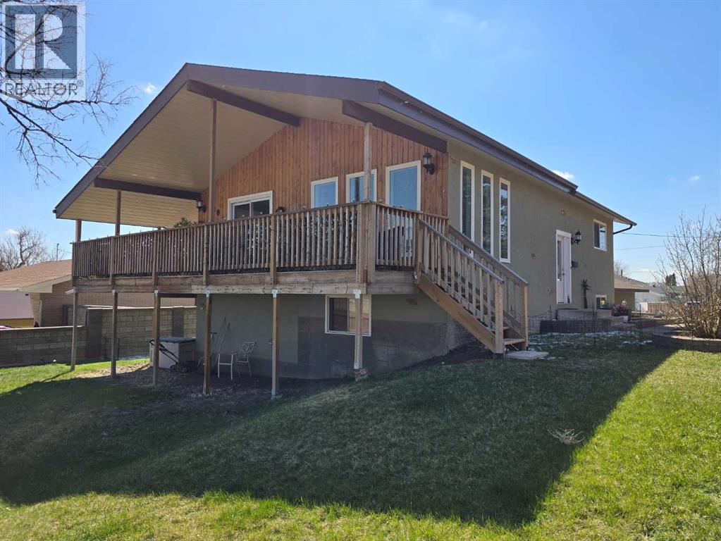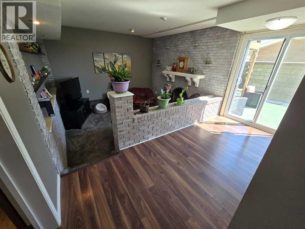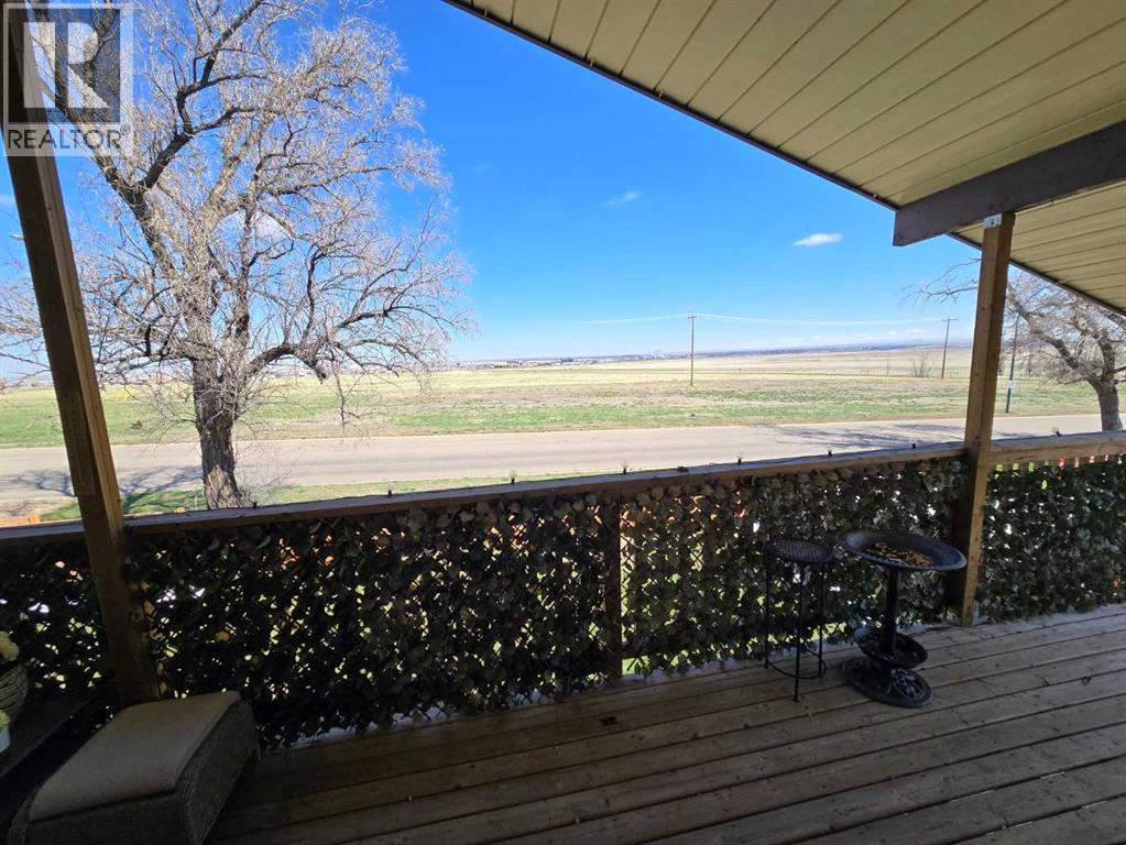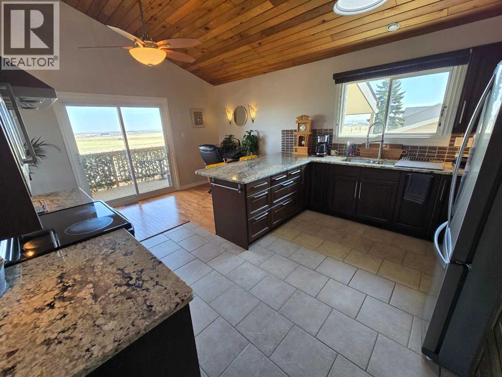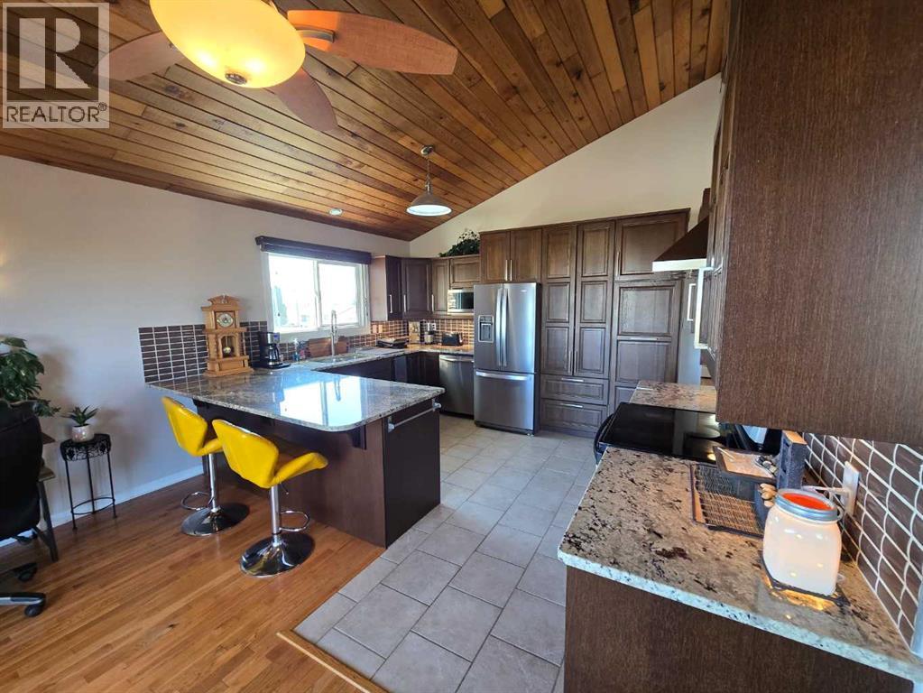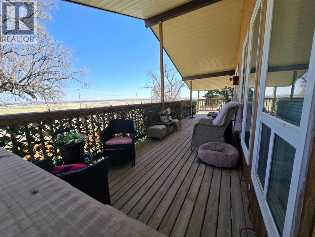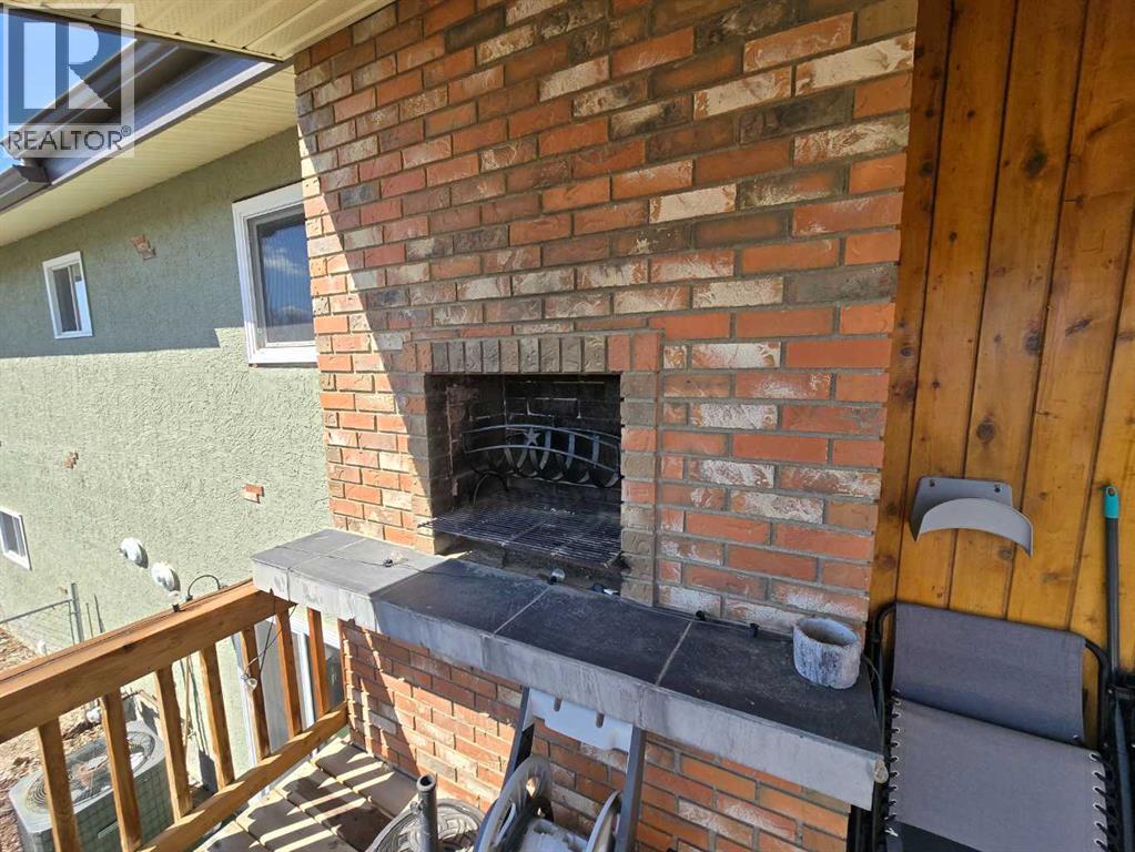 Stunning walkout bungalow with incredible views and standout character! This well-maintained 1979 home offers a bright and open main level with vaulted wood ceilings flowing through the living room, dining area, and kitchen, creating a warm and inviting space full of natural light. The updated kitchen features granite countertops, ample cabinetry, and a functional layout ideal for everyday living and entertaining. The main floor includes two bedrooms and a beautifully updated bathroom complete with a tiled shower and separate soaker tub. The fully developed walkout basement offers excellent flexibility with a second kitchen, spacious family room with brick feature wall, two large bedrooms, and a bathroom with jetted tub. With its own entrance near the garage as well as patio access, this space is perfect for extended family, a mother-in-law setup, or future suite potential. Step outside to a large wrap-around deck spanning the width of the home, complete with a built-in brick fireplace/BBQ—an ideal spot to take in the unobstructed views toward Medicine Hat and beyond, with no neighbours directly in front. Additional features include a 26’ x 28’ double detached garage with finished interior and electric heater, double concrete driveway plus extra parking, underground sprinklers, and a spacious yard. The exterior offers a combination of stucco and wood siding for added character. Additional updates and features include hardwood flooring, a high-efficiency furnace (2024), tankless hot water system (2023), and many vinyl windows, with only a few original aluminum windows remaining. A truly unique property offering space, versatility, and spectacular views—far from cookie-cutter. (id:51989)