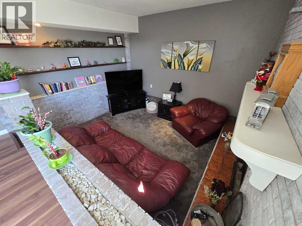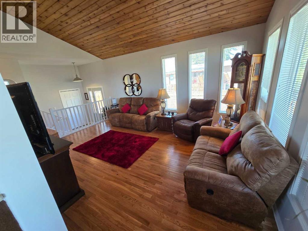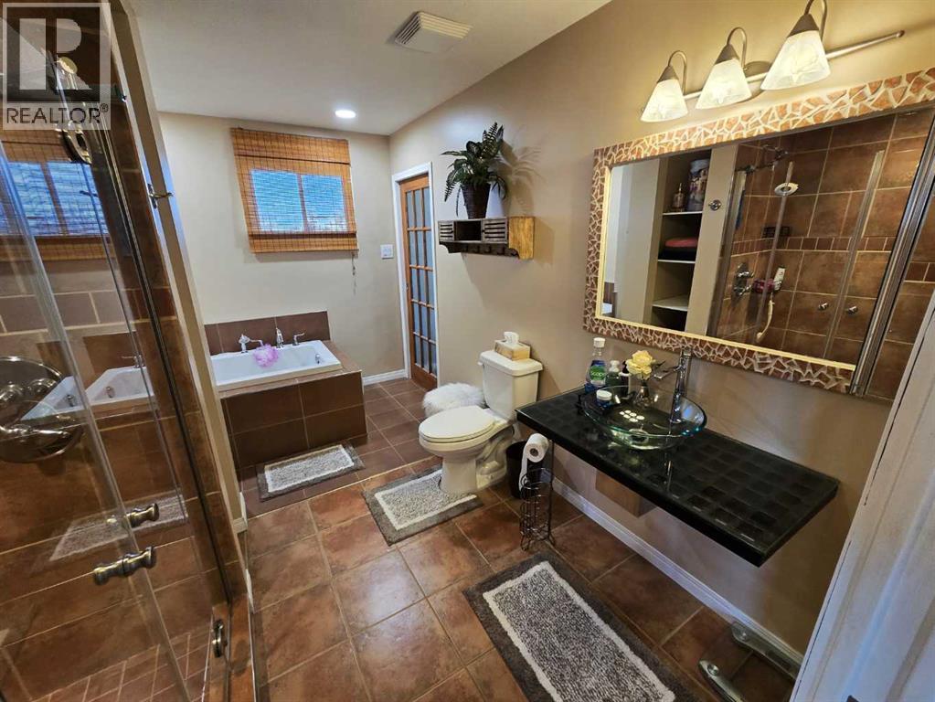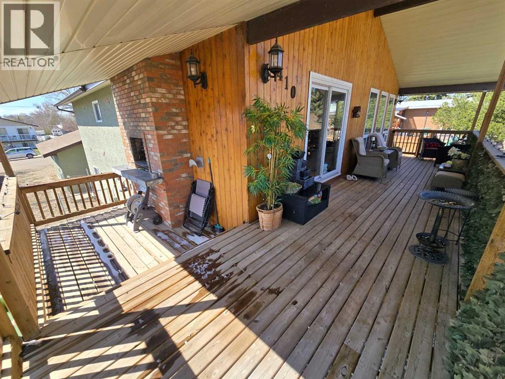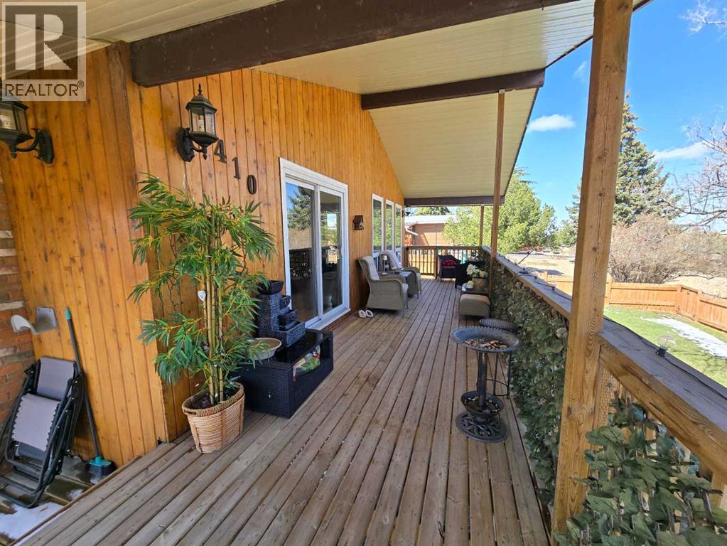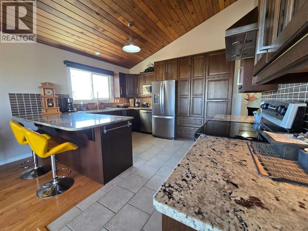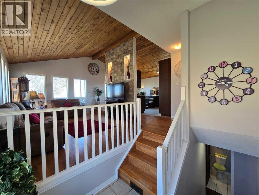 Stunning walkout bungalow with incredible views and standout character! This well-maintained 1979 home offers a bright and open main level with vaulted wood ceilings flowing through the living room, dining area, and kitchen, creating a warm and inviting space full of natural light. The updated kitchen features granite countertops, ample cabinetry, and a functional layout ideal for everyday living and entertaining. The main floor includes two bedrooms and a beautifully updated bathroom complete with a tiled shower and separate soaker tub. The fully developed walkout basement offers excellent flexibility with a second kitchen, spacious family room with brick feature wall, two large bedrooms, and a bathroom with jetted tub. With its own entrance near the garage as well as patio access, this space is perfect for extended family, a mother-in-law setup, or future suite potential. Step outside to a large wrap-around deck spanning the width of the home, complete with a built-in brick fireplace/BBQ—an ideal spot to take in the unobstructed views toward Medicine Hat and beyond, with no neighbours directly in front. Additional features include a 26’ x 28’ double detached garage with finished interior and electric heater, double concrete driveway plus extra parking, underground sprinklers, and a spacious yard. The exterior offers a combination of stucco and wood siding for added character. Additional updates and features include hardwood flooring, a high-efficiency furnace (2024), tankless hot water system (2023), and many vinyl windows, with only a few original aluminum windows remaining. A truly unique property offering space, versatility, and spectacular views—far from cookie-cutter. (id:51989)