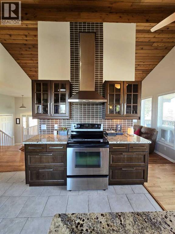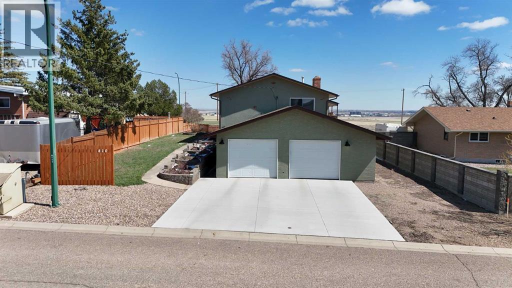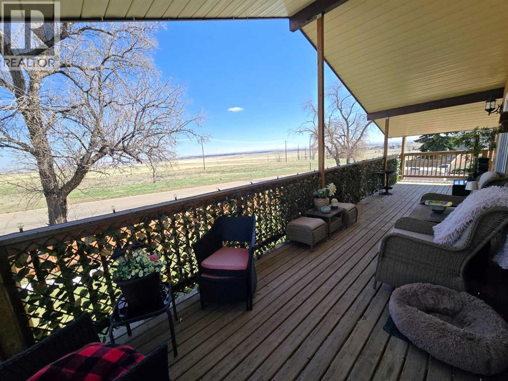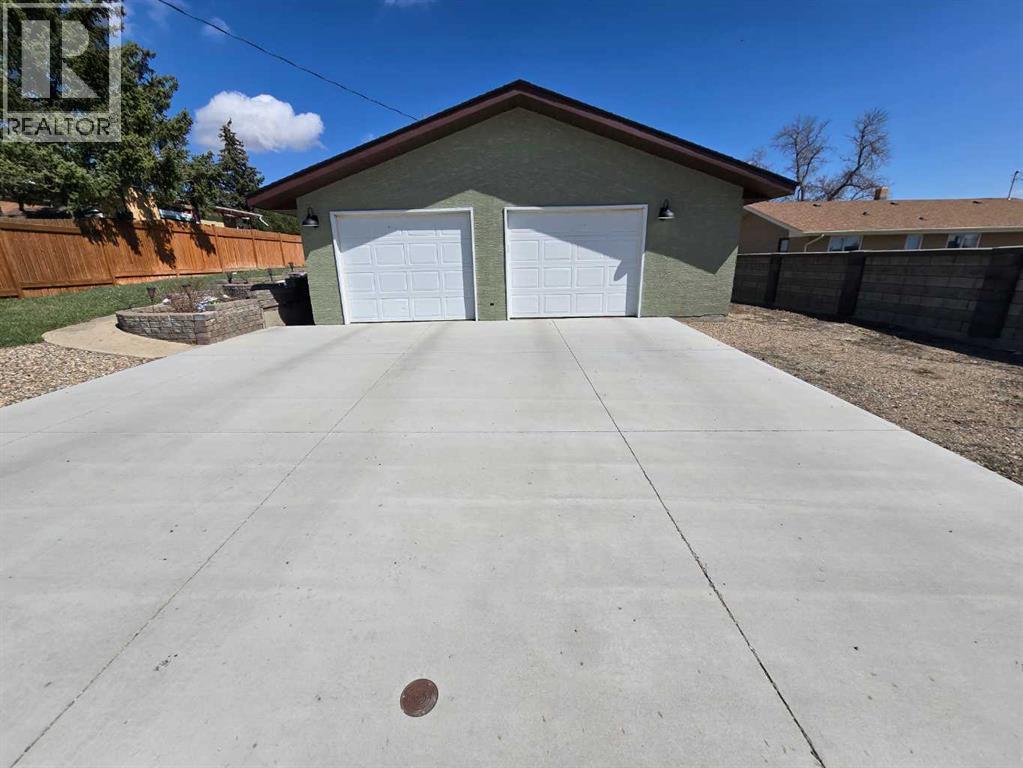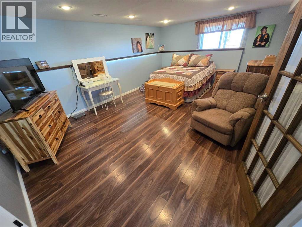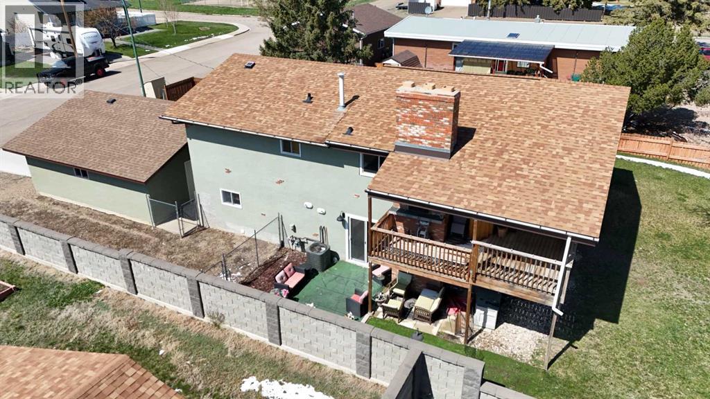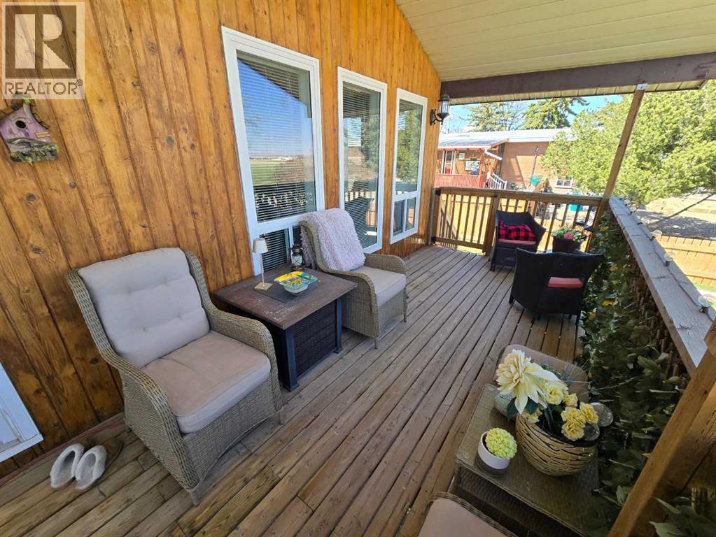 Stunning walkout bungalow with incredible views and standout character! This well-maintained 1979 home offers a bright and open main level with vaulted wood ceilings flowing through the living room, dining area, and kitchen, creating a warm and inviting space full of natural light. The updated kitchen features granite countertops, ample cabinetry, and a functional layout ideal for everyday living and entertaining. The main floor includes two bedrooms and a beautifully updated bathroom complete with a tiled shower and separate soaker tub. The fully developed walkout basement offers excellent flexibility with a second kitchen, spacious family room with brick feature wall, two large bedrooms, and a bathroom with jetted tub. With its own entrance near the garage as well as patio access, this space is perfect for extended family, a mother-in-law setup, or future suite potential. Step outside to a large wrap-around deck spanning the width of the home, complete with a built-in brick fireplace/BBQ—an ideal spot to take in the unobstructed views toward Medicine Hat and beyond, with no neighbours directly in front. Additional features include a 26’ x 28’ double detached garage with finished interior and electric heater, double concrete driveway plus extra parking, underground sprinklers, and a spacious yard. The exterior offers a combination of stucco and wood siding for added character. Additional updates and features include hardwood flooring, a high-efficiency furnace (2024), tankless hot water system (2023), and many vinyl windows, with only a few original aluminum windows remaining. A truly unique property offering space, versatility, and spectacular views—far from cookie-cutter. (id:51989)