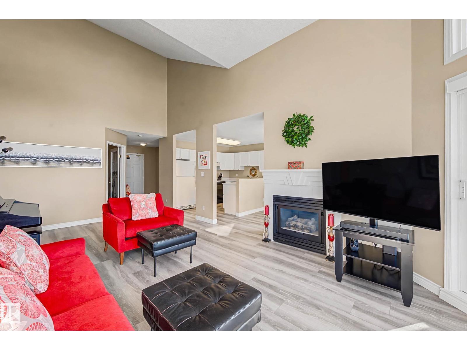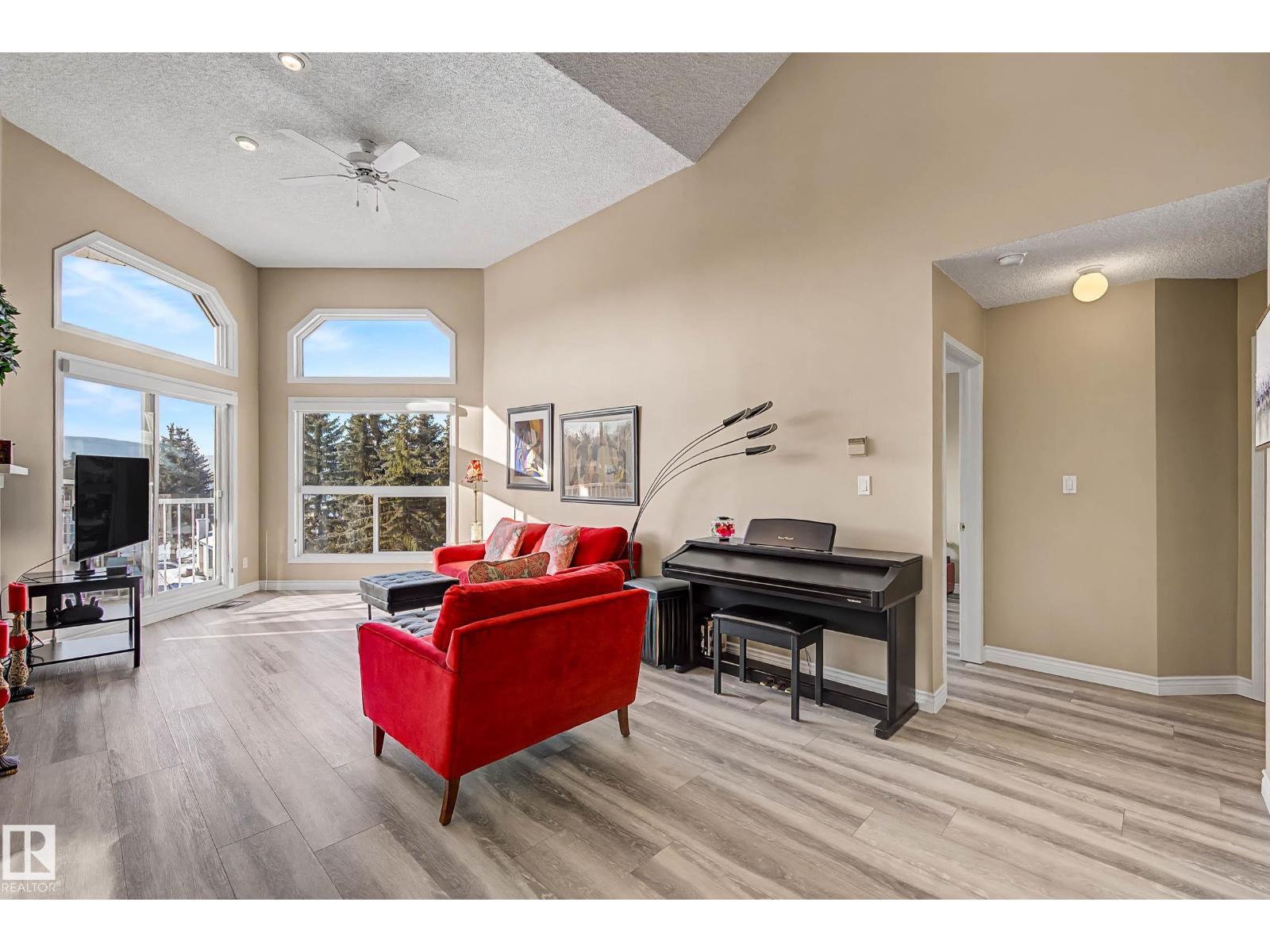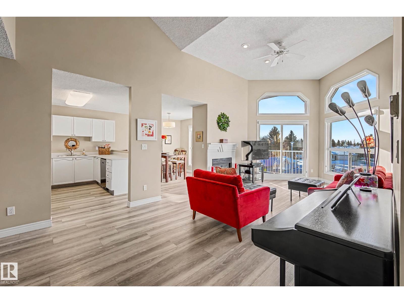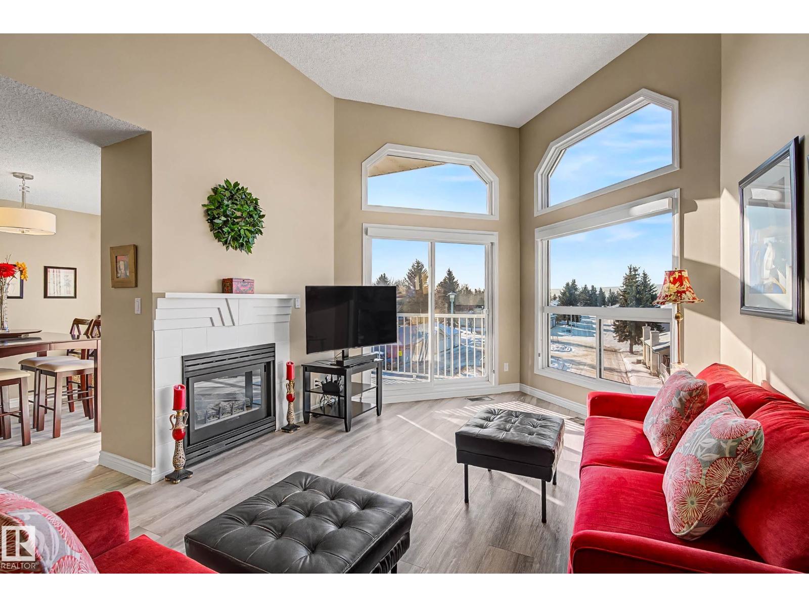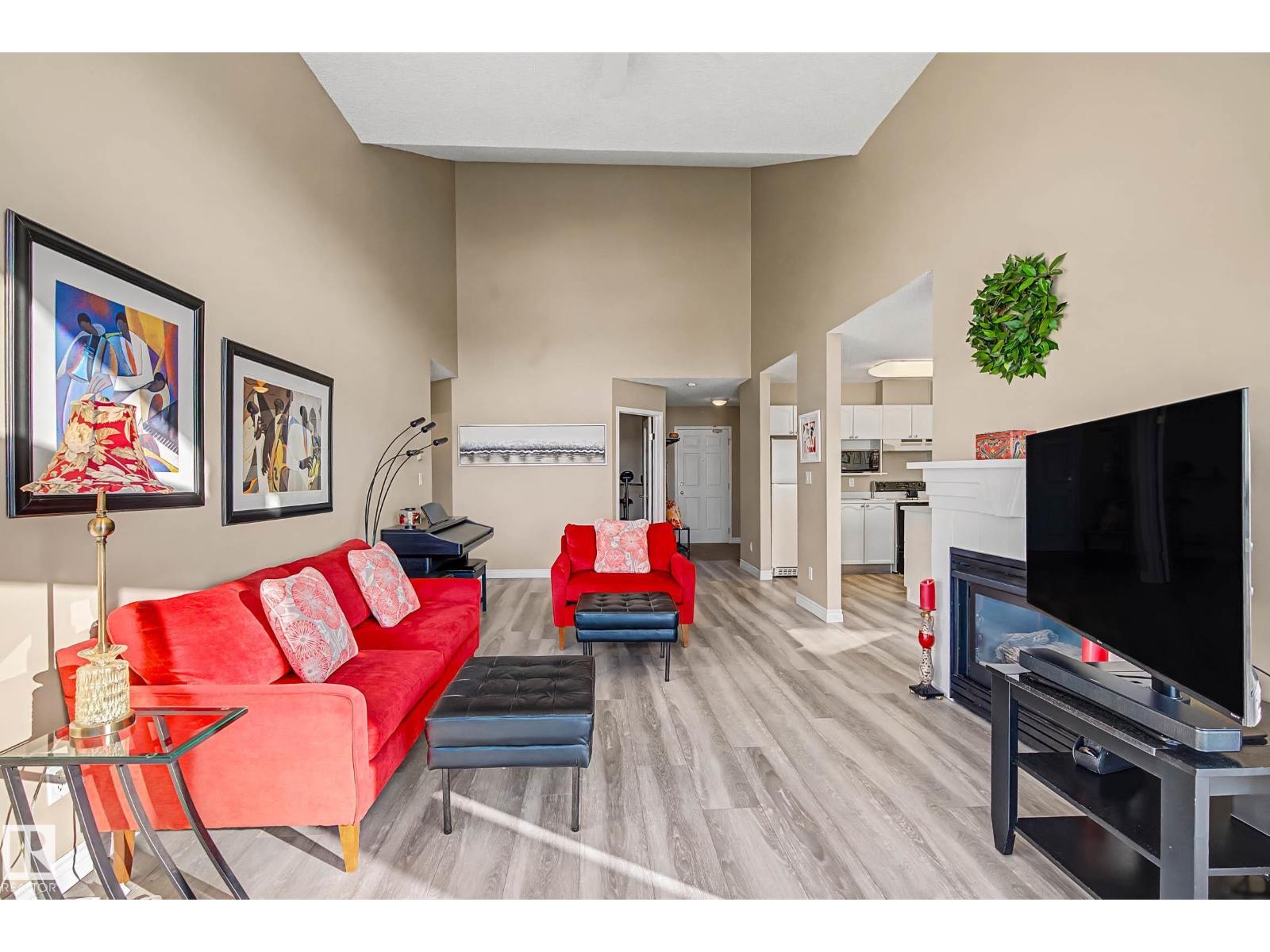 Wow! Top floor (4th) upgraded condo with soaring vaulted ceilings. The south exposure and large windows (including upper clerestory windows) combine to fill this home with light all day. Add this interior to the large south exposure deck and sunshine reigns supreme! Gas BBQ line to deck. This 1 bedroom plus den unit is immaculately kept exuding gracious living. Newer Luxury vinyl plank floor floor & fresh paint makes this home feel like new. Large living room with gas fireplace enjoys the spacious beauty of the windows and vaulted ceiling. Warm winter nights with cozy fireplace and cool summer days with the central air conditioning make this home a year round pleasure. Well planned kitchen and spacious dining room adjoin the living room. Great functional floorplan for entertaining and everyday living. Primary bedroom also enjoys the south view and light. Your personal den/office space is great flexible space Single car GARAGE plus one assigned energized outdoor stall complete this fantastic package. (id:51989)