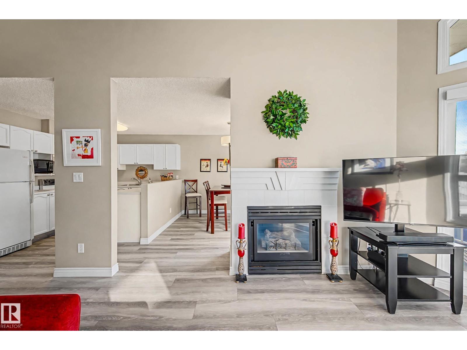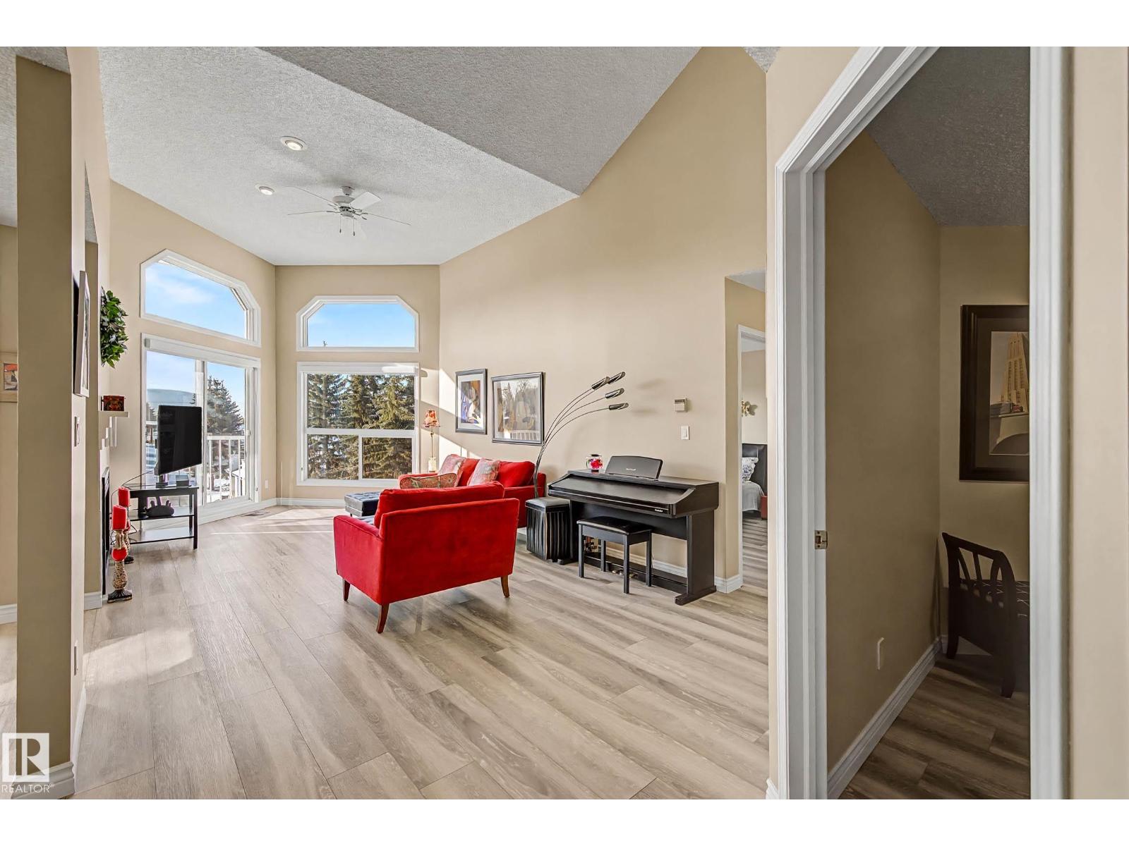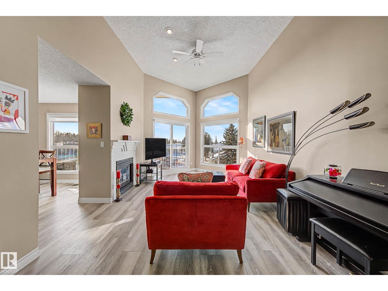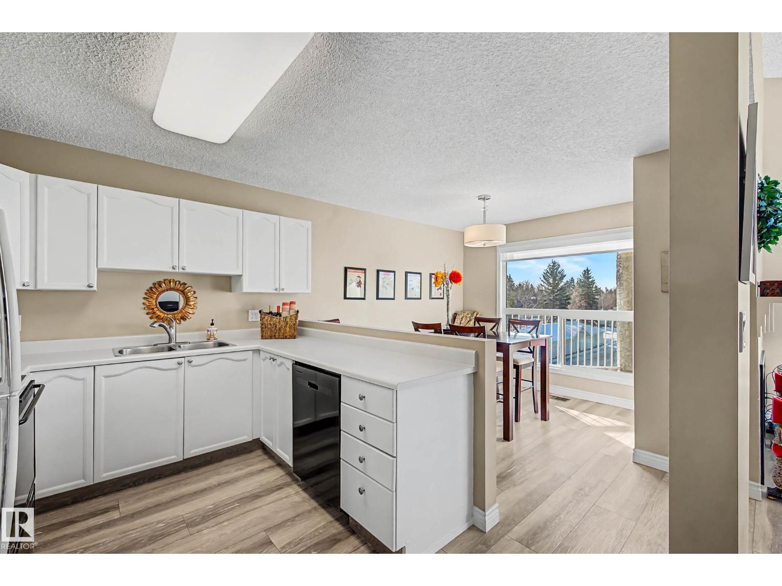 Wow! Top floor (4th) upgraded condo with soaring vaulted ceilings. The south exposure and large windows (including upper clerestory windows) combine to fill this home with light all day. Add this interior to the large south exposure deck and sunshine reigns supreme! Gas BBQ line to deck. This 1 bedroom plus den unit is immaculately kept exuding gracious living. Newer Luxury vinyl plank floor floor & fresh paint makes this home feel like new. Large living room with gas fireplace enjoys the spacious beauty of the windows and vaulted ceiling. Warm winter nights with cozy fireplace and cool summer days with the central air conditioning make this home a year round pleasure. Well planned kitchen and spacious dining room adjoin the living room. Great functional floorplan for entertaining and everyday living. Primary bedroom also enjoys the south view and light. Your personal den/office space is great flexible space Single car GARAGE plus one assigned energized outdoor stall complete this fantastic package. (id:51989)