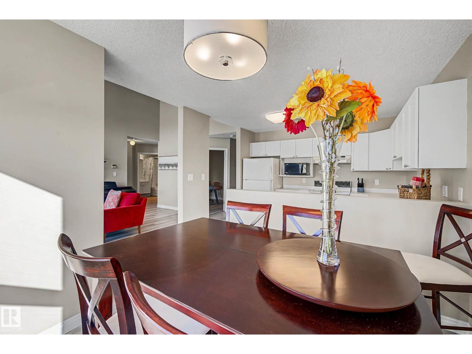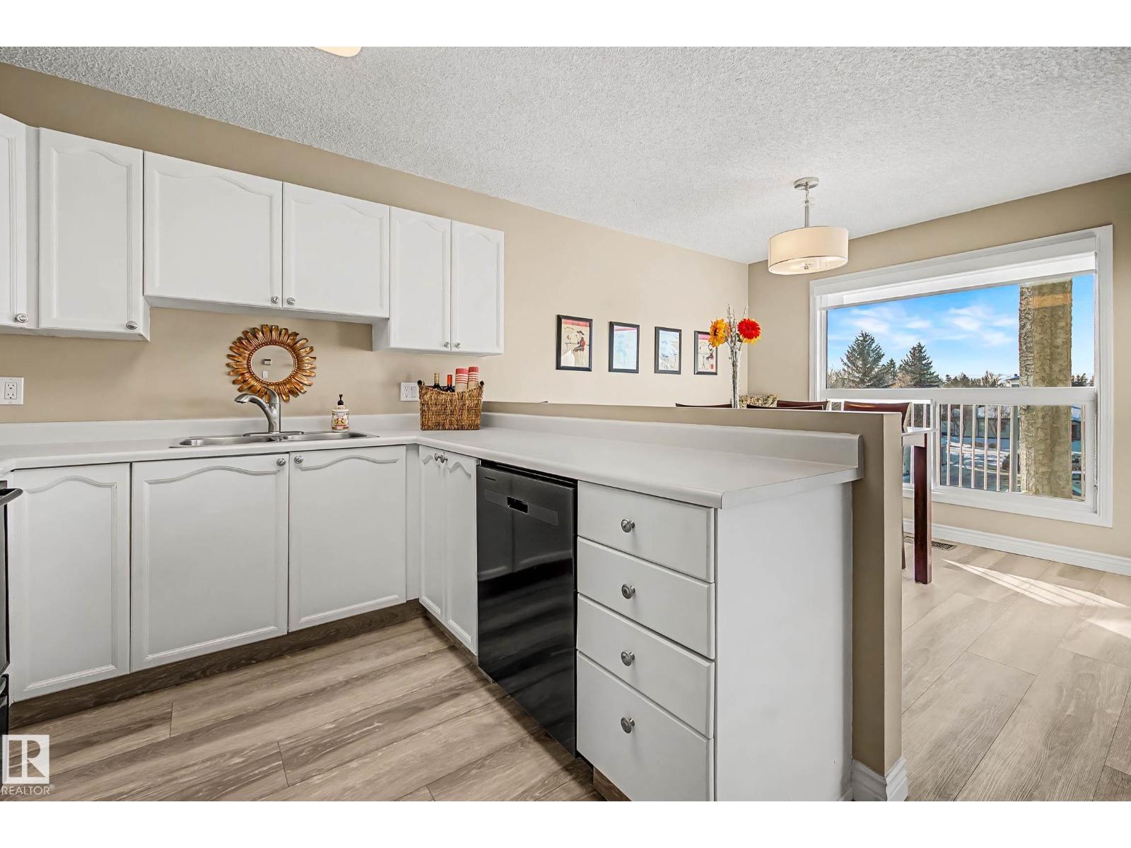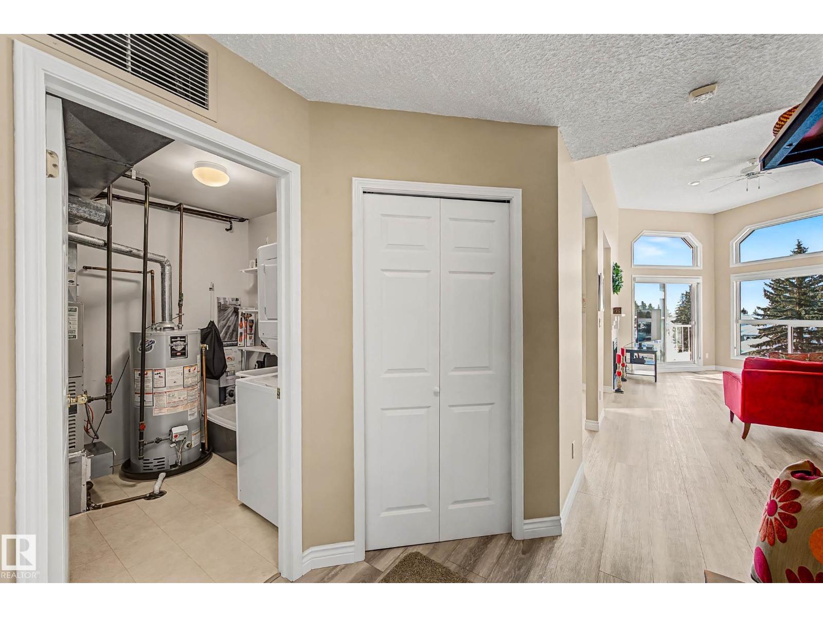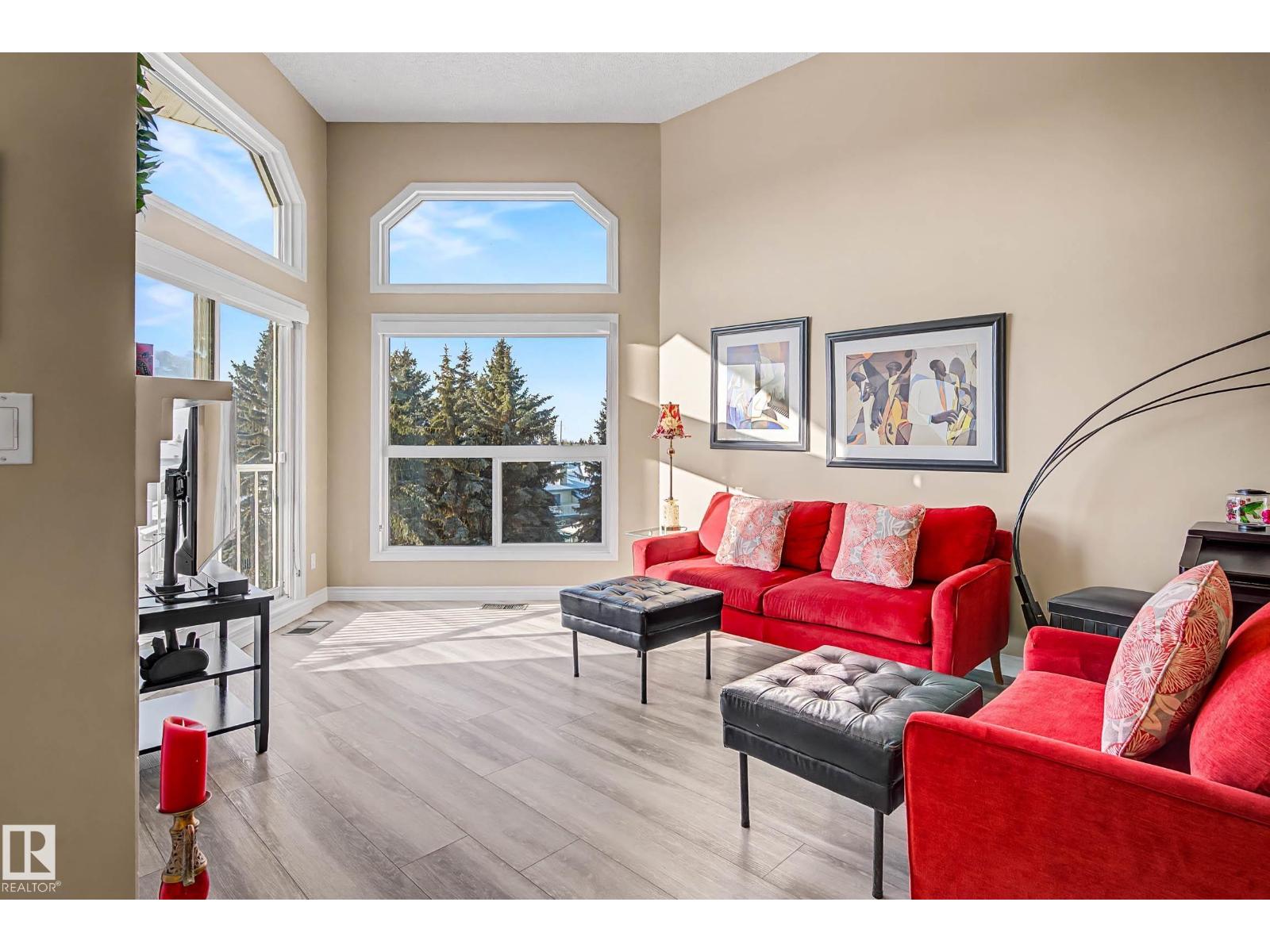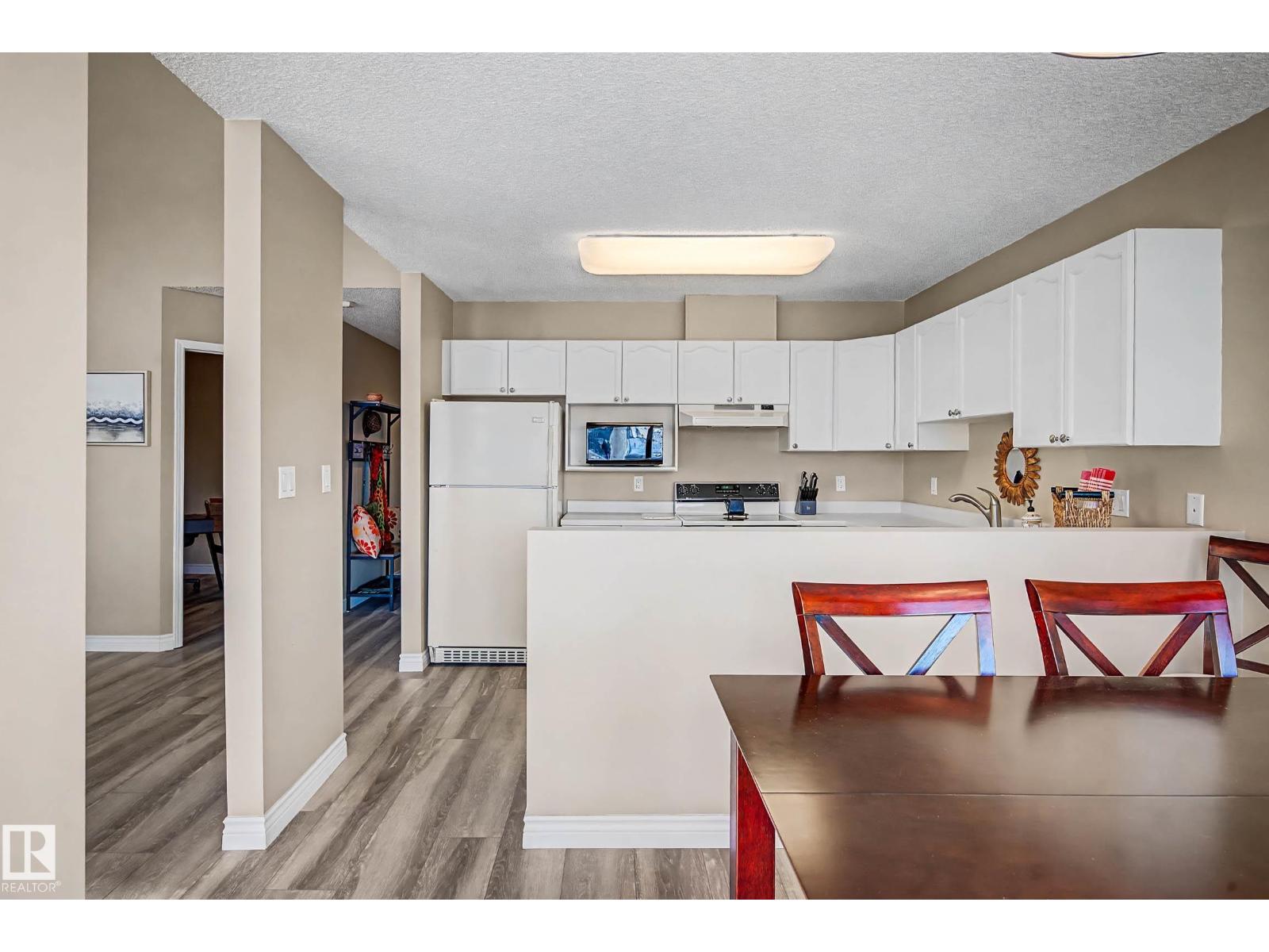 Wow! Top floor (4th) upgraded condo with soaring vaulted ceilings. The south exposure and large windows (including upper clerestory windows) combine to fill this home with light all day. Add this interior to the large south exposure deck and sunshine reigns supreme! Gas BBQ line to deck. This 1 bedroom plus den unit is immaculately kept exuding gracious living. Newer Luxury vinyl plank floor floor & fresh paint makes this home feel like new. Large living room with gas fireplace enjoys the spacious beauty of the windows and vaulted ceiling. Warm winter nights with cozy fireplace and cool summer days with the central air conditioning make this home a year round pleasure. Well planned kitchen and spacious dining room adjoin the living room. Great functional floorplan for entertaining and everyday living. Primary bedroom also enjoys the south view and light. Your personal den/office space is great flexible space Single car GARAGE plus one assigned energized outdoor stall complete this fantastic package. (id:51989)