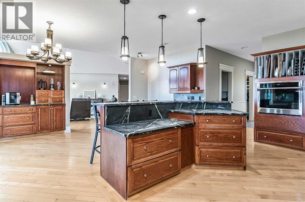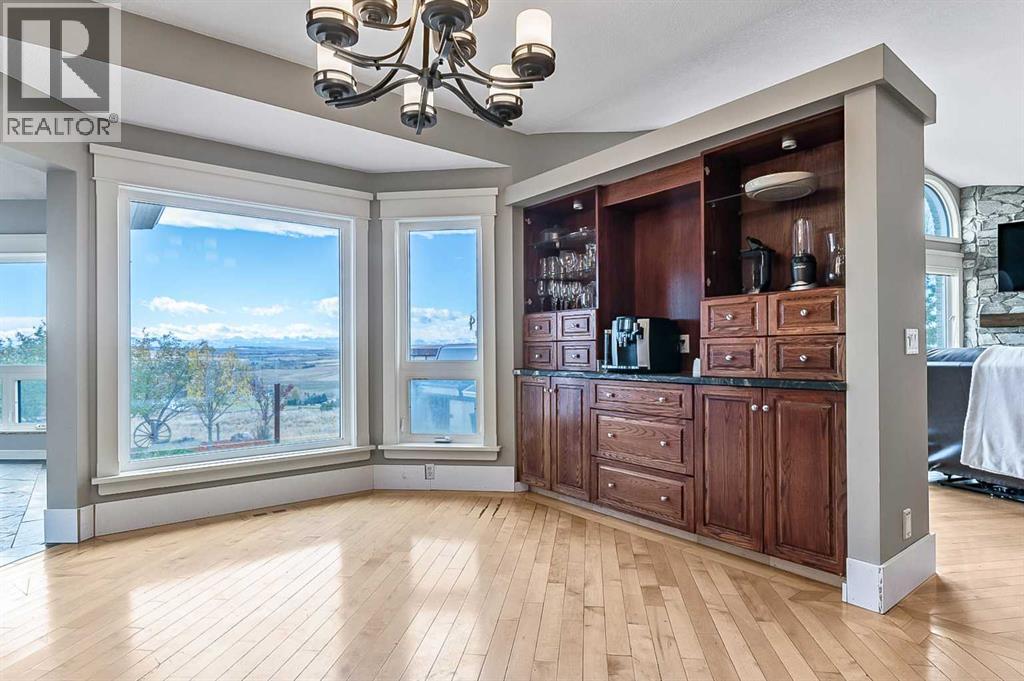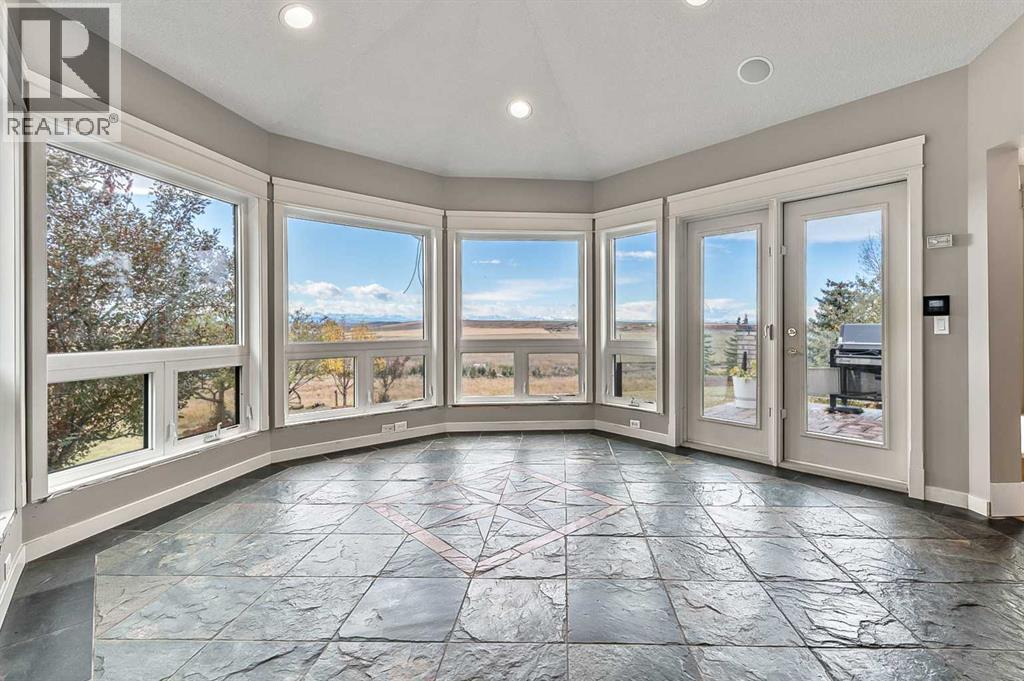 Imagine waking up to breathtaking panoramic views of the Rocky Mountains and rolling valleys, where the sun dips dramatically behind snow-capped peaks each evening—right from your west-facing windows. Nestled on over 55 acres of prime agricultural land in Rural Foothills County, this exceptional walk-out bungalow delivers 2,450 sq. ft. on the main level plus a fully developed basement, totaling 4,700 sq. ft. of luxurious living space. With 4 bedrooms, 4 bathrooms, office air conditioning, and thoughtful features like a large open kitchen, all-season sunroom/dining room flowing to expansive decks, vaulted living room with a stunning newer stone wood-burning fireplace, and premium hardwood, slate, and cork flooring throughout. The lower level boasts a family room with wet bar and wine cellar, dedicated media room, gym, abundant storage, and cozy lower deck access. Plus, an oversized attached double garage for all your needs.But this isn't just a home—it's a powerhouse property primed for smart investment. Unlock immediate equity through a potential subdivision opportunity! Owner recently submitted a land use redesignation application in order to start the process to potentially split off 13.7 acres of buildable bare land—pending Foothills County approvals—act now before this potentially elevates options and competition!Elevate your lifestyle with unmatched water security: Two excellent water wells —perfect for light irrigation, livestock, or self-sufficiency. The top field is fenced with new 7-strand high-tensile electric fence system, metal gates, and plank accents, plus a paved walking path for serene exploration or convenient at home fitness. Three versatile outbuildings await your vision: A 42' x 84' insulated metal barn with concrete floor, 110/220 power, and water (ideal for expansion); a 36' x 72' metal shop and a 24' x 72' animal shelter. An oversized gravel compound handles equipment, parking, and storage effortlessly.Tucked peacefully off Highway 7 under Alberta's vast blue skies, with mountain and city views blending into the horizon—this is serenity meets opportunity. Don't miss your shot to own this versatile gem before the potential subdivision greenlight changes everything. Schedule your viewing today and step into endless Alberta horizons! (id:51989)