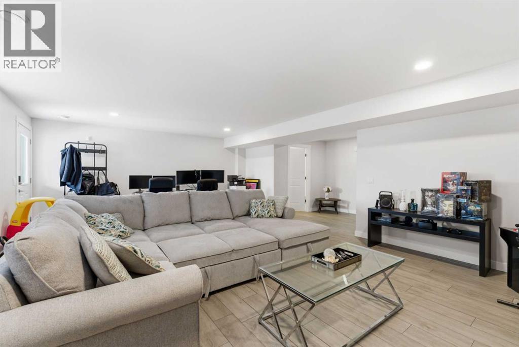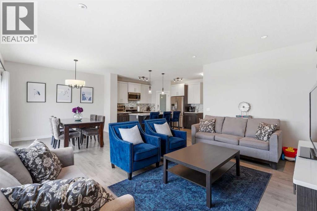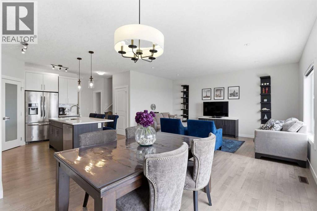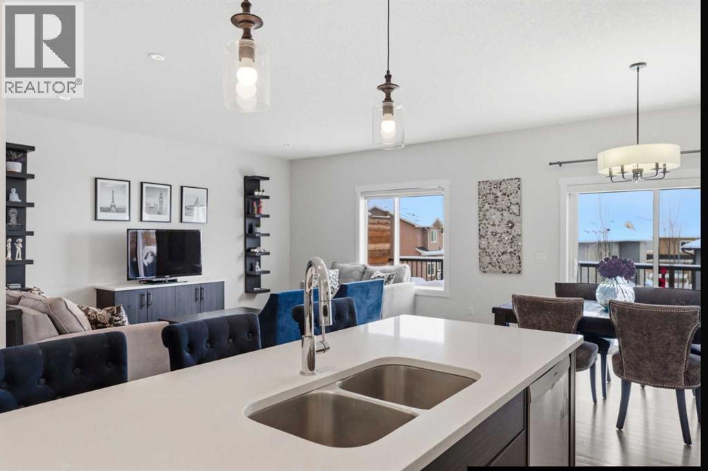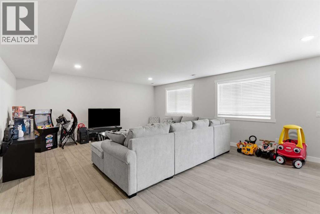 This Stunning family home in the community of Bayview in Airdrie has over 2,700 sq. ft. of fully finished living space. The fully developed basement with a walk-out has sound dampening drywall and insulated for peace and quiet and is plumbed for a kitchen with a rental possibility. Thoughtfully upgraded throughout, the home features Central Air Conditioning, an impressive kitchen with extended-height cabinetry and Silestone quartz counters, opening to a bright dining nook with access to a large rear deck. The spacious great room is anchored by a quartz-clad built-in entertainment unit, enhanced with recessed lighting for a warm, modern feel and a practical main-floor mudroom/laundry area includes a generous storage closet, to round out the main floor. Upstairs, a well-lit bonus room with vaulted ceilings and pot lights creates an inviting central space. Two large bedrooms and a 4-piece main bath occupy the front of the upper level, while the rear is dedicated to the primary suite. The primary bedroom features an expansive walk-in closet and a bright 5-piece ensuite complete with a soaker tub and separate shower. The newly developed walk-out basement adds exceptional functionality, offering the home’s fourth bathroom, a convenient office/den, and a bright recreation room with large windows and a garden door leading to a covered patio and the rear yard. With a fabulous location close to school, shops and outdoor activities, what more could you ask for in your next home. (id:51989)