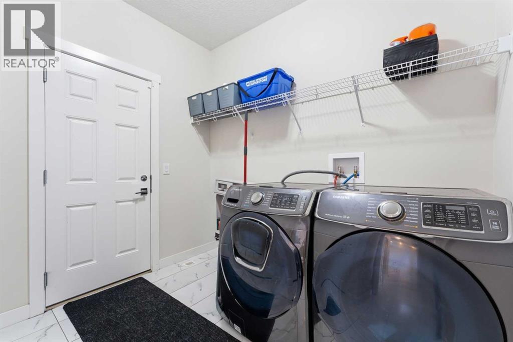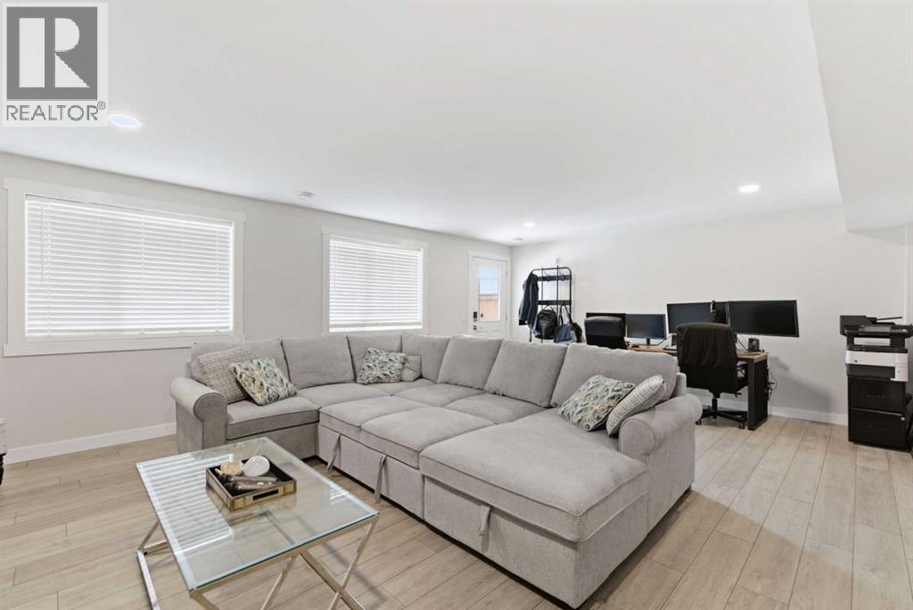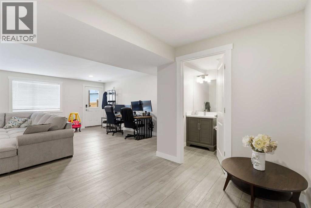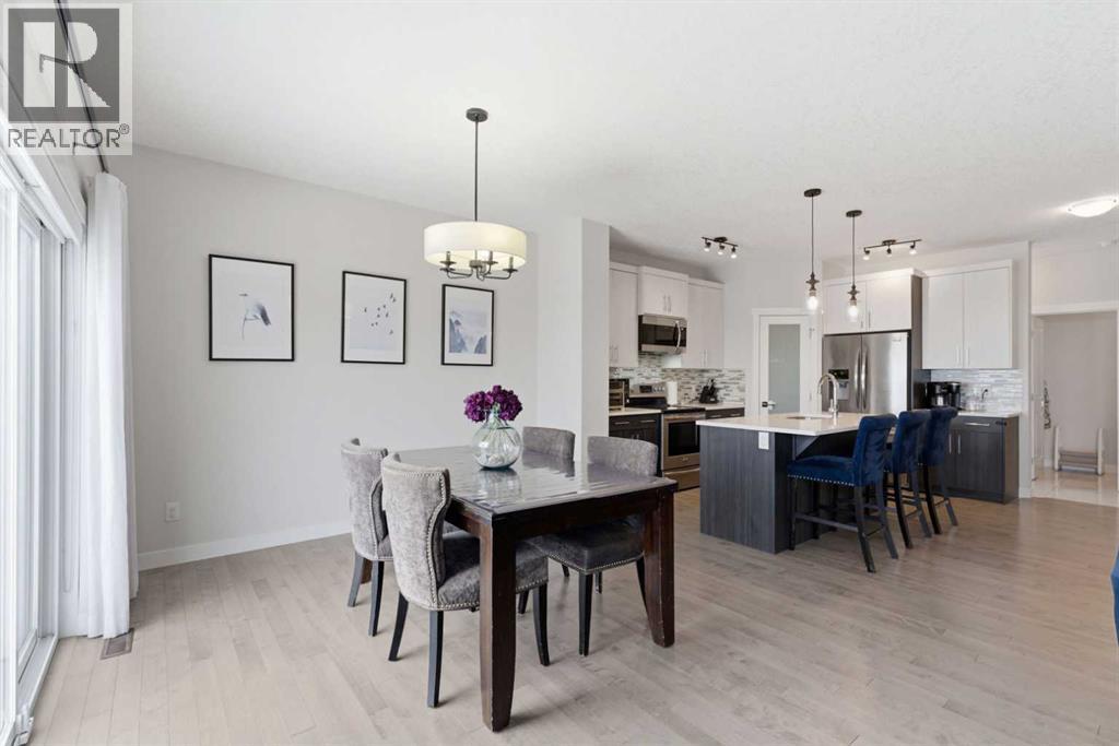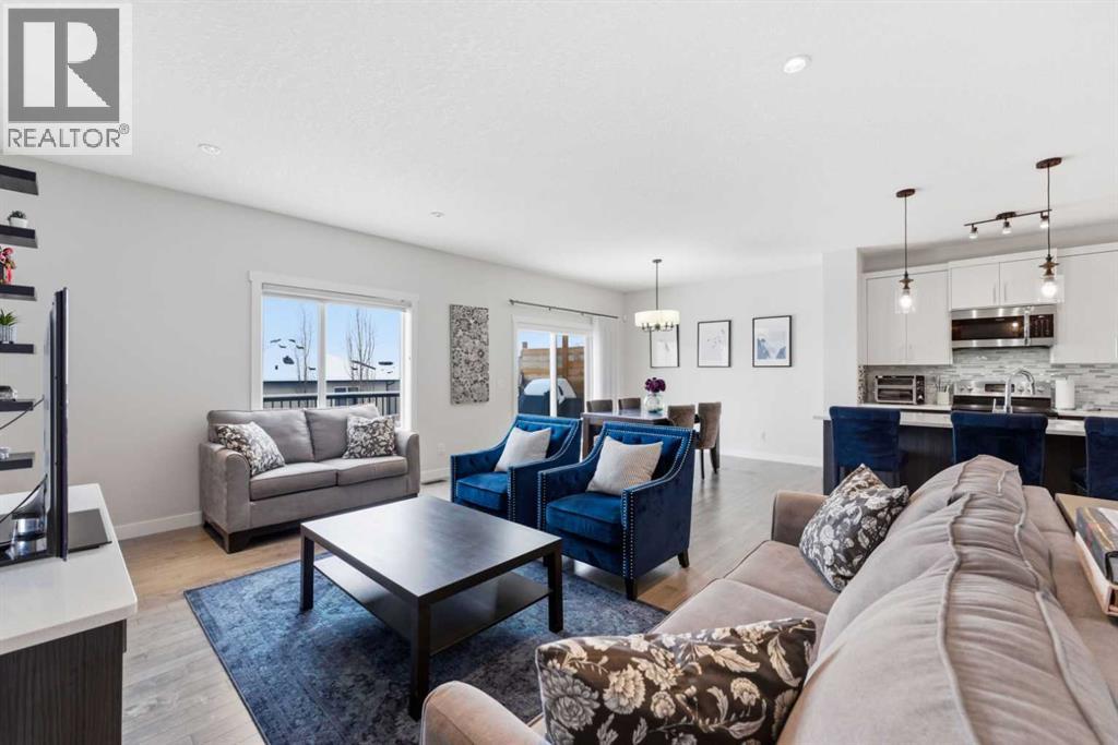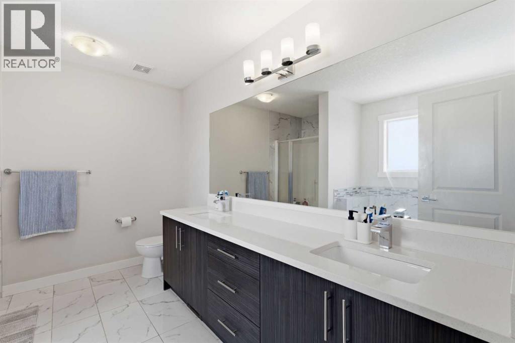 This Stunning family home in the community of Bayview in Airdrie has over 2,700 sq. ft. of fully finished living space. The fully developed basement with a walk-out has sound dampening drywall and insulated for peace and quiet and is plumbed for a kitchen with a rental possibility. Thoughtfully upgraded throughout, the home features Central Air Conditioning, an impressive kitchen with extended-height cabinetry and Silestone quartz counters, opening to a bright dining nook with access to a large rear deck. The spacious great room is anchored by a quartz-clad built-in entertainment unit, enhanced with recessed lighting for a warm, modern feel and a practical main-floor mudroom/laundry area includes a generous storage closet, to round out the main floor. Upstairs, a well-lit bonus room with vaulted ceilings and pot lights creates an inviting central space. Two large bedrooms and a 4-piece main bath occupy the front of the upper level, while the rear is dedicated to the primary suite. The primary bedroom features an expansive walk-in closet and a bright 5-piece ensuite complete with a soaker tub and separate shower. The newly developed walk-out basement adds exceptional functionality, offering the home’s fourth bathroom, a convenient office/den, and a bright recreation room with large windows and a garden door leading to a covered patio and the rear yard. With a fabulous location close to school, shops and outdoor activities, what more could you ask for in your next home. (id:51989)