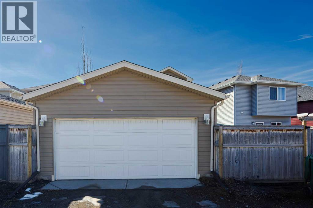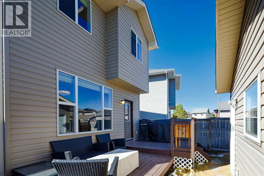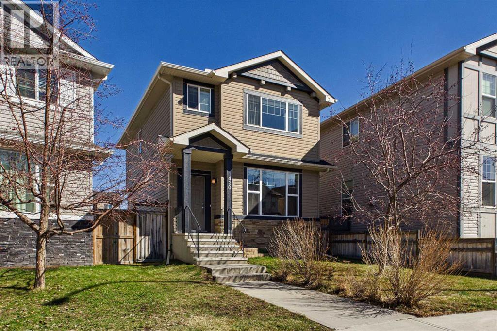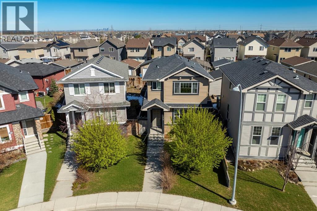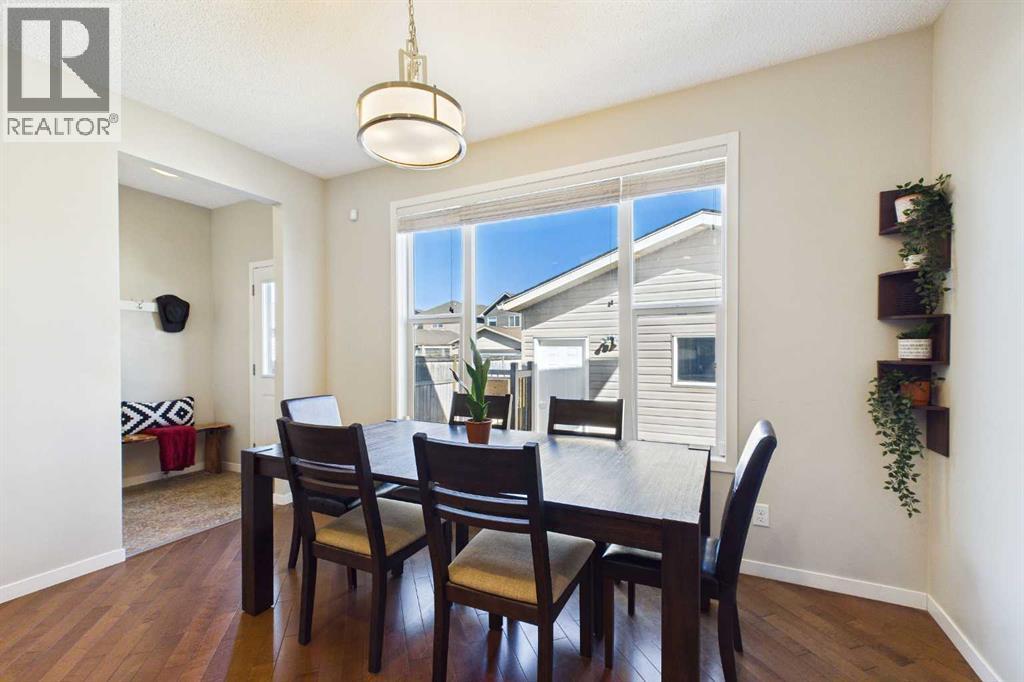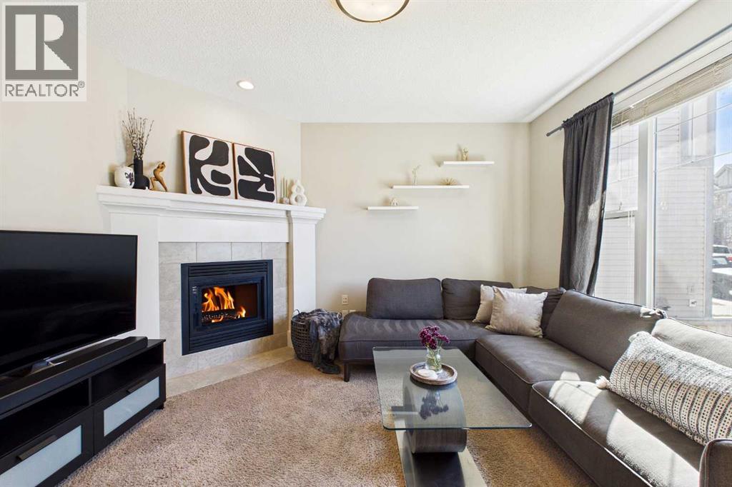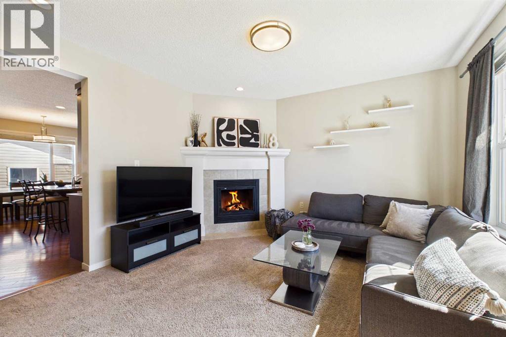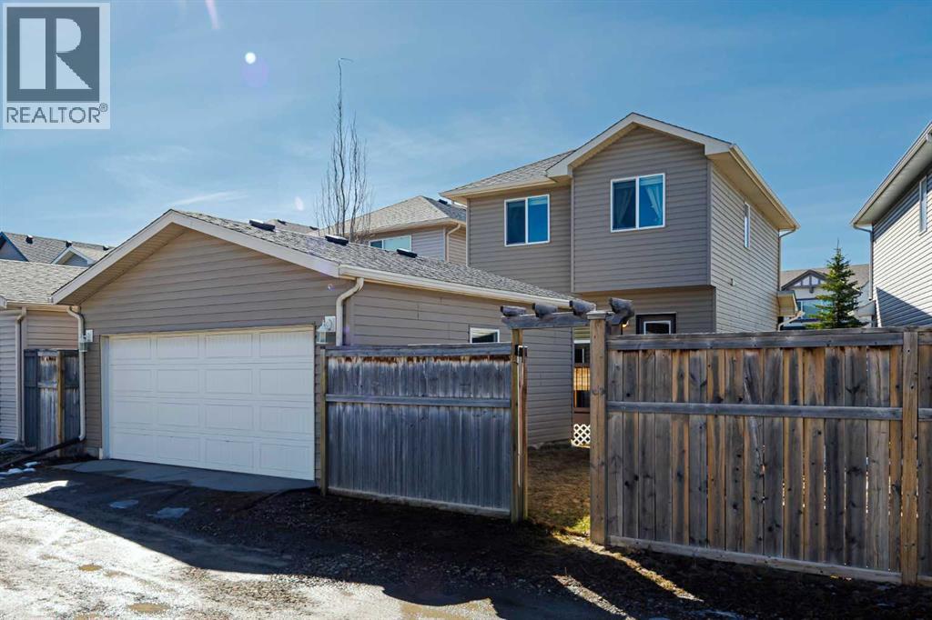 Welcome to this beautifully maintained 3-bedroom, 2.5-bath family home, offering a perfect balance of style, comfort and everyday functionality. Located on a quiet street in the sought after community of Cranston! Thoughtfully designed with 9’ ceilings, large windows, and modern finishes throughout, the bright main floor features an open-concept layout ideal for both relaxing and entertaining. A sun drenched south facing living room welcomes you to the home featuring a cozy gas fireplace. The upgraded kitchen features dark cabinetry, stainless steel appliances, a central island, a corner pantry, and rich hardwood flooring, all flowing into a spacious dining area perfect for hosting. At the rear of the home, a practical mudroom leads out to a fully fenced & landscaped backyard with a generous 2 tiered deck and a double detached garage, offering both convenience and a great outdoor living space. Upstairs, the spacious primary suite includes California Closet built-ins showcasing the large walk in closet, and a private 3pc ensuite, while two additional bedrooms and a full bathroom provide plenty of room for family or guests. The basement offers great potential for future development with two large windows and a bathroom rough-in. Additional features include a tankless hot water heater for greater efficiency. Ideally located in a family-friendly community close to top-rated schools, amenities, the HOA facility, parks, pathways, the Bow River, and with easy access to Deerfoot and Stoney Trail-this move-in ready home is an incredible opportunity. (id:51989)