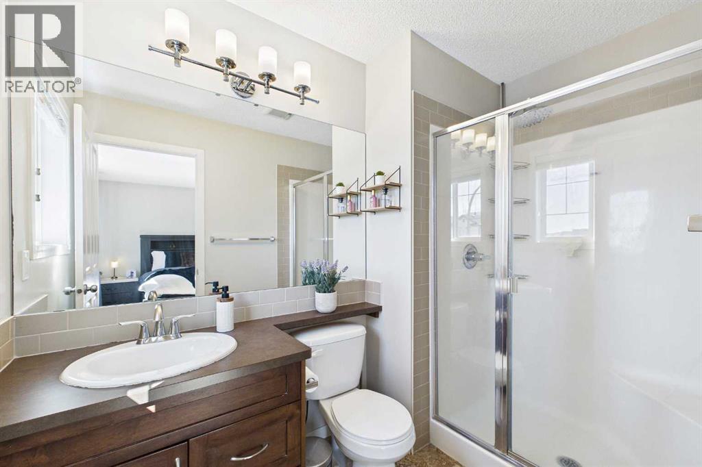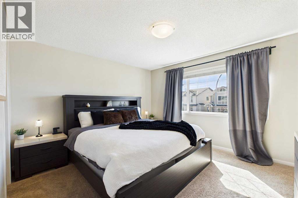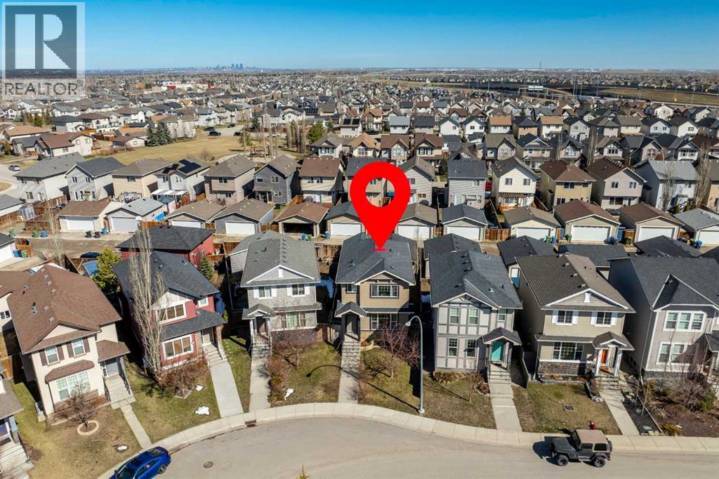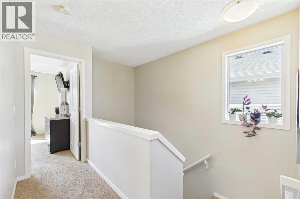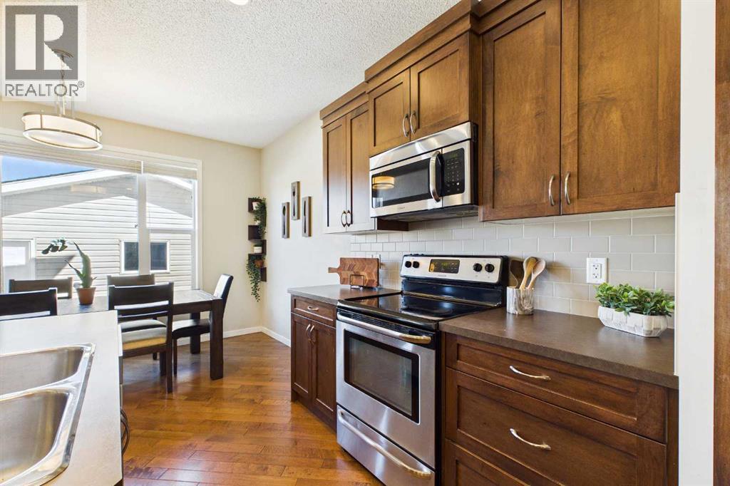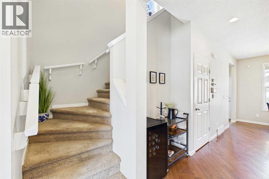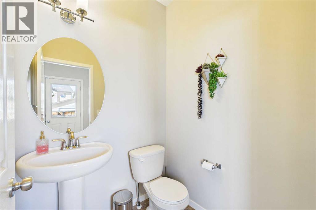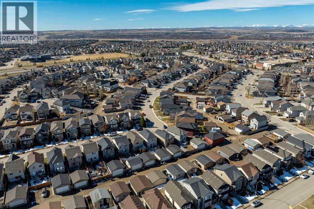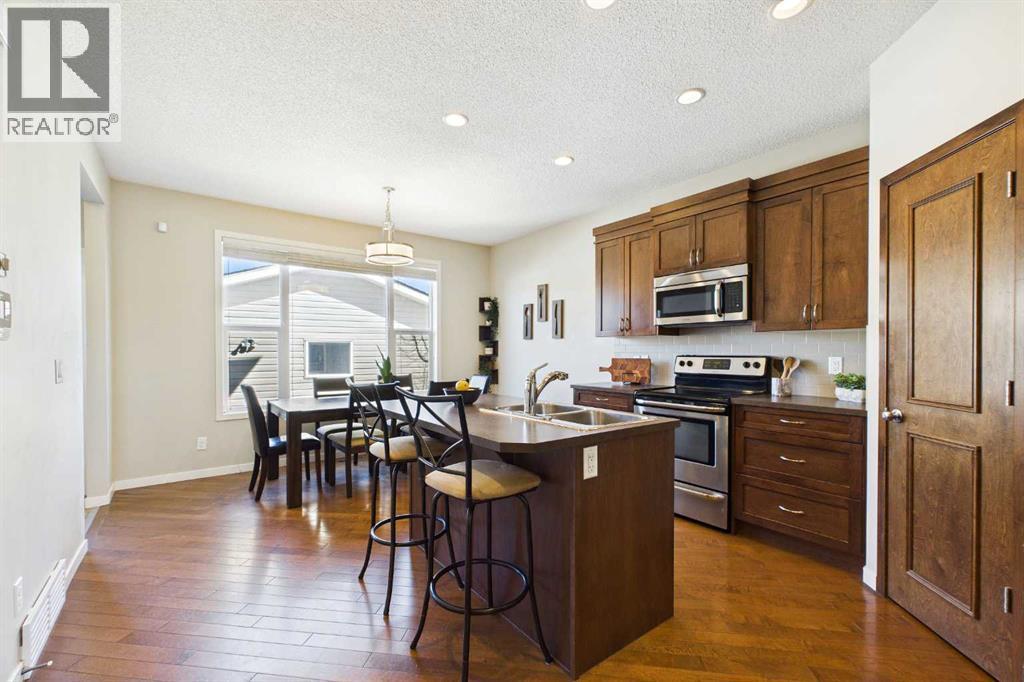 Welcome to this beautifully maintained 3-bedroom, 2.5-bath family home, offering a perfect balance of style, comfort and everyday functionality. Located on a quiet street in the sought after community of Cranston! Thoughtfully designed with 9’ ceilings, large windows, and modern finishes throughout, the bright main floor features an open-concept layout ideal for both relaxing and entertaining. A sun drenched south facing living room welcomes you to the home featuring a cozy gas fireplace. The upgraded kitchen features dark cabinetry, stainless steel appliances, a central island, a corner pantry, and rich hardwood flooring, all flowing into a spacious dining area perfect for hosting. At the rear of the home, a practical mudroom leads out to a fully fenced & landscaped backyard with a generous 2 tiered deck and a double detached garage, offering both convenience and a great outdoor living space. Upstairs, the spacious primary suite includes California Closet built-ins showcasing the large walk in closet, and a private 3pc ensuite, while two additional bedrooms and a full bathroom provide plenty of room for family or guests. The basement offers great potential for future development with two large windows and a bathroom rough-in. Additional features include a tankless hot water heater for greater efficiency. Ideally located in a family-friendly community close to top-rated schools, amenities, the HOA facility, parks, pathways, the Bow River, and with easy access to Deerfoot and Stoney Trail-this move-in ready home is an incredible opportunity. (id:51989)