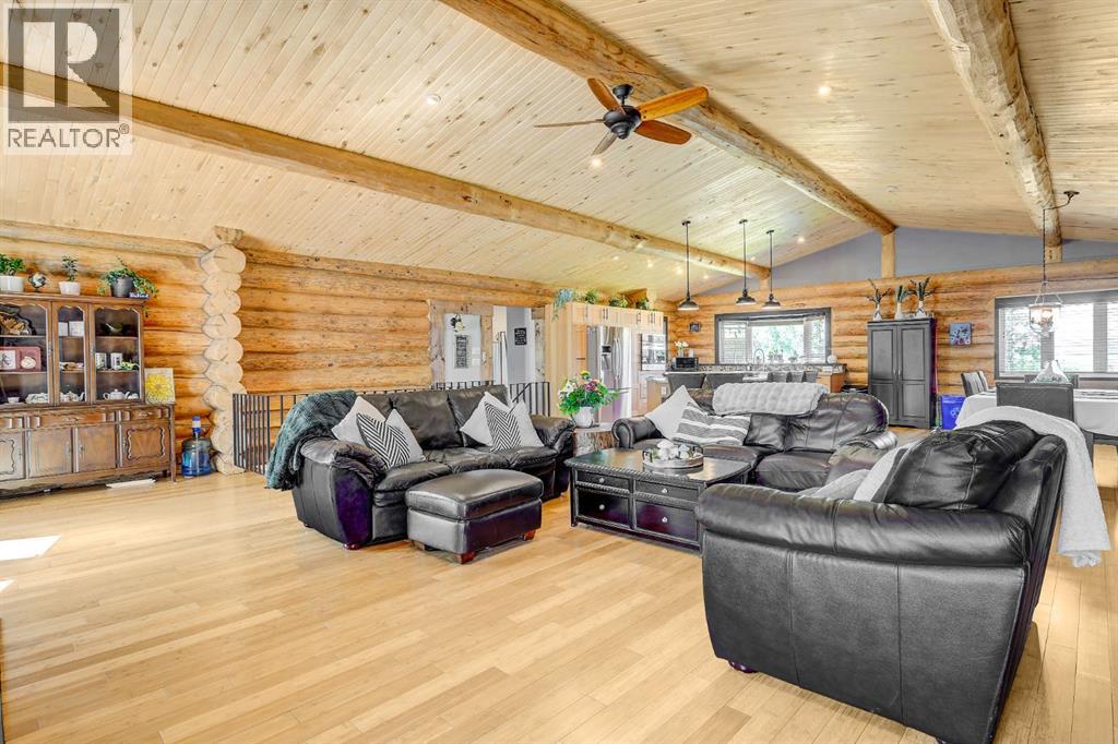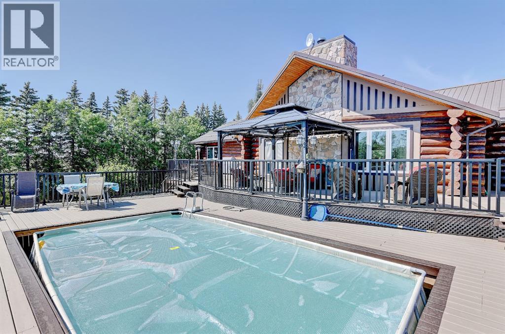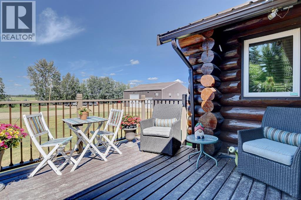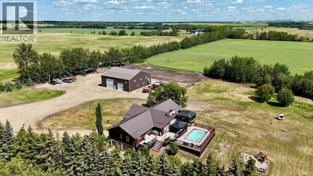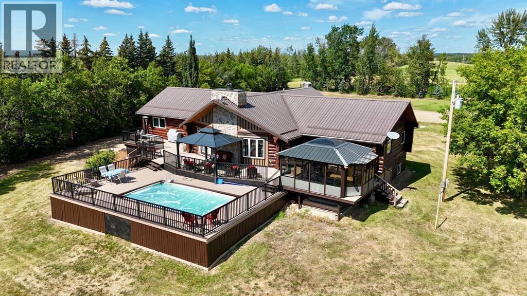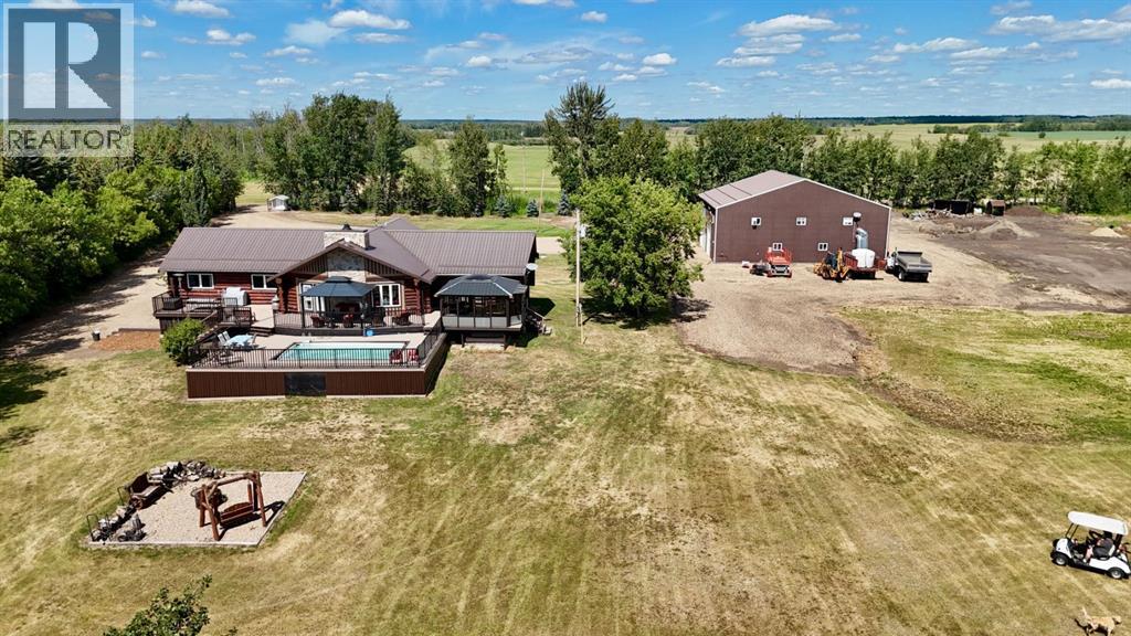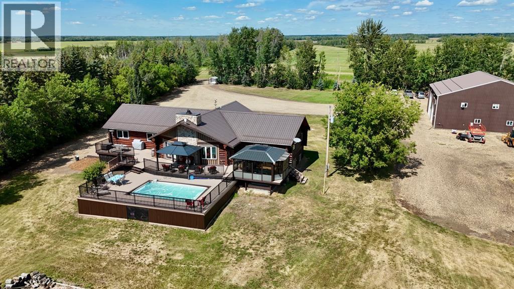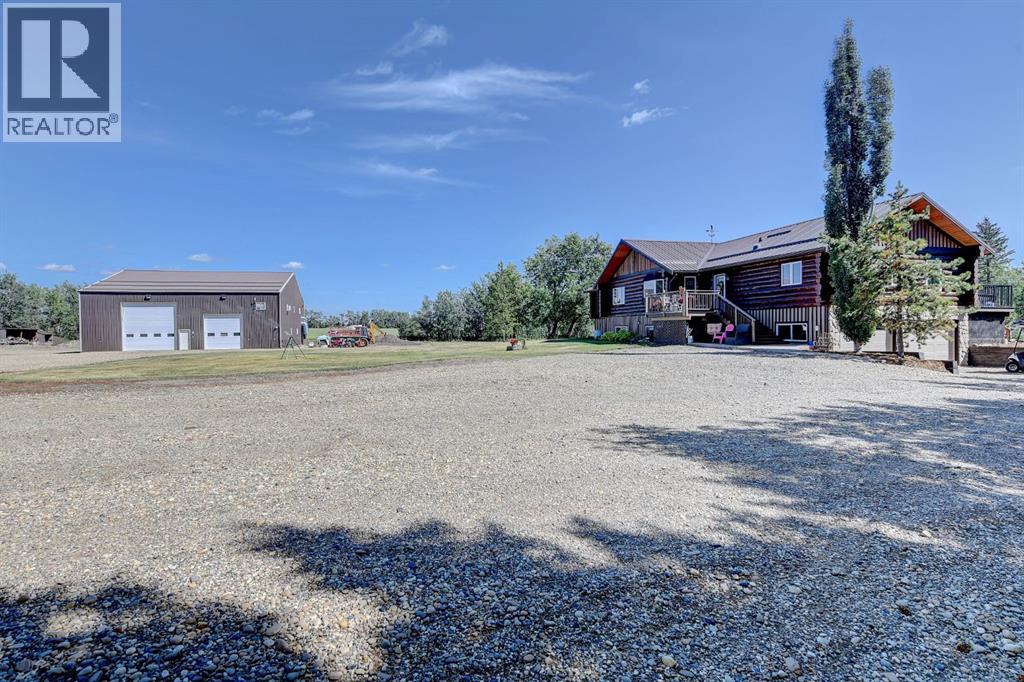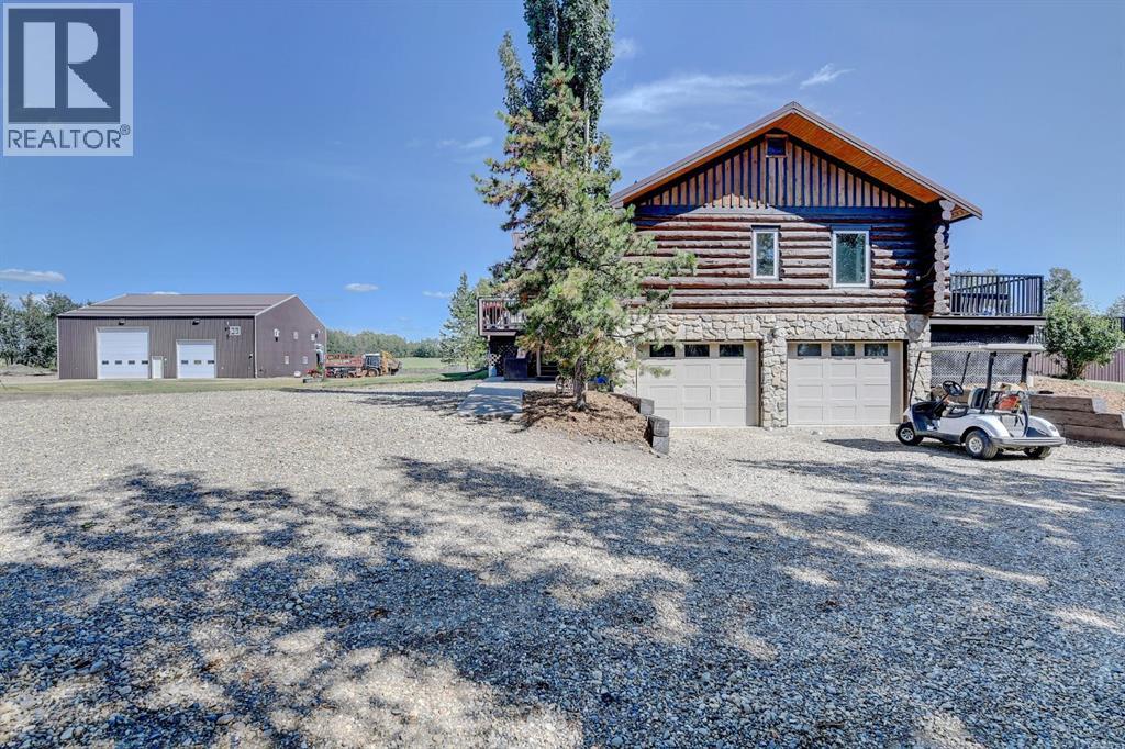 PRIVATE GATED 7-ACRE RETREAT WITH LUXURY LOG HOME AND 60’x60’ HEATED SHOP!Welcome to this extraordinary 7-acre gated and fully fenced estate, showcasing a stunning 2,518 sq ft custom log home built in 2009. This one-of-a-kind property is the perfect blend of rustic elegance and modern comfort, featuring 4 spacious bedrooms, 3 luxurious bathrooms, and a heated 26’ x 28’ attached garage.Step into the open-concept main floor, where you’ll find soaring ceilings, warm bamboo flooring, and a cozy wood-burning fireplace in the expansive living area. The chef’s kitchen is a true highlight with stainless steel appliances, a massive island with quartz counter tops, and ample cabinetry—perfect for entertaining. Enjoy ultimate relaxation in the massive primary suite complete with access to the private deck, pool, and hot tub. The ensuite boasts a steam shower and jetted jacuzzi tub.Three additional bedrooms, a full bathroom with charming clawfoot tub, main floor laundry, and deck access from both the primary and living areas complete the main floor.The fully finished basement features in-floor heating, a large craft room (easily converted back to a 5th bedroom), a gym area, a spacious theatre room, a third full bathroom, and a built-in sauna.Extensive Upgrades Include:•All exterior logs professionally refinished with premium log oil stain•All surrounding decks refinished with high-quality products•New 200,000 BTU boiler•New high-velocity air exchanger•New Boiler Mate hot water system•Central A/C•In-floor basement heat + forced air heating throughoutBackyard Oasis:•Above-ground pool with gas heater•Hot tub in enclosed gazebo•3 natural gas BBQ hookups•Private powered entrance gateMassive 60’ x 60’ Heated Shop:•Fully finished with 11’ x 48’ mezzanine man cave•In-floor heat with insulated floor•Full-length radiant make-up heater•Dual stainless steel sink, shower, RV sewer dump•50-amp interior & exterior RV plugs•Multi ple 20-amp plugs throughout•220V outlets for welder, air compressor, and pressure washer *. Dug out water source for water all outside areas and treesThis exceptional property offers peace, privacy, and high-end amenities rarely found together. Whether you’re seeking a luxurious family retreat or a hobbyist’s paradise, this property delivers it all. (id:51989)