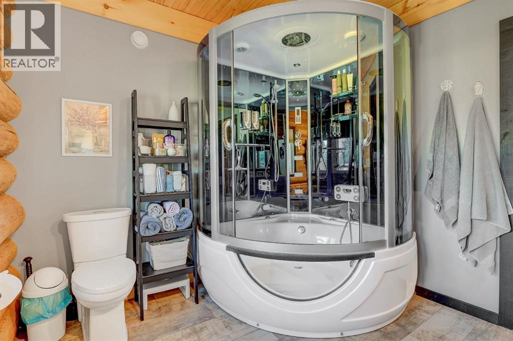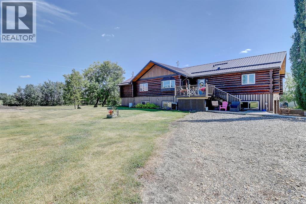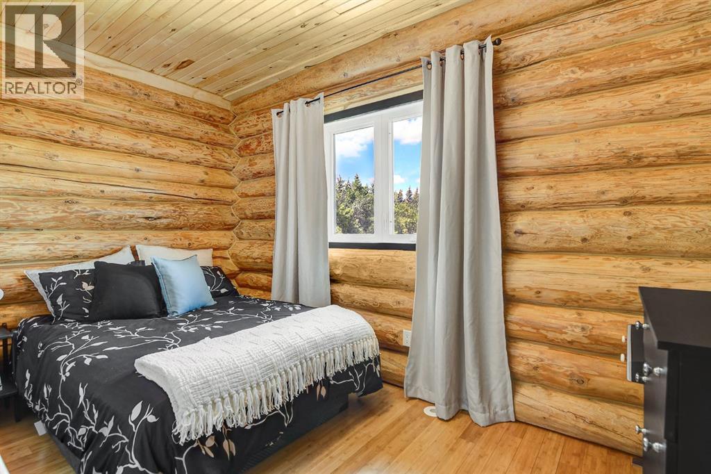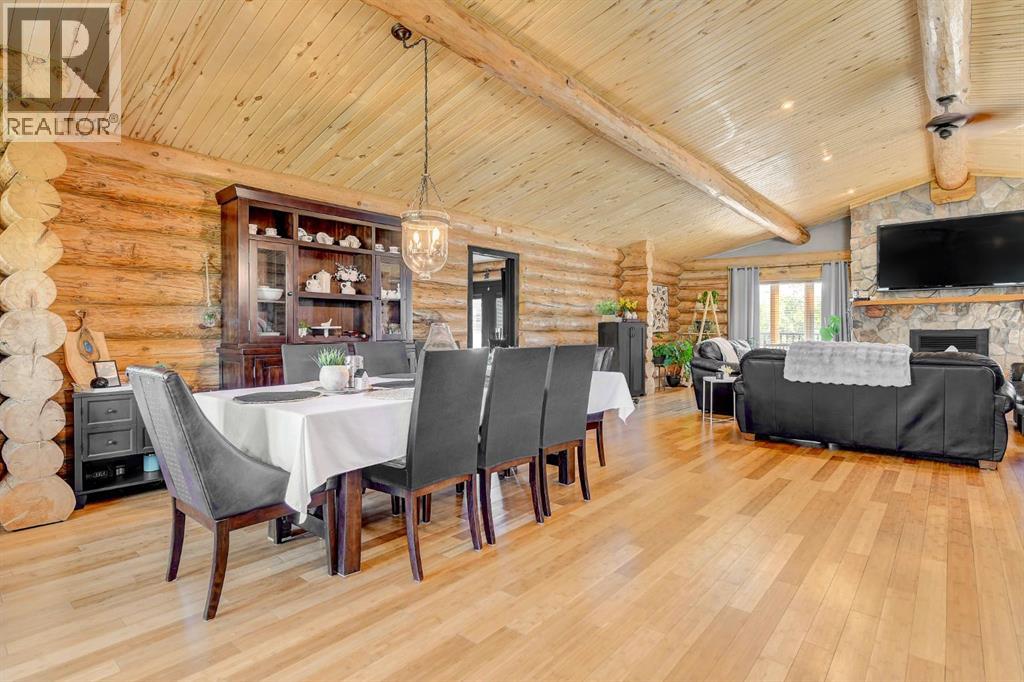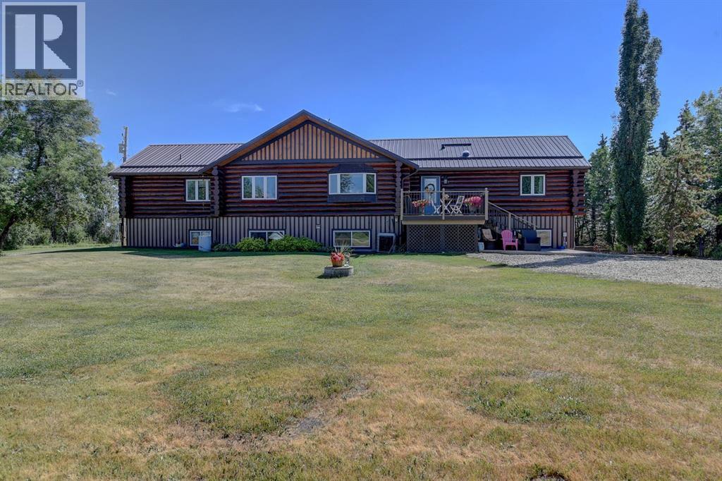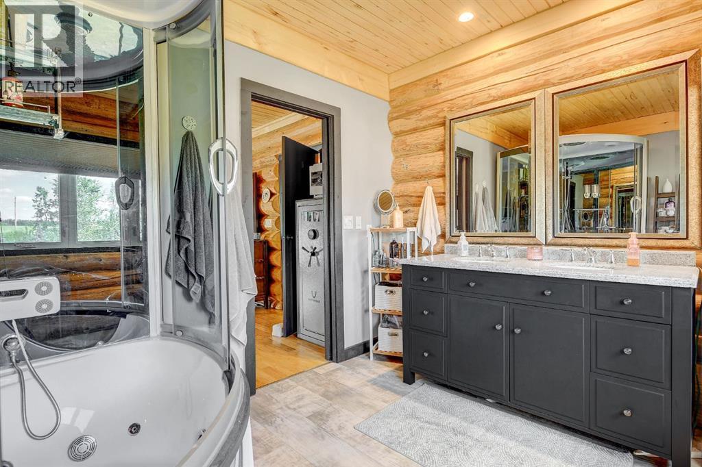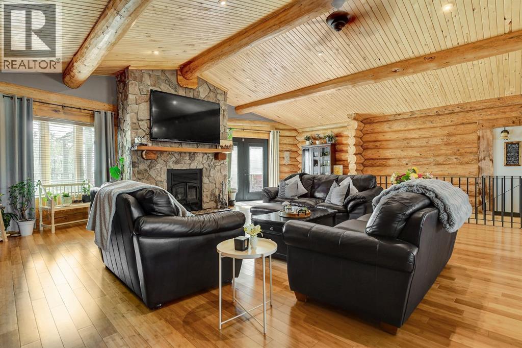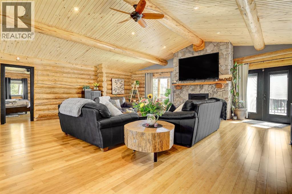 PRIVATE GATED 7-ACRE RETREAT WITH LUXURY LOG HOME AND 60’x60’ HEATED SHOP!Welcome to this extraordinary 7-acre gated and fully fenced estate, showcasing a stunning 2,518 sq ft custom log home built in 2009. This one-of-a-kind property is the perfect blend of rustic elegance and modern comfort, featuring 4 spacious bedrooms, 3 luxurious bathrooms, and a heated 26’ x 28’ attached garage.Step into the open-concept main floor, where you’ll find soaring ceilings, warm bamboo flooring, and a cozy wood-burning fireplace in the expansive living area. The chef’s kitchen is a true highlight with stainless steel appliances, a massive island with quartz counter tops, and ample cabinetry—perfect for entertaining. Enjoy ultimate relaxation in the massive primary suite complete with access to the private deck, pool, and hot tub. The ensuite boasts a steam shower and jetted jacuzzi tub.Three additional bedrooms, a full bathroom with charming clawfoot tub, main floor laundry, and deck access from both the primary and living areas complete the main floor.The fully finished basement features in-floor heating, a large craft room (easily converted back to a 5th bedroom), a gym area, a spacious theatre room, a third full bathroom, and a built-in sauna.Extensive Upgrades Include:•All exterior logs professionally refinished with premium log oil stain•All surrounding decks refinished with high-quality products•New 200,000 BTU boiler•New high-velocity air exchanger•New Boiler Mate hot water system•Central A/C•In-floor basement heat + forced air heating throughoutBackyard Oasis:•Above-ground pool with gas heater•Hot tub in enclosed gazebo•3 natural gas BBQ hookups•Private powered entrance gateMassive 60’ x 60’ Heated Shop:•Fully finished with 11’ x 48’ mezzanine man cave•In-floor heat with insulated floor•Full-length radiant make-up heater•Dual stainless steel sink, shower, RV sewer dump•50-amp interior & exterior RV plugs•Multi ple 20-amp plugs throughout•220V outlets for welder, air compressor, and pressure washer *. Dug out water source for water all outside areas and treesThis exceptional property offers peace, privacy, and high-end amenities rarely found together. Whether you’re seeking a luxurious family retreat or a hobbyist’s paradise, this property delivers it all. (id:51989)