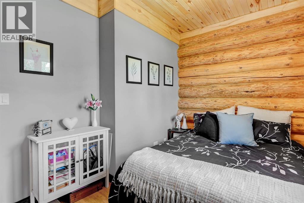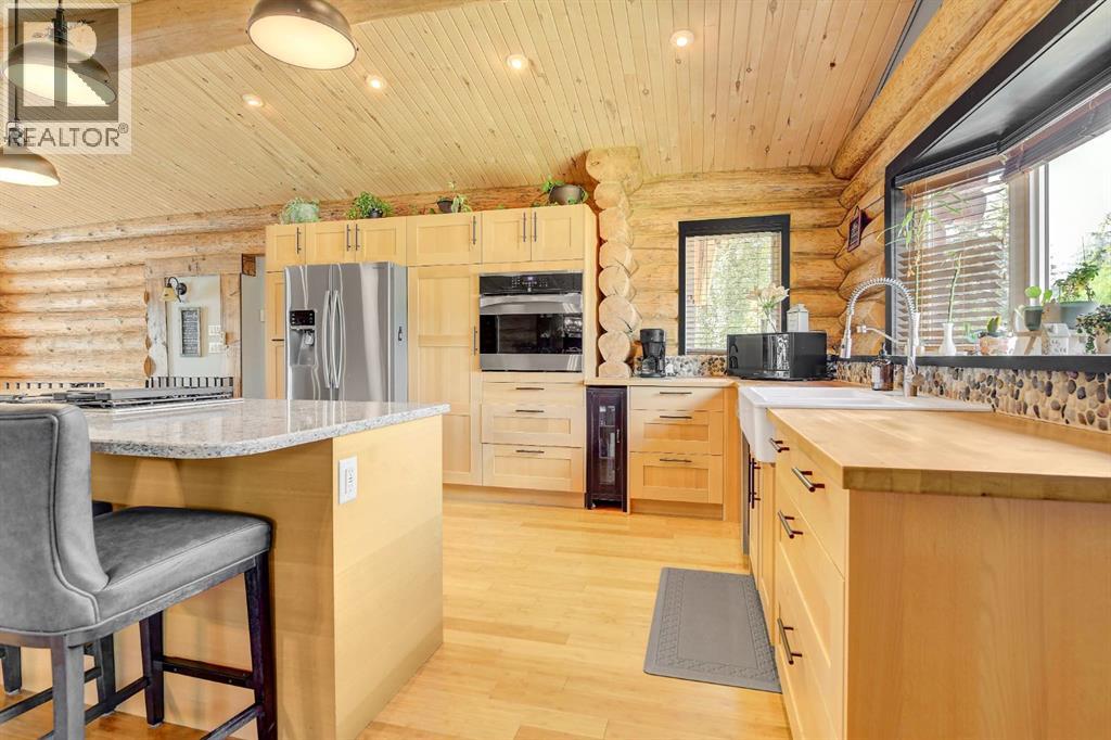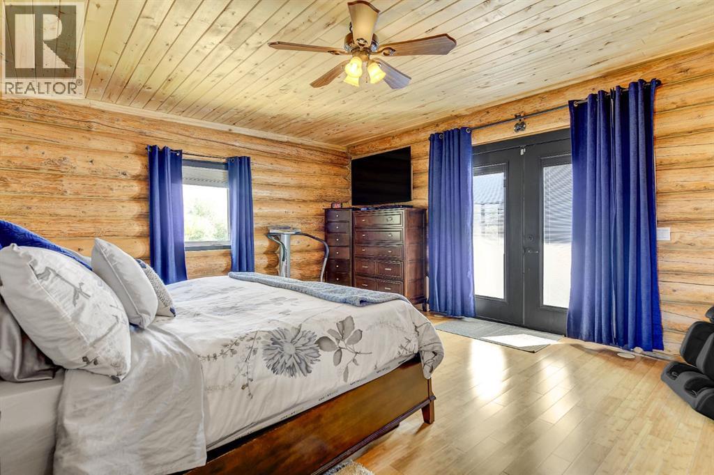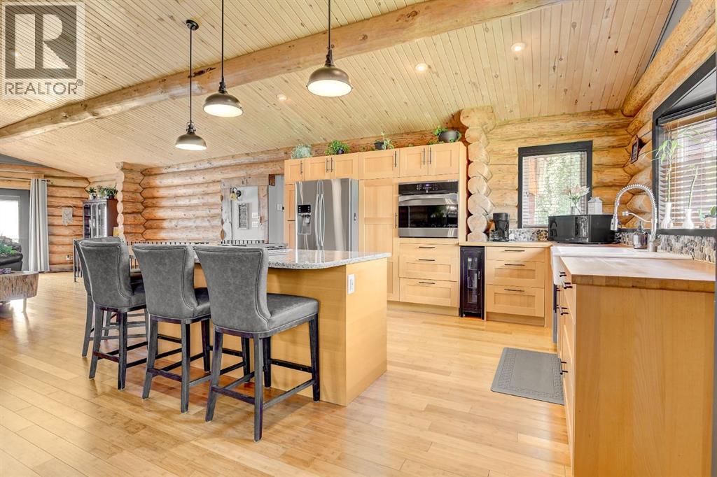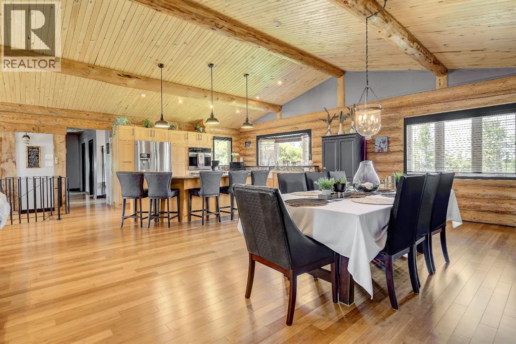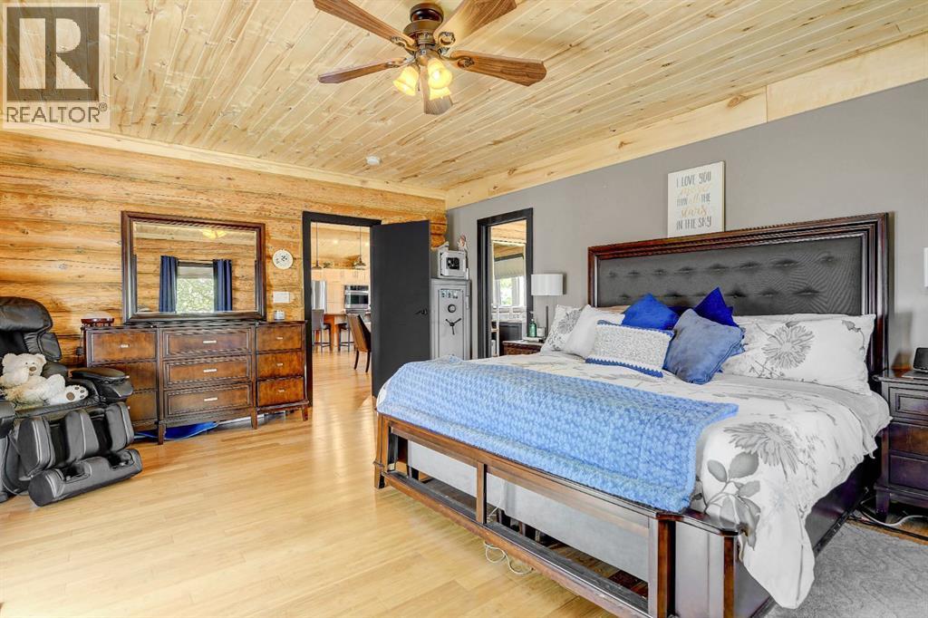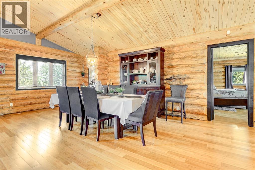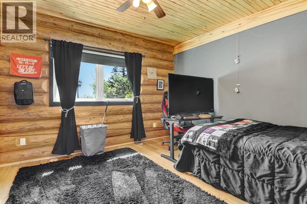 PRIVATE GATED 7-ACRE RETREAT WITH LUXURY LOG HOME AND 60’x60’ HEATED SHOP!Welcome to this extraordinary 7-acre gated and fully fenced estate, showcasing a stunning 2,518 sq ft custom log home built in 2009. This one-of-a-kind property is the perfect blend of rustic elegance and modern comfort, featuring 4 spacious bedrooms, 3 luxurious bathrooms, and a heated 26’ x 28’ attached garage.Step into the open-concept main floor, where you’ll find soaring ceilings, warm bamboo flooring, and a cozy wood-burning fireplace in the expansive living area. The chef’s kitchen is a true highlight with stainless steel appliances, a massive island with quartz counter tops, and ample cabinetry—perfect for entertaining. Enjoy ultimate relaxation in the massive primary suite complete with access to the private deck, pool, and hot tub. The ensuite boasts a steam shower and jetted jacuzzi tub.Three additional bedrooms, a full bathroom with charming clawfoot tub, main floor laundry, and deck access from both the primary and living areas complete the main floor.The fully finished basement features in-floor heating, a large craft room (easily converted back to a 5th bedroom), a gym area, a spacious theatre room, a third full bathroom, and a built-in sauna.Extensive Upgrades Include:•All exterior logs professionally refinished with premium log oil stain•All surrounding decks refinished with high-quality products•New 200,000 BTU boiler•New high-velocity air exchanger•New Boiler Mate hot water system•Central A/C•In-floor basement heat + forced air heating throughoutBackyard Oasis:•Above-ground pool with gas heater•Hot tub in enclosed gazebo•3 natural gas BBQ hookups•Private powered entrance gateMassive 60’ x 60’ Heated Shop:•Fully finished with 11’ x 48’ mezzanine man cave•In-floor heat with insulated floor•Full-length radiant make-up heater•Dual stainless steel sink, shower, RV sewer dump•50-amp interior & exterior RV plugs•Multi ple 20-amp plugs throughout•220V outlets for welder, air compressor, and pressure washer *. Dug out water source for water all outside areas and treesThis exceptional property offers peace, privacy, and high-end amenities rarely found together. Whether you’re seeking a luxurious family retreat or a hobbyist’s paradise, this property delivers it all. (id:51989)