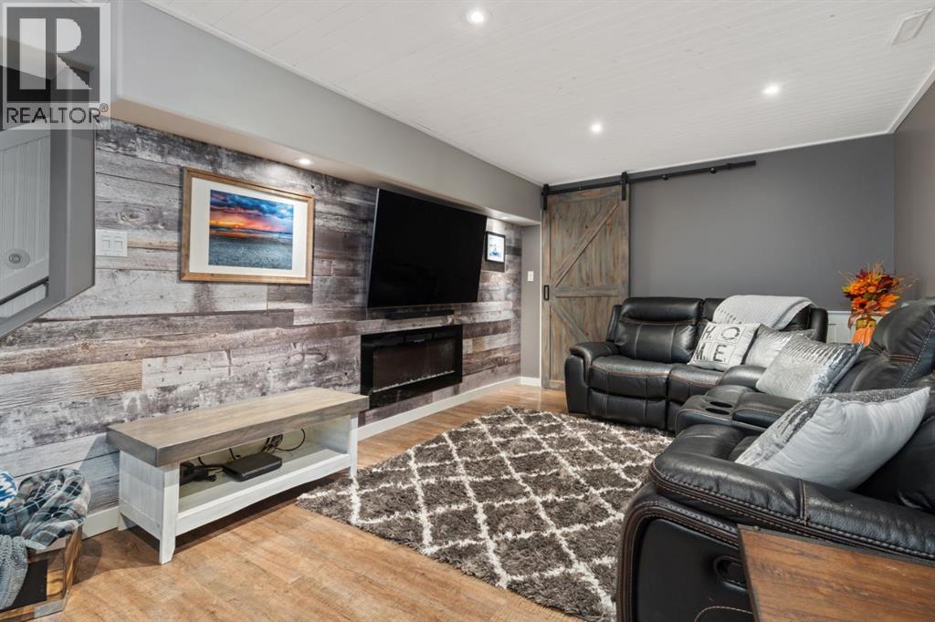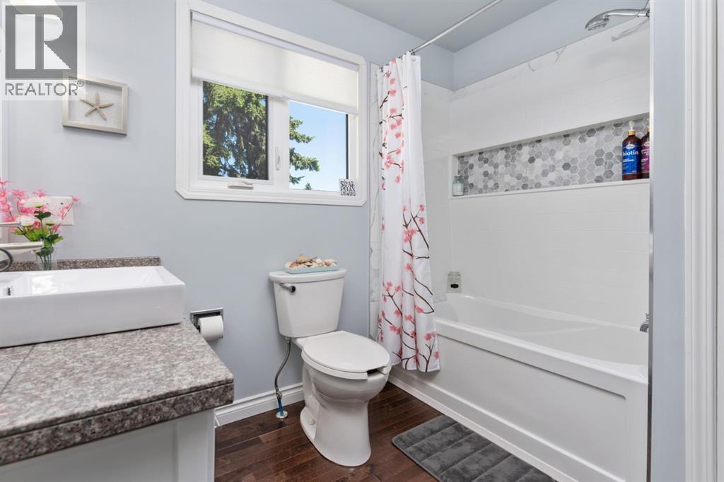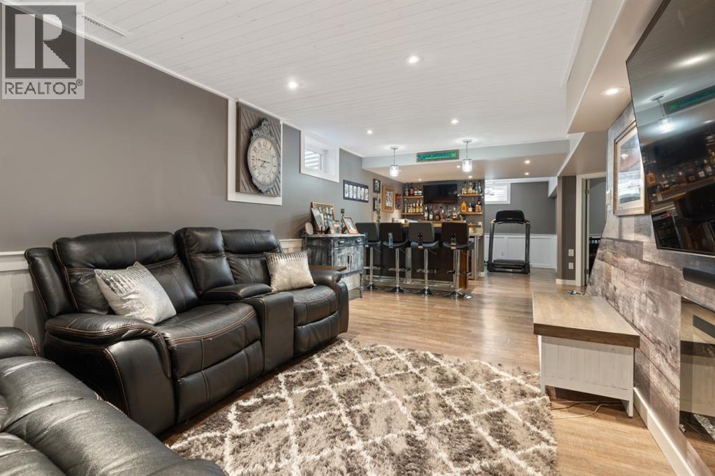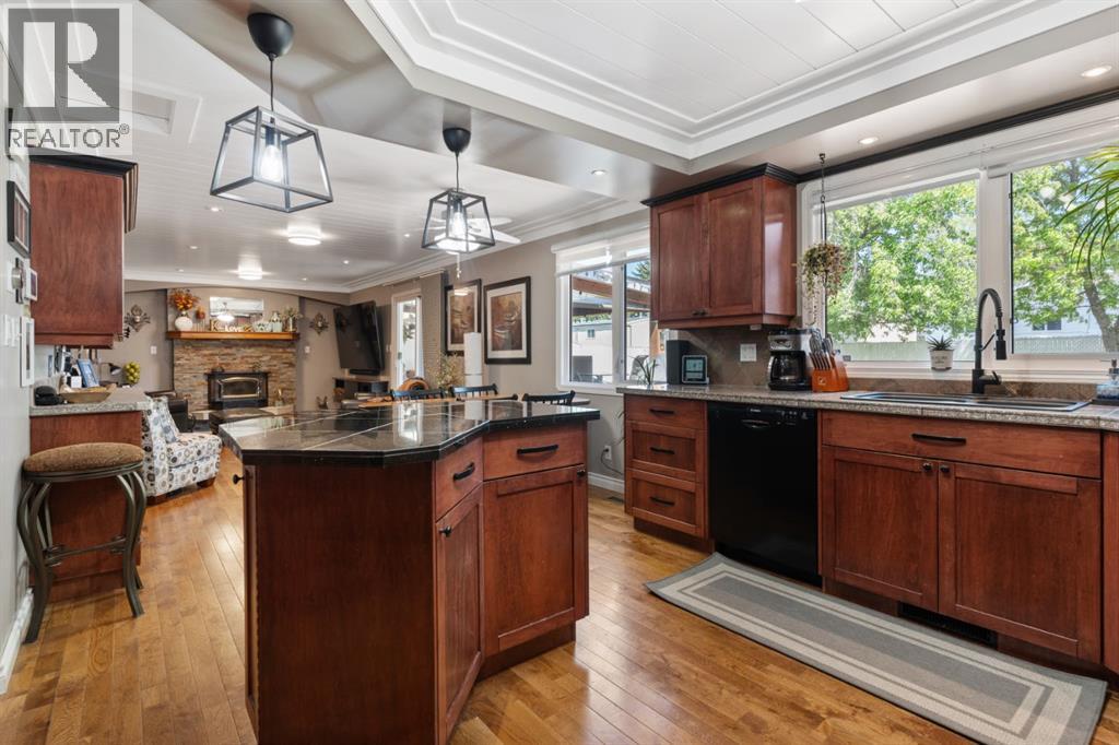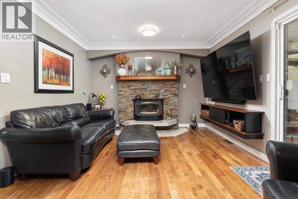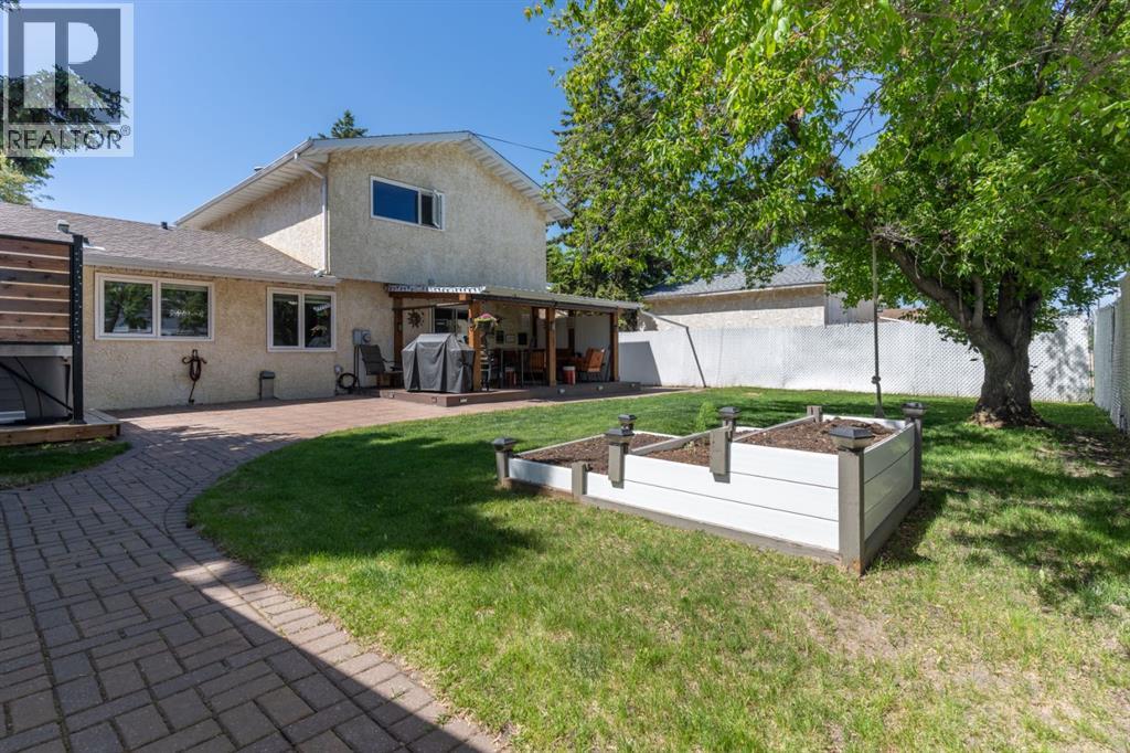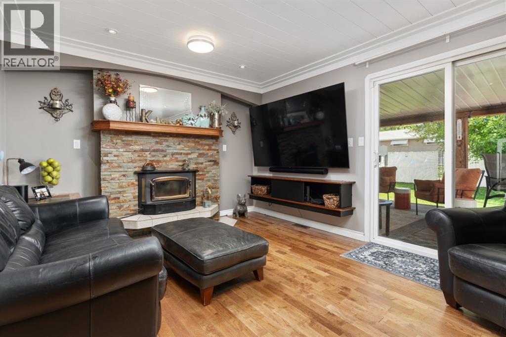 Welcome Home to 4313 - 66 St - a True Show Stopper! Step into comfort and style with this beautifully renovated home that blends timeless charm with modern upgrades. Perfect for families, this property offers a warm, welcoming atmosphere with thoughtful features throughout. Custom Cabinetry and granite tile counters, updated vinyl windows, rich hardwood flooring, doors/trims, pex plumbing, wainscotting, crown mouldings, custom wood features and so much more. From the bright West Facing living room you find a dedicated home office that could be converted back to a dining area as needed although there is a dinette off of the Fully Updated Custom Kitchen. Relax around the wood stove insert fireplace with beautiful stone finish or duck through the slider doors to a private covered deck with gas line for fire pit and roll down screens to keep out the wind. Around the corner you'll find a wonderful back entry, with outdoor and garage access, a 2pc bath for guests and handy laundry with built-in cabinetry. Follow the Hardwood Floors upstairs to find 3 well appointed bedrooms - the Primary with a beautiful custom 4pc ensuite - and an additional fully renovated 4pc bathroom. Retire to the fully renovated basement for the big game and enjoy in the custom bar and family room. You'll also find a 4th bedroom, a 3pc bathroom, Flex room and what every home of this size needs - a Huge Storage room. Enjoy the outdoors with mature trees, low maintenance front patio and back covered deck, stone paver walkways, a private hot tub area (hot tub negotiable), a handy shed and fenced with gate for future parking. Finally you'll find an attached 22x24 Heated Garage with built-in workbench and shelving. This home has been meticulously planned and masterfully updated - you'll love coming home. (id:51989)