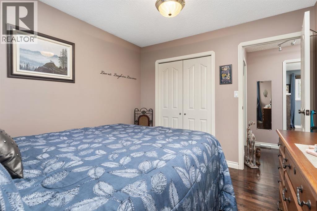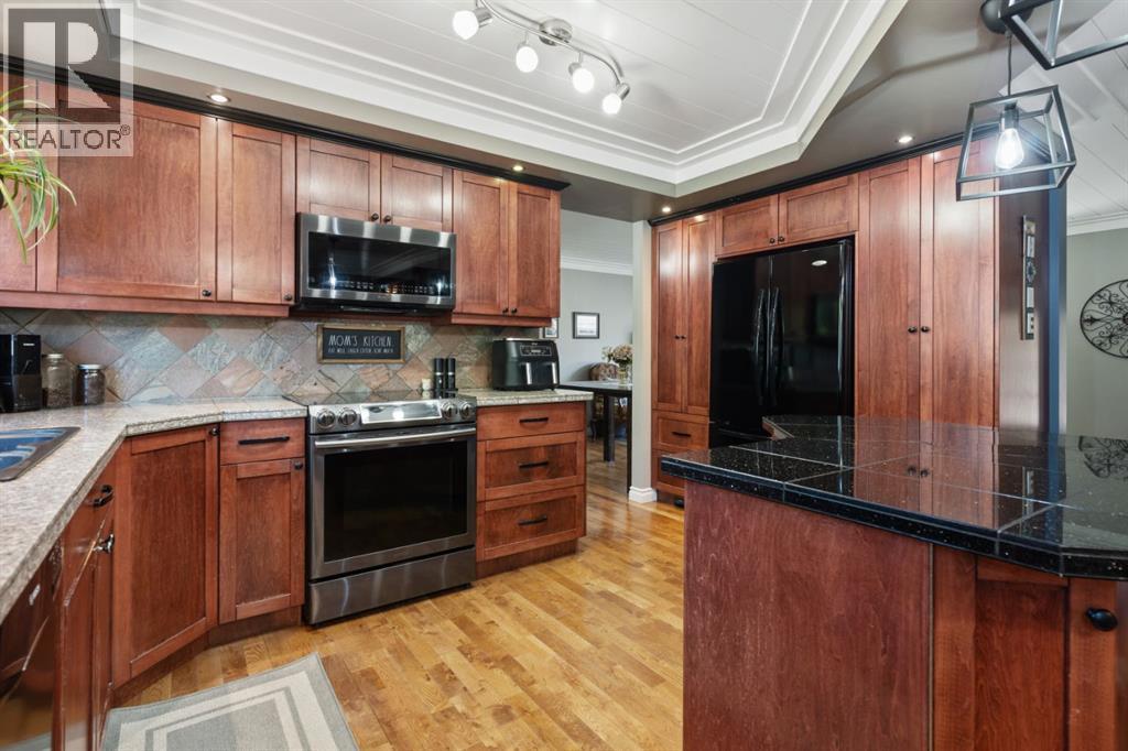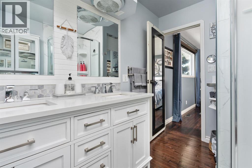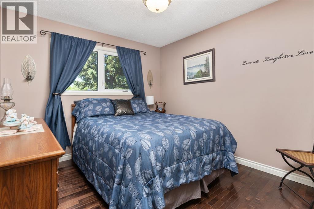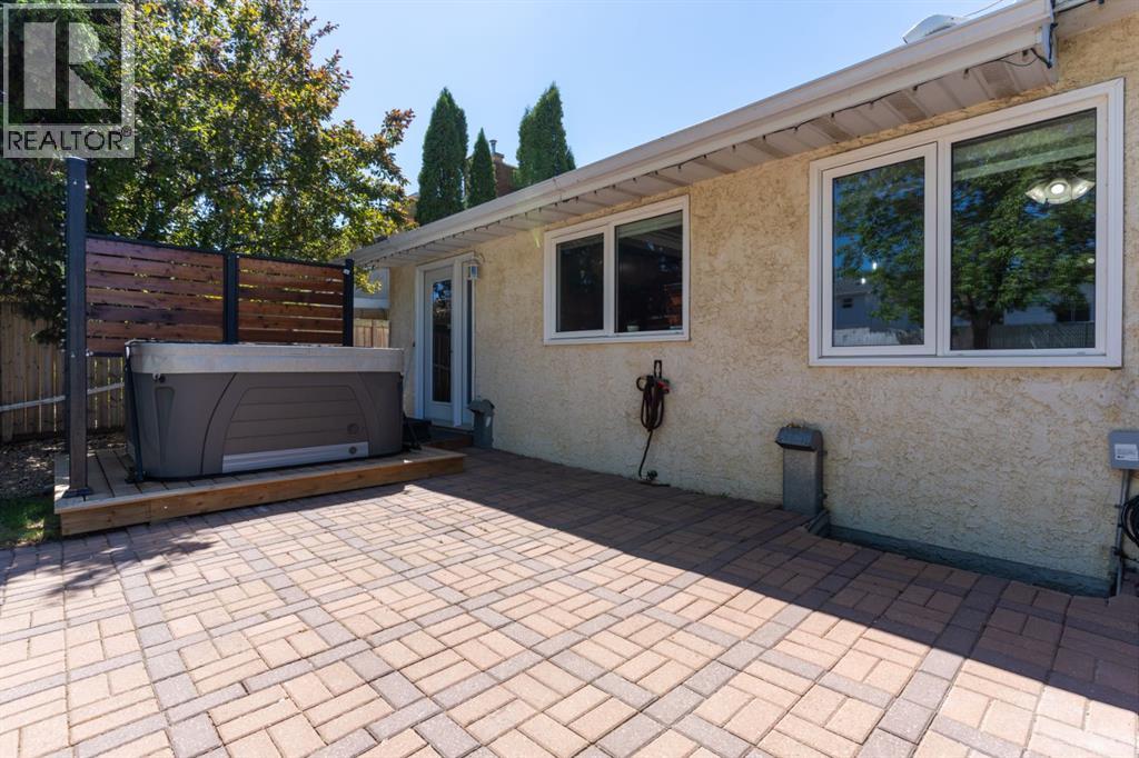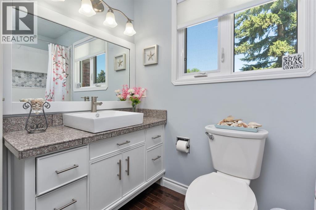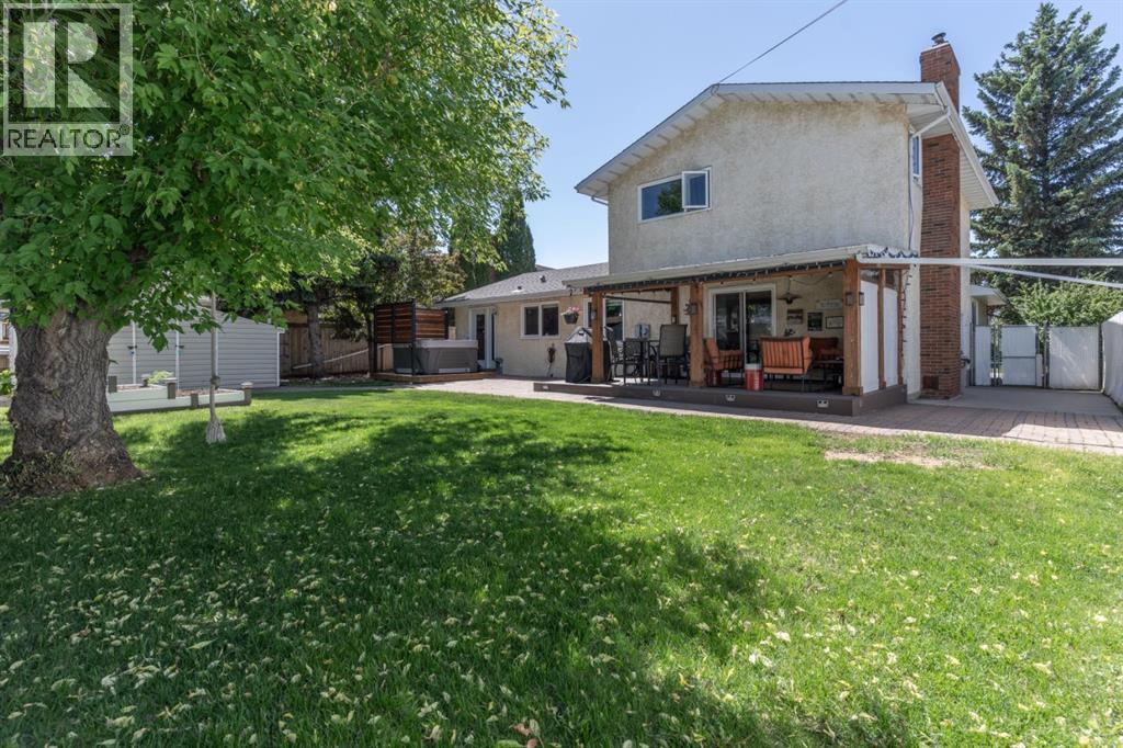 Welcome Home to 4313 - 66 St - a True Show Stopper! Step into comfort and style with this beautifully renovated home that blends timeless charm with modern upgrades. Perfect for families, this property offers a warm, welcoming atmosphere with thoughtful features throughout. Custom Cabinetry and granite tile counters, updated vinyl windows, rich hardwood flooring, doors/trims, pex plumbing, wainscotting, crown mouldings, custom wood features and so much more. From the bright West Facing living room you find a dedicated home office that could be converted back to a dining area as needed although there is a dinette off of the Fully Updated Custom Kitchen. Relax around the wood stove insert fireplace with beautiful stone finish or duck through the slider doors to a private covered deck with gas line for fire pit and roll down screens to keep out the wind. Around the corner you'll find a wonderful back entry, with outdoor and garage access, a 2pc bath for guests and handy laundry with built-in cabinetry. Follow the Hardwood Floors upstairs to find 3 well appointed bedrooms - the Primary with a beautiful custom 4pc ensuite - and an additional fully renovated 4pc bathroom. Retire to the fully renovated basement for the big game and enjoy in the custom bar and family room. You'll also find a 4th bedroom, a 3pc bathroom, Flex room and what every home of this size needs - a Huge Storage room. Enjoy the outdoors with mature trees, low maintenance front patio and back covered deck, stone paver walkways, a private hot tub area (hot tub negotiable), a handy shed and fenced with gate for future parking. Finally you'll find an attached 22x24 Heated Garage with built-in workbench and shelving. This home has been meticulously planned and masterfully updated - you'll love coming home. (id:51989)