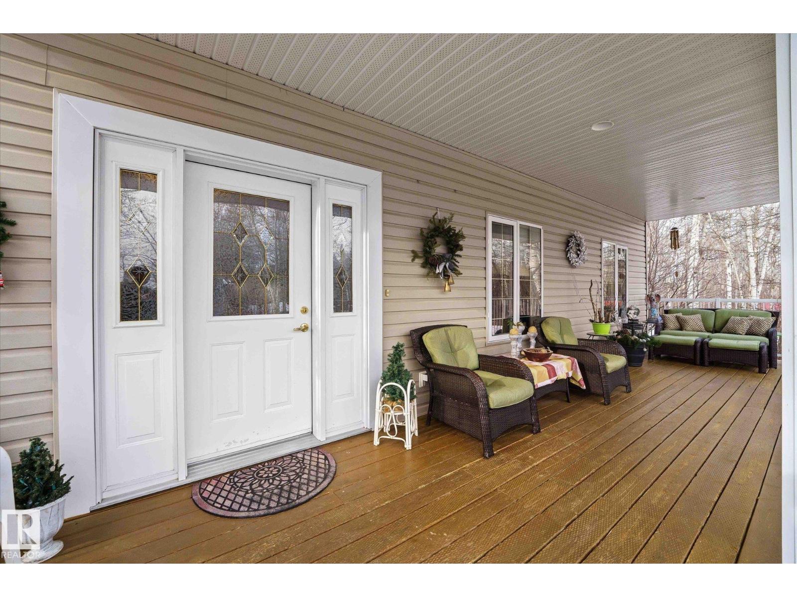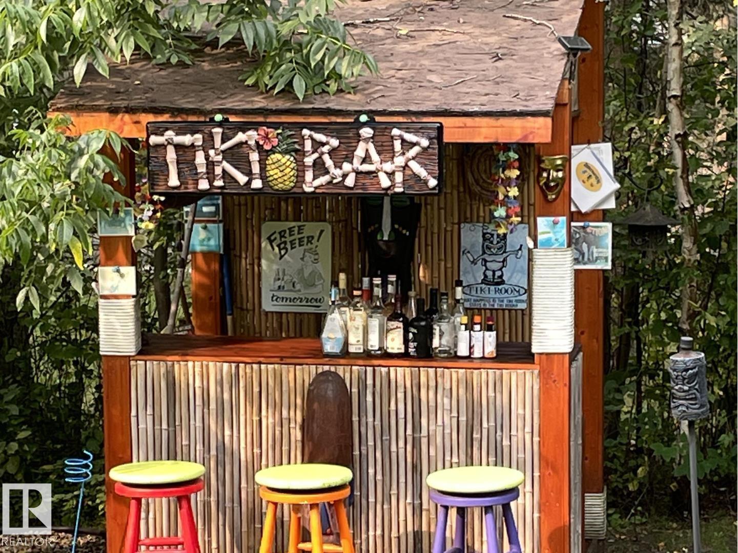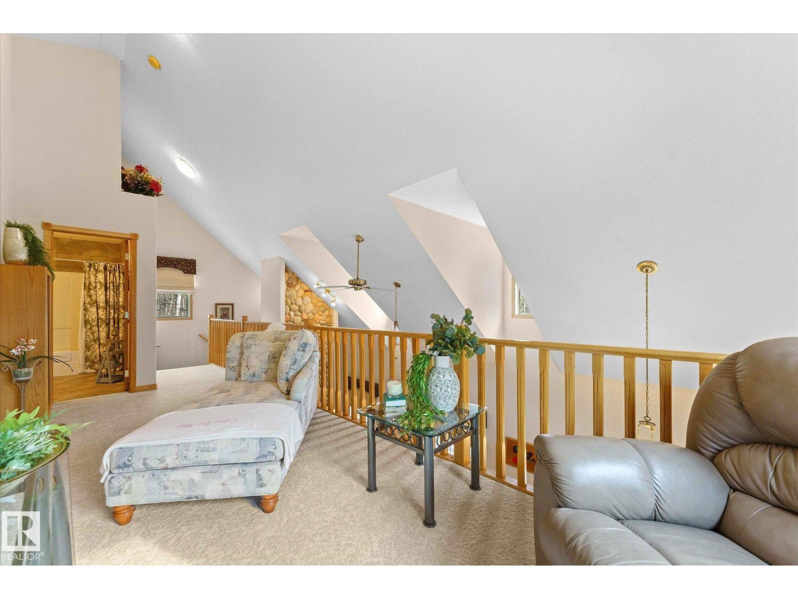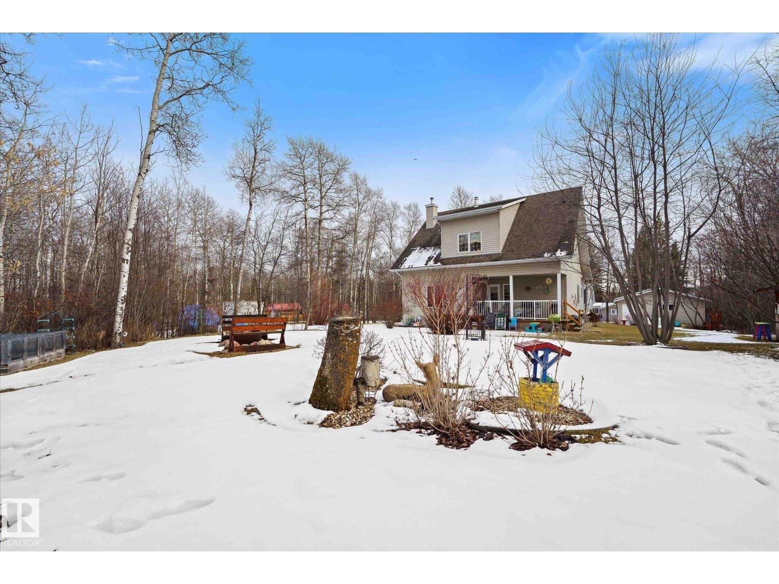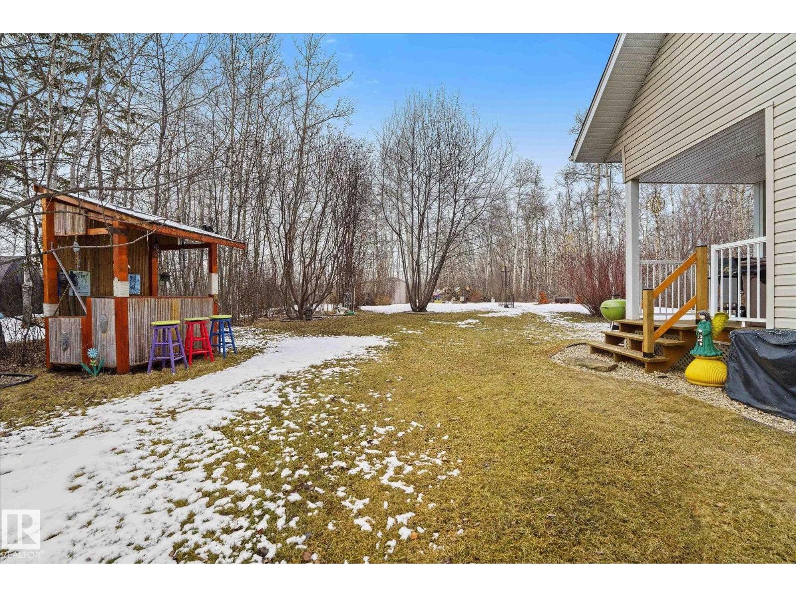 Acreage living just steps from the lake, less than an hour from the city! Welcome to Wizard Lake, a true hidden gem. This well maintained home makes a stunning first impression with its inviting covered front porch and incredible landscaping. Step inside to soaring ceilings and a striking river rock, wood-burning fireplace. The open concept living, kitchen, and dining area is perfect for entertaining. The main floor also features a bedroom and a 3-piece bathroom, ideal for flexible living. Out back, enjoy a second covered deck with a gas line for BBQs, plus your very own Tiki Bar perfect for hosting summer evenings. Upstairs, you’ll find a charming loft, a full bathroom, and an impressive primary retreat complete with a massive walk-in closet and a cozy fireplace for those winter nights. The basement offers a spacious rec room, an additional bedroom or den, rough-in for a future bathroom, and plenty of storage. Enjoy your private yard with raised garden beds, fruit trees and more after a day on the lake! (id:51989)