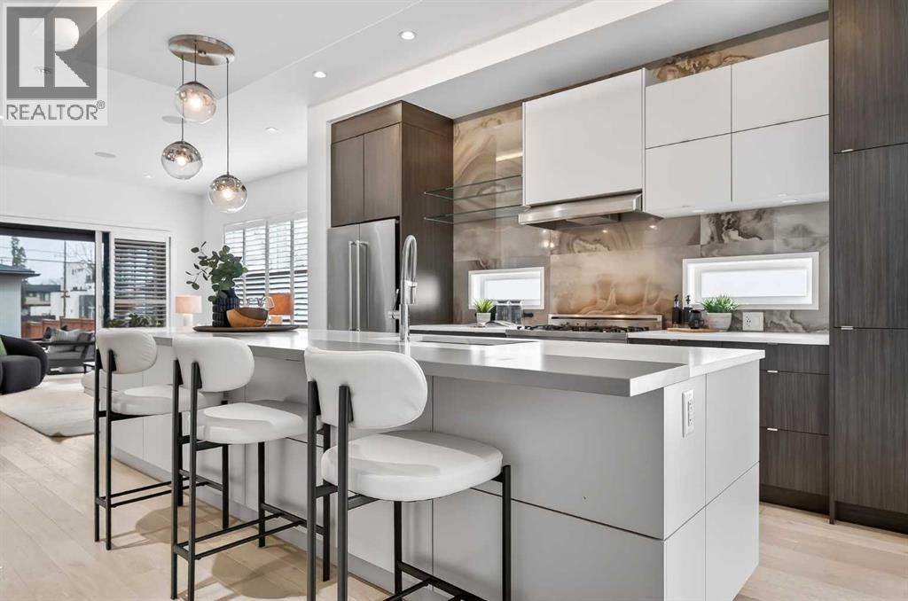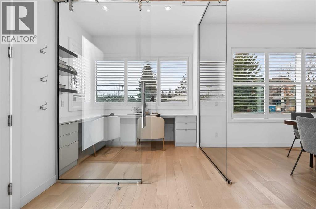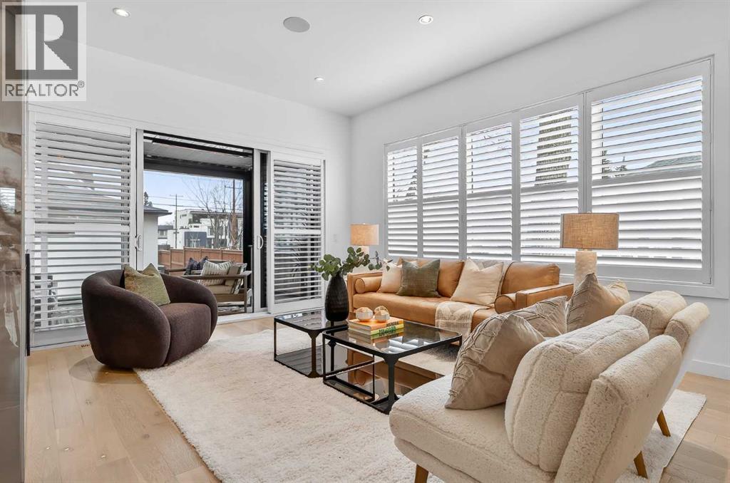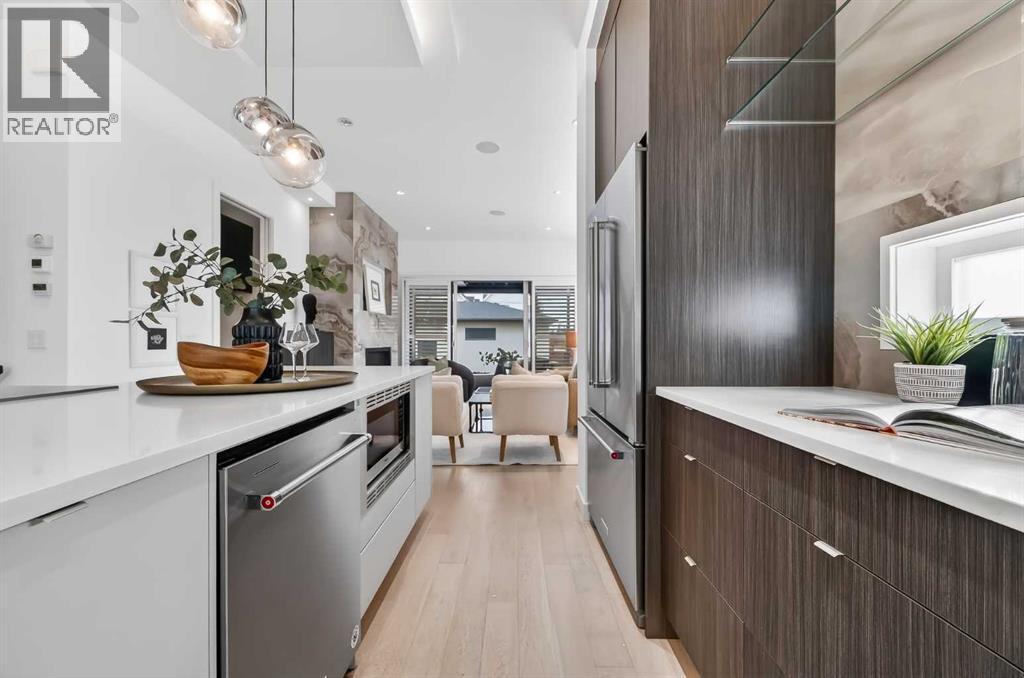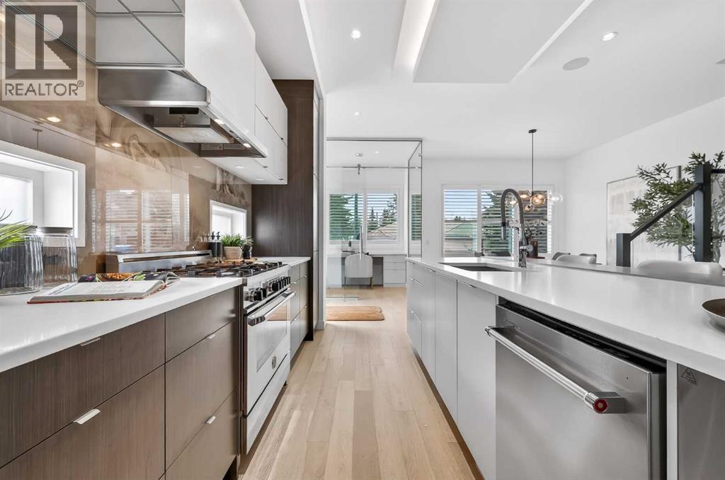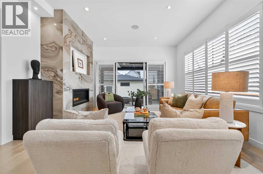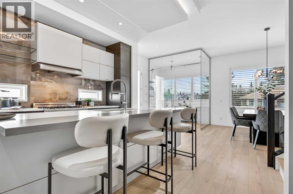 An exceptional and unique residence by William Blake Custom Homes, this beautifully appointed corner home in the heart of Altadore offers over 3,090sq.ft. of refined living space, featuring 4 bedrooms and 3.5 bathrooms. Thoughtfully designed for modern living, the home combines clean architectural lines with high-end finishes and functional elegance throughout.A private corner entrance welcomes you into a bright, open main floor highlighted by soaring 10-foot ceilings and wide-plank white oak engineered hardwood. At the front, a striking glass-enclosed office framed by south-facing windows creates a light-filled workspace. The adjacent formal dining area is anchored by a statement glass globe chandelier, perfect for entertaining.The chef-inspired kitchen is the centrepiece of the home, showcasing a remarkable 16-foot two-toned quartz island with feature lighting above. Premium stainless steel Italian appliances include a 5-burner F.lli Bertazzoni gas range, complemented by a porcelain tile backsplash and unique lower window detailing beneath the cabinetry—an uncommon and thoughtful design element that enhances natural light. The kitchen flows seamlessly into the living room, where a gas fireplace with bookmatched marble porcelain tile creates a warm and sophisticated focal point. Double sliding doors open to a truly standout outdoor retreat. A professionally installed Suncoast enclosure—valued at over $53,000—creates a year-round oasis complete with built-in electric heaters, a gas-assisted fireplace, and generous seating space. Ideal for entertaining or relaxing, this space extends your living area in every season. A spacious mudroom with built-in cabinetry and a stylish powder room complete the main level. Upstairs, hardwood flooring continues throughout, leading to an open workspace enhanced by a large skylight. The upper laundry room is well-equipped with a sink, quartz countertops, and ample cabinetry. Two spacious bedrooms and a beautifully finished full bat hroom with quartz surfaces and a fully tiled tub/shower complete this level.The primary suite is a private retreat, featuring 10-foot ceilings, large windows, and a statement chandelier. A generous walk-in closet provides exceptional storage, while the spa-inspired 5-piece ensuite offers quartz countertops, Calacatta-style tile, a fully tiled glass rain shower, and a luxurious soaker tub. The fully developed basement is designed for comfort and entertaining, complete with in-floor heating and plush carpeting. A large recreation and theatre area is complemented by a built-in wet bar with quartz countertops, custom cabinetry, and a bar fridge. A custom wine feature with integrated seating adds a unique touch. This level also includes a spacious guest bedroom with a walk-in closet and a modern 3-piece bathroom with a floating quartz vanity and fully tiled glass shower. The double detached garage is fully finished with built-in storage and a durable polyaspartic decorative chip floor system. Priced to sell! (id:51989)